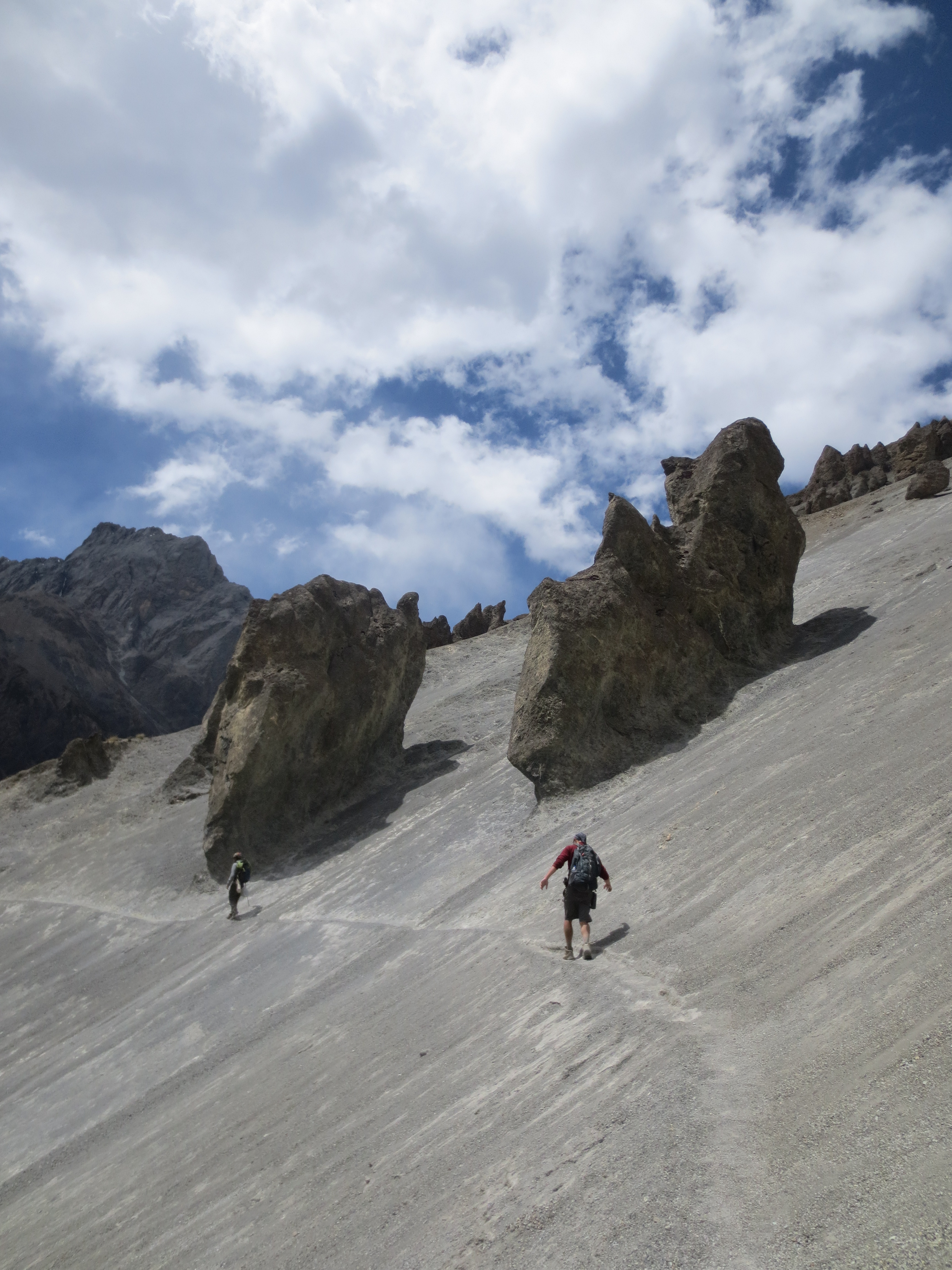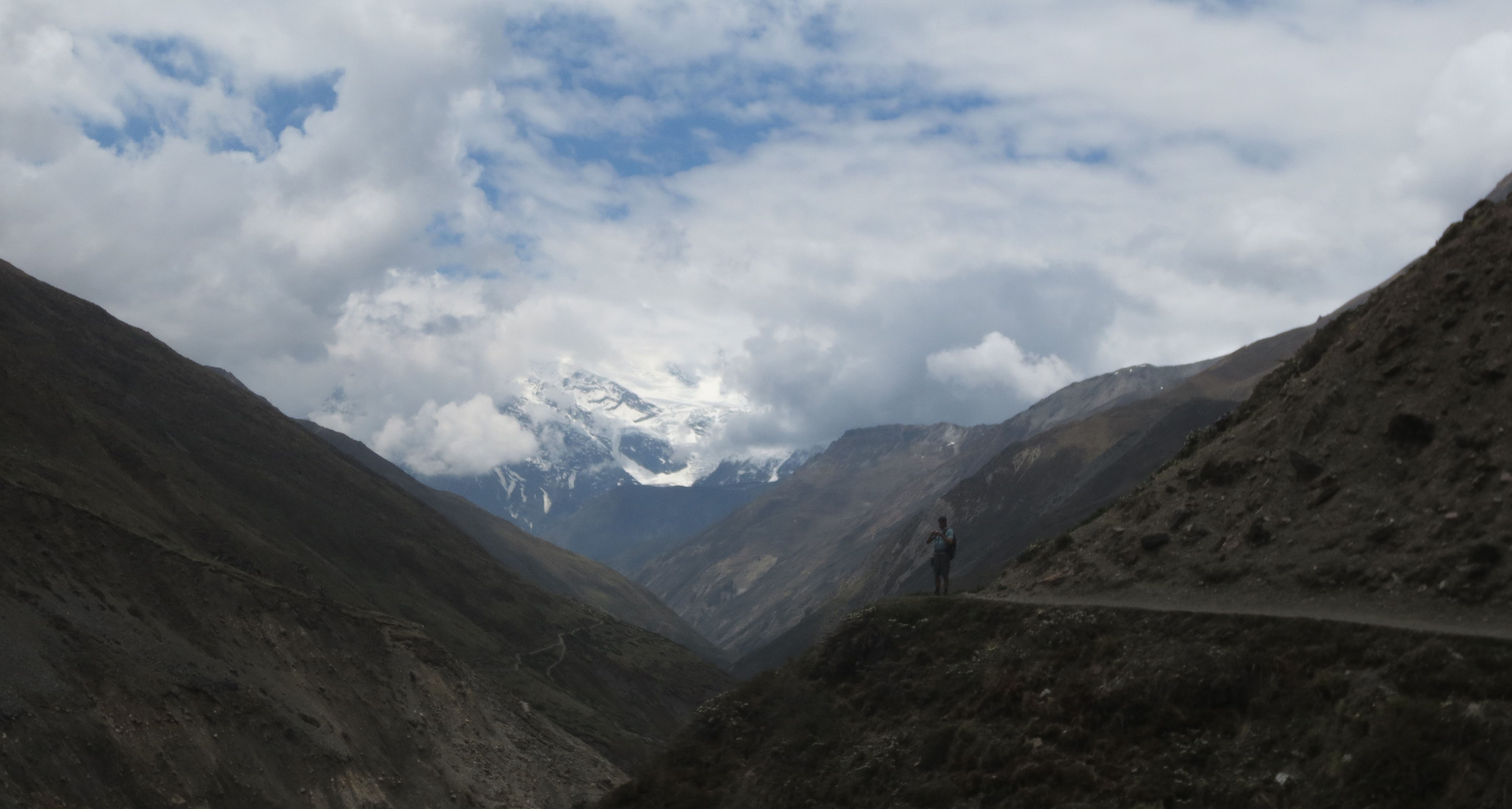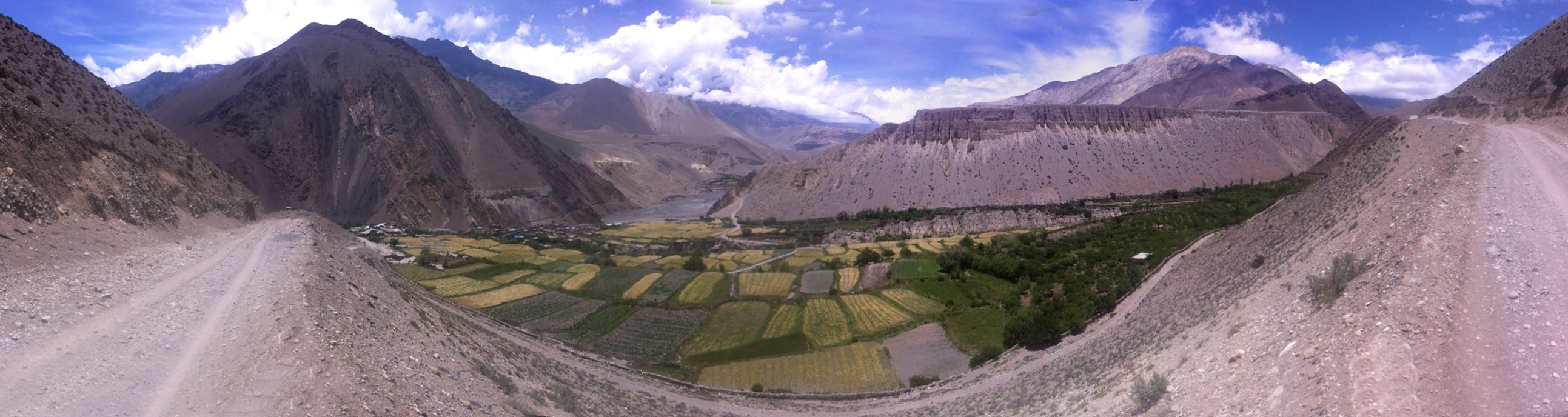 La première journée en fut une sans histoire. Nous avons marché 19km de village en village, sur une route de terre aussi empruntée par des jeeps (ils appellent cela des bus ici), le long d’une rivière serpentant au creux d’une vallée entourée d’immenses montagnes.