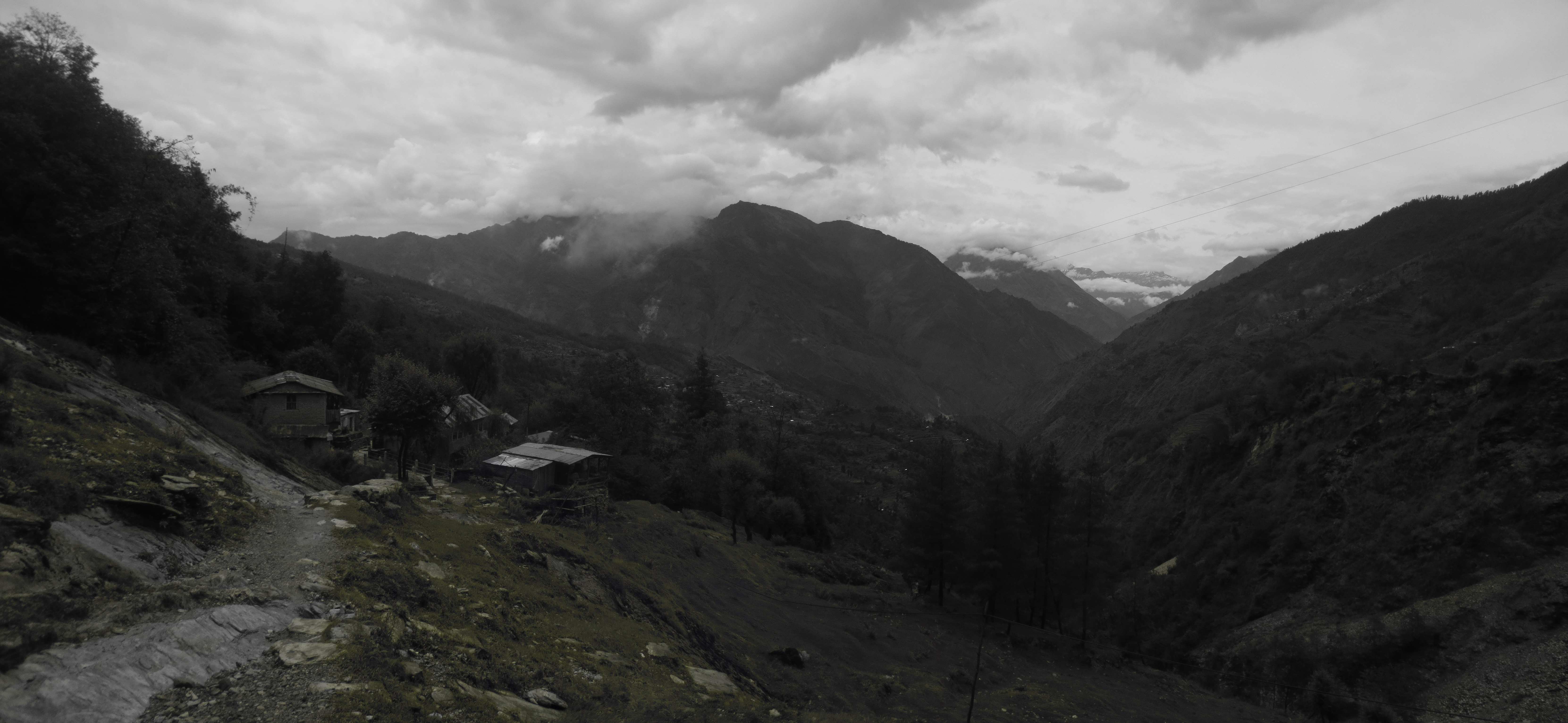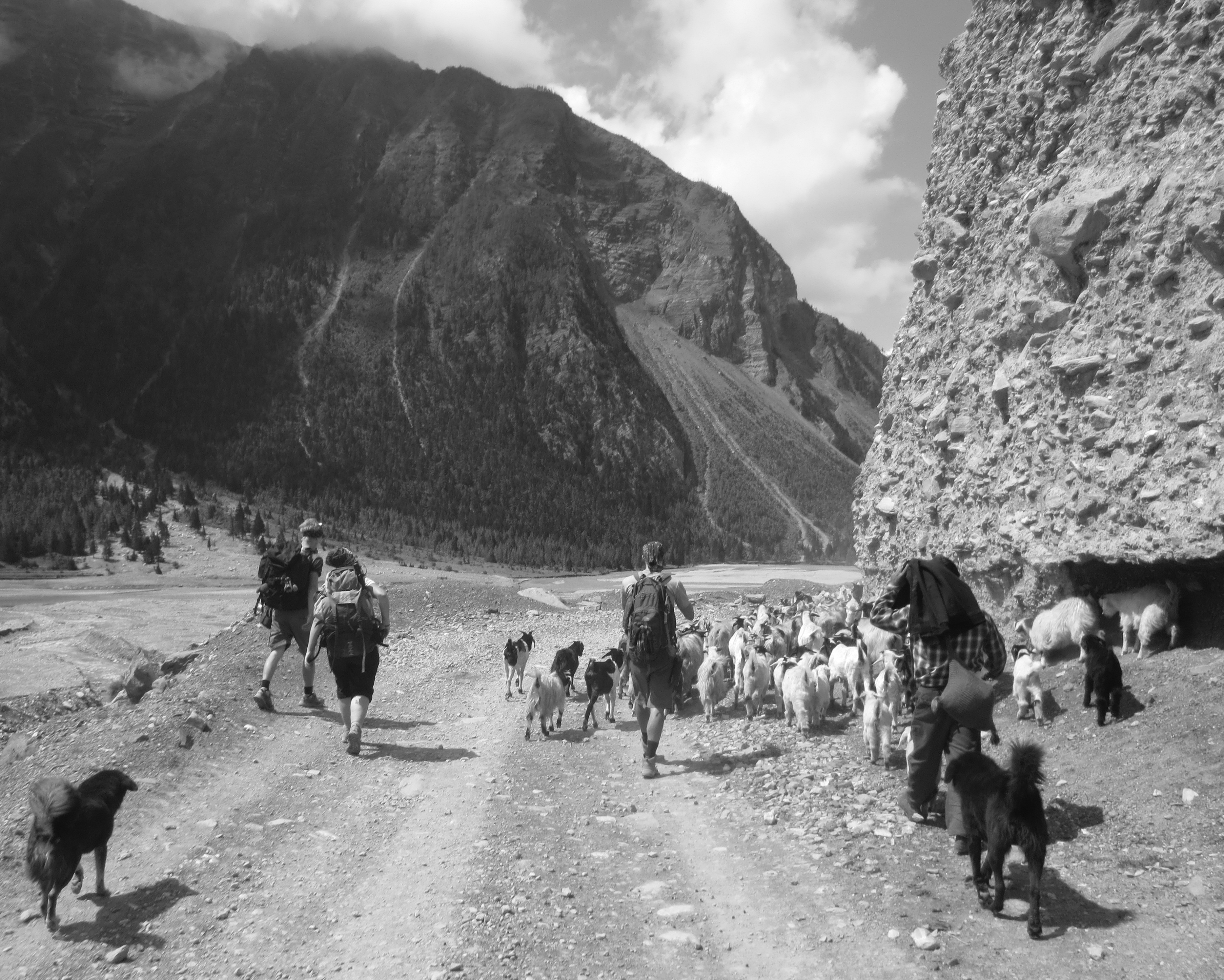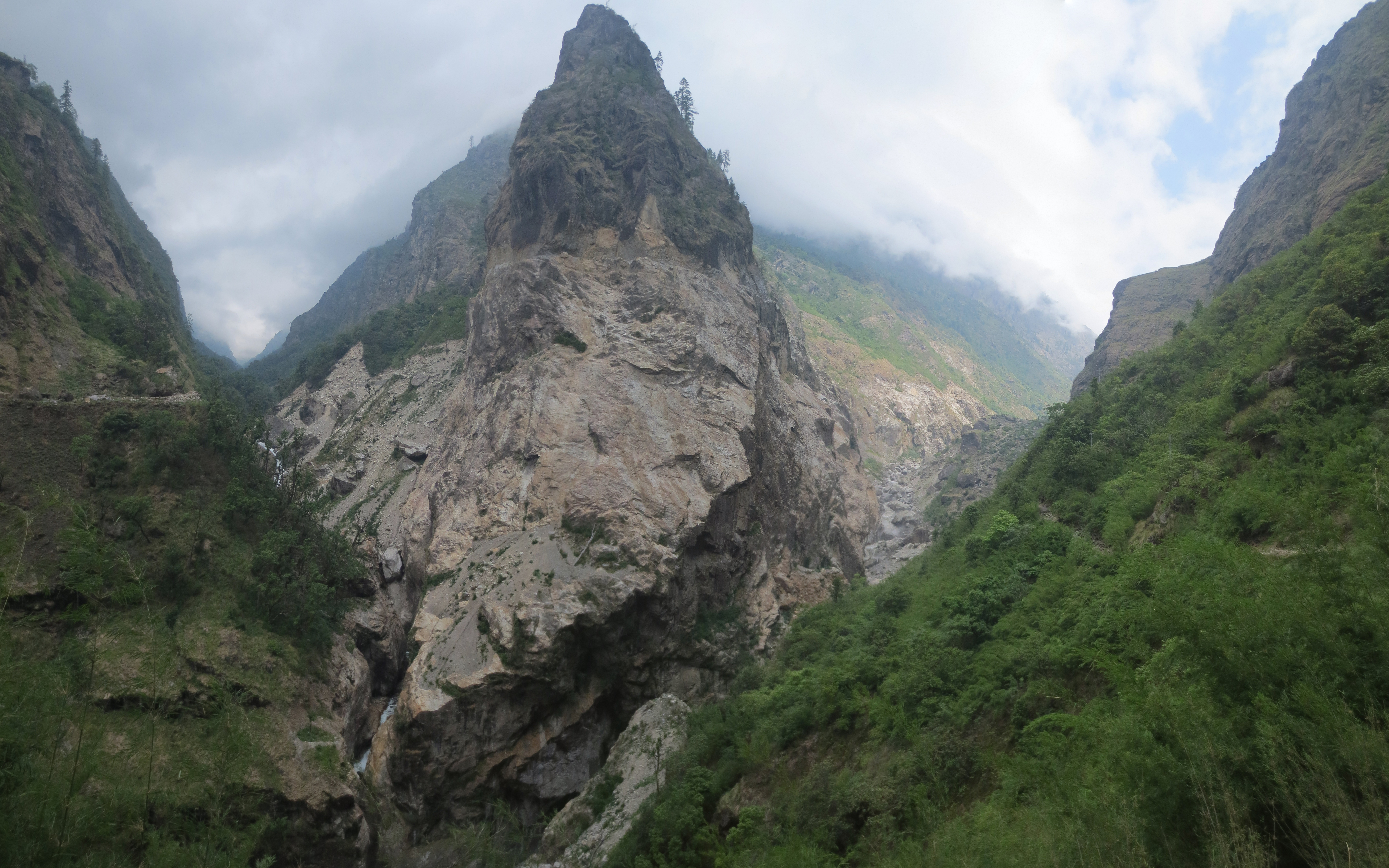 La première journée en fut une sans histoire. Nous avons marché 19km de village en village, sur une route de terre aussi empruntée par des jeeps (ils appellent cela des bus ici), le long d’une rivière serpentant au creux d’une vallée entourée d’immenses montagnes.