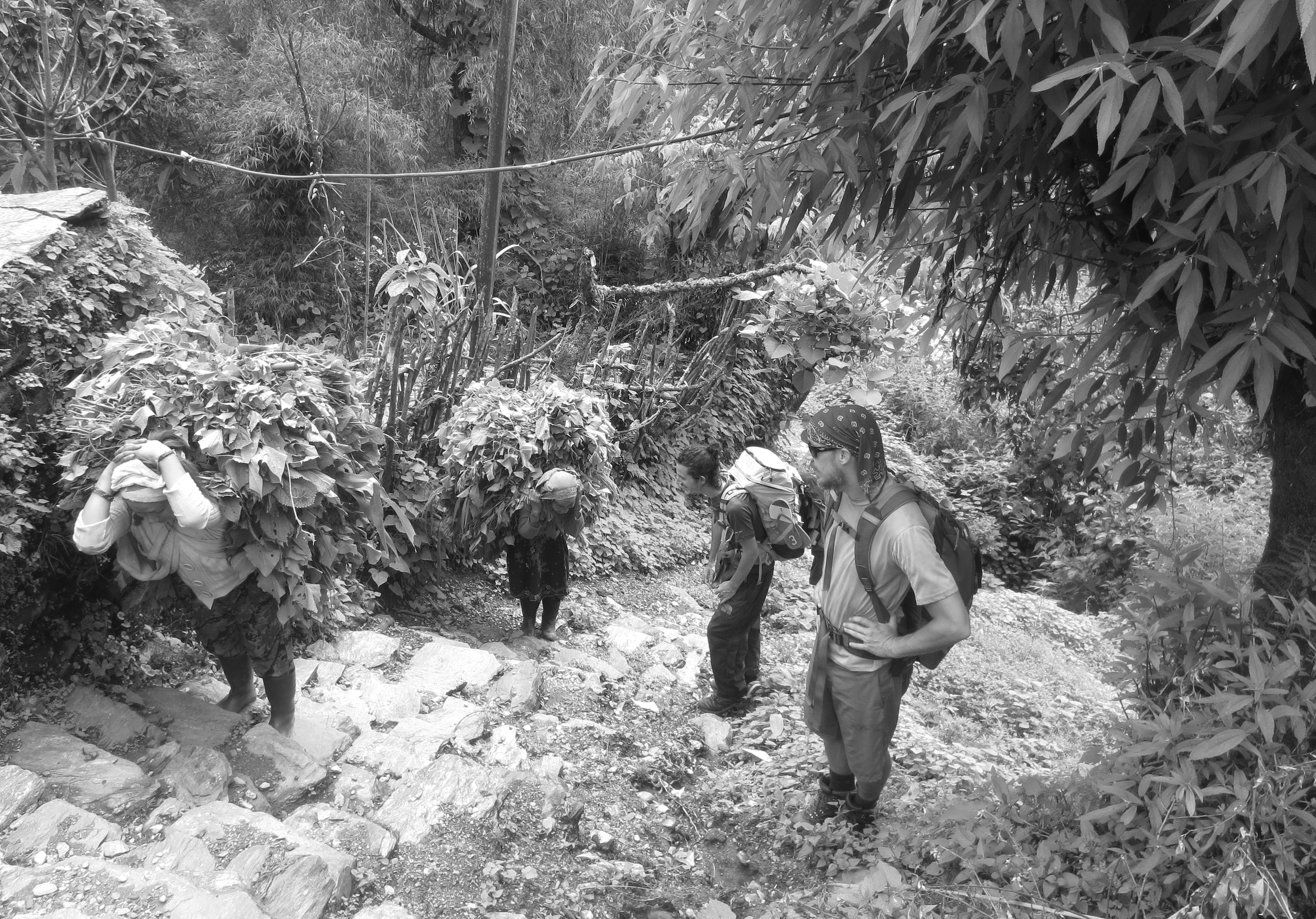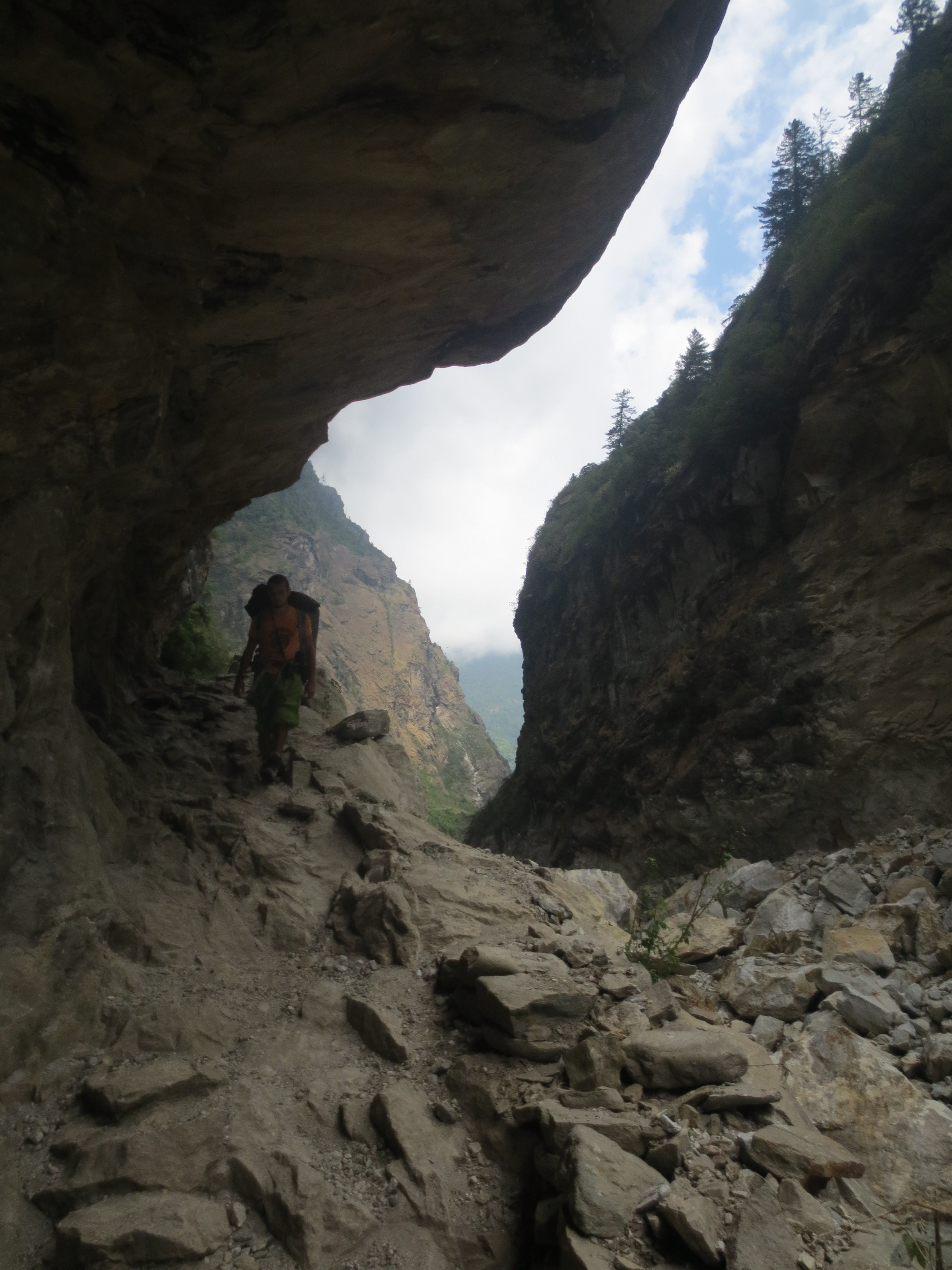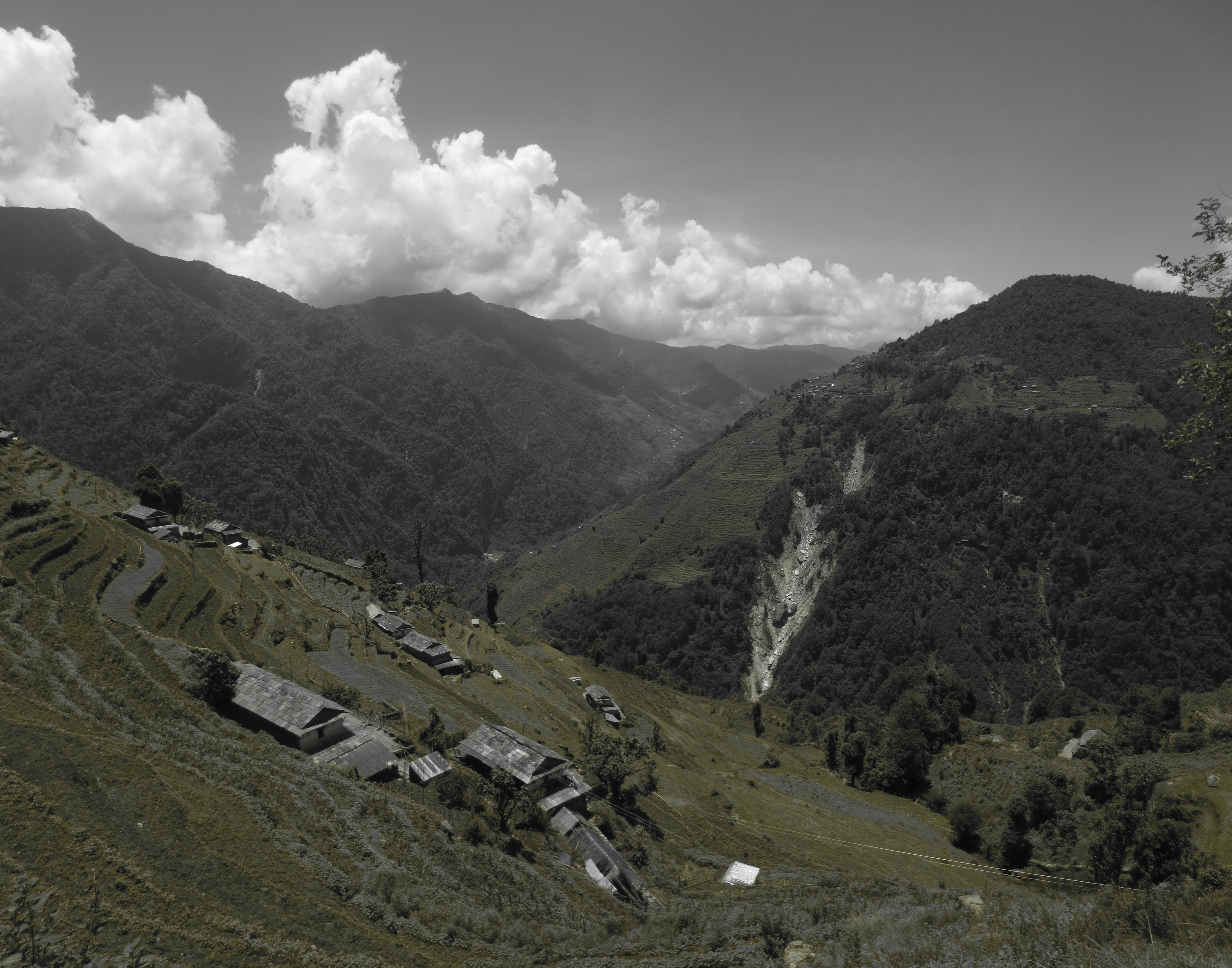 Vers la fin de la journée, un premier défi se présentait; monter jusqu’au village de Bahundanda, notre arrêt pour la nuit. Le meilleur moyen de vous décrire l’endroit est de vous imaginer une montagne de 300-400m de hauteur, disposée au milieu d’une vallée. Bien installé sur une petite crête à mi-hauteur en flanc de montagne, se trouve le village. Imaginez ensuite des maisons disposées sur le dessus de cette crête avec un petit sentier serpentant sur le bord d’un ravin pour les relier.