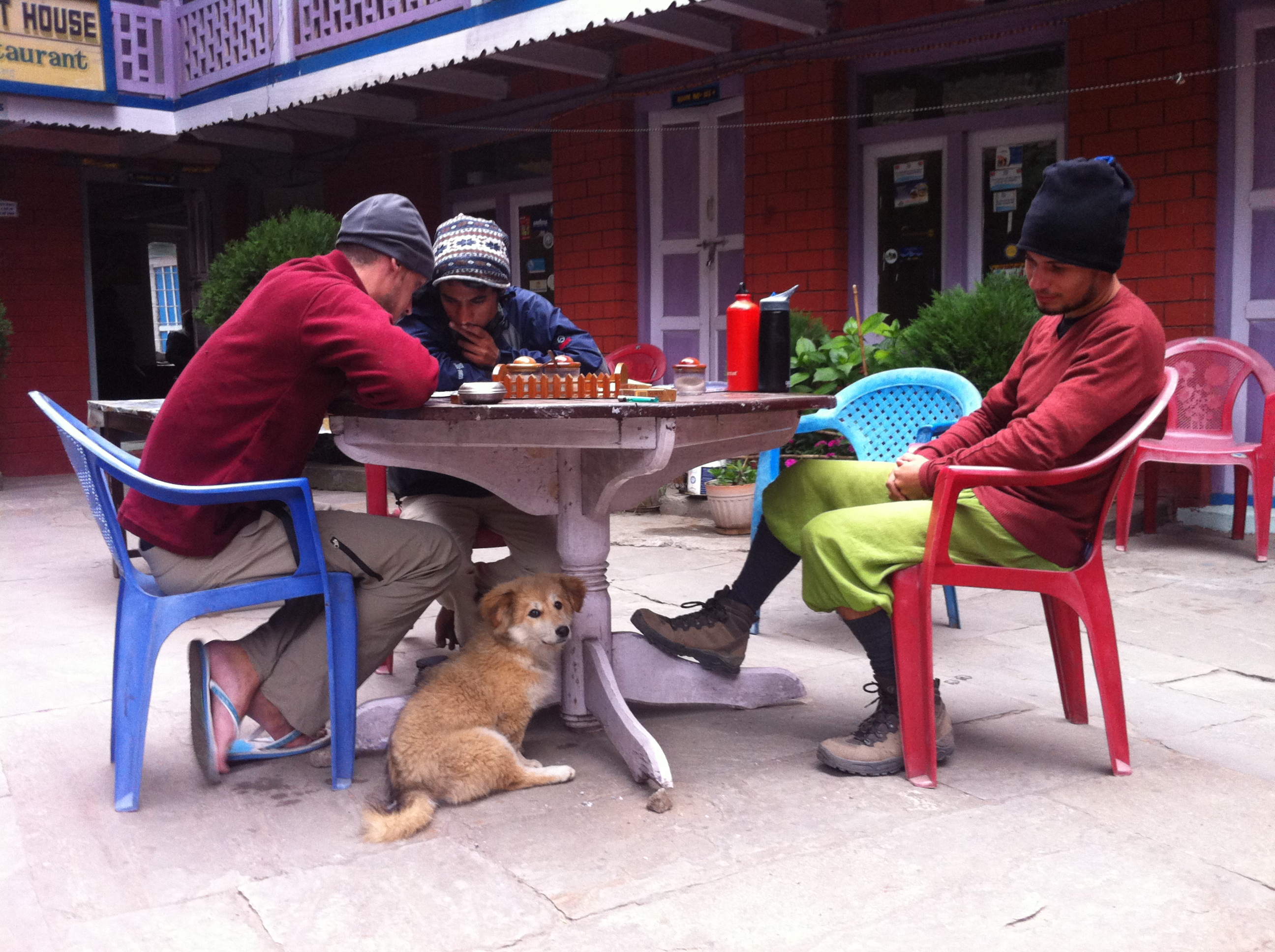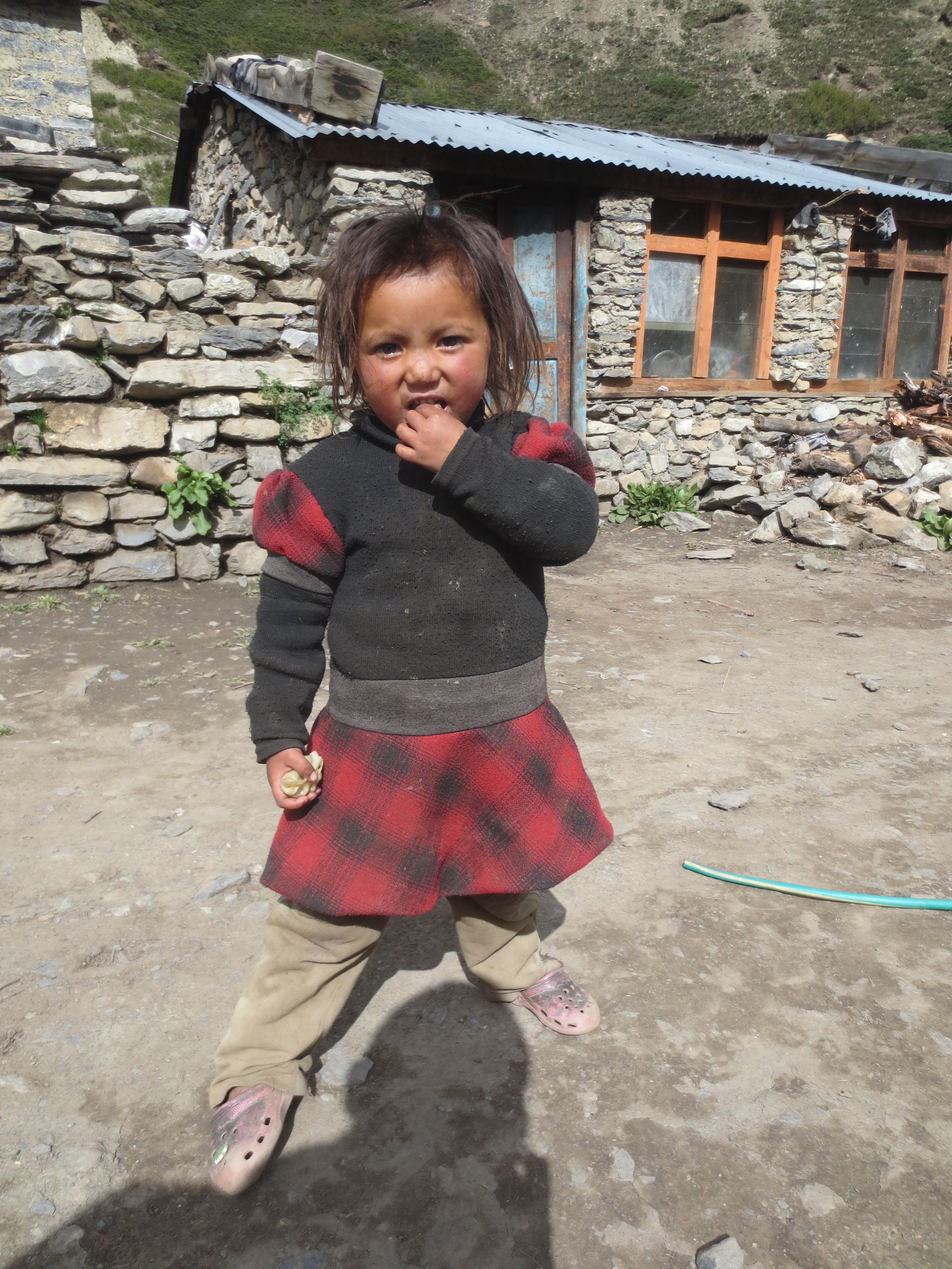 L’auberge que nous avons finalement choisie (parce que presque tous les proprios nous attendaient dans le square (parc) au milieu du village) est tenue par un jeune couple de népalais HYPER sympathique. Je me suis même fait une nouvelle petite amie à la minute où je suis arrivé à l’auberge; la très jeune fille du couple n’arrêtait pas de grimper sur moi comme si j’étais une montagne. Si elle avait 20 ans de plus (elle doit en avoir 5), je l’aurais demandée en mariage sur le champ.