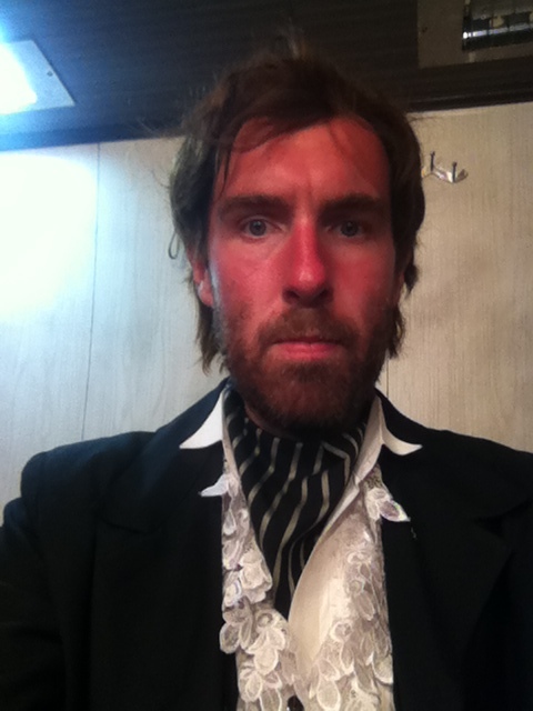 C’était ensuite l’heure de m’habiller. Au menu; 1 paire de bottes de cuir trop petites, 1 pantalon d’époque assez cool, une chemise blanche à froufrou sur le col et les manches, un espèce de foulard de bandit allant dans mon V neck, un jacket noir, un veston noir et une ceinture rouge. Ils ont aussi essayé de me faire porter un chapeau de conquistador, mais heureusement il ne fittait pas. Ahhh… et j’allais presque oublier; une vrai épée dans son fourreau fixée à ma taille.