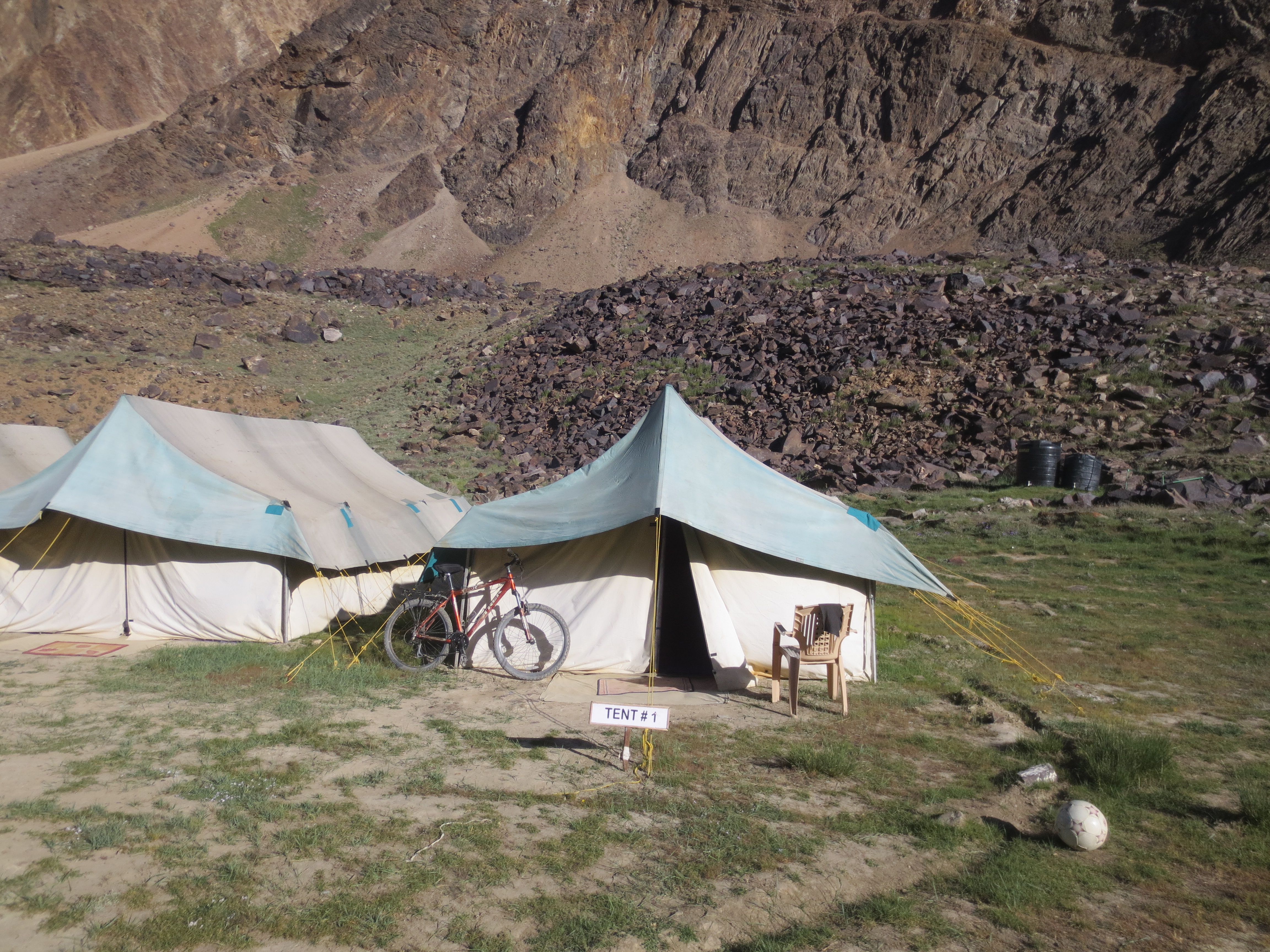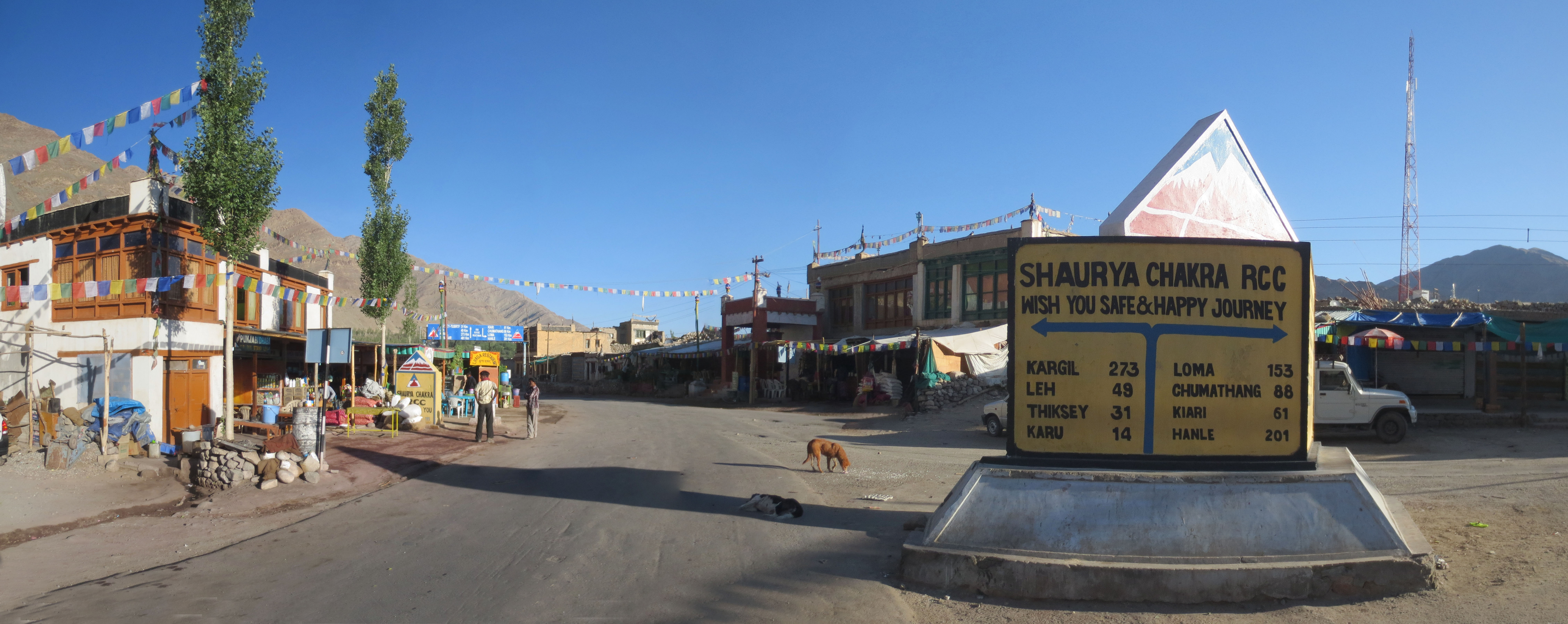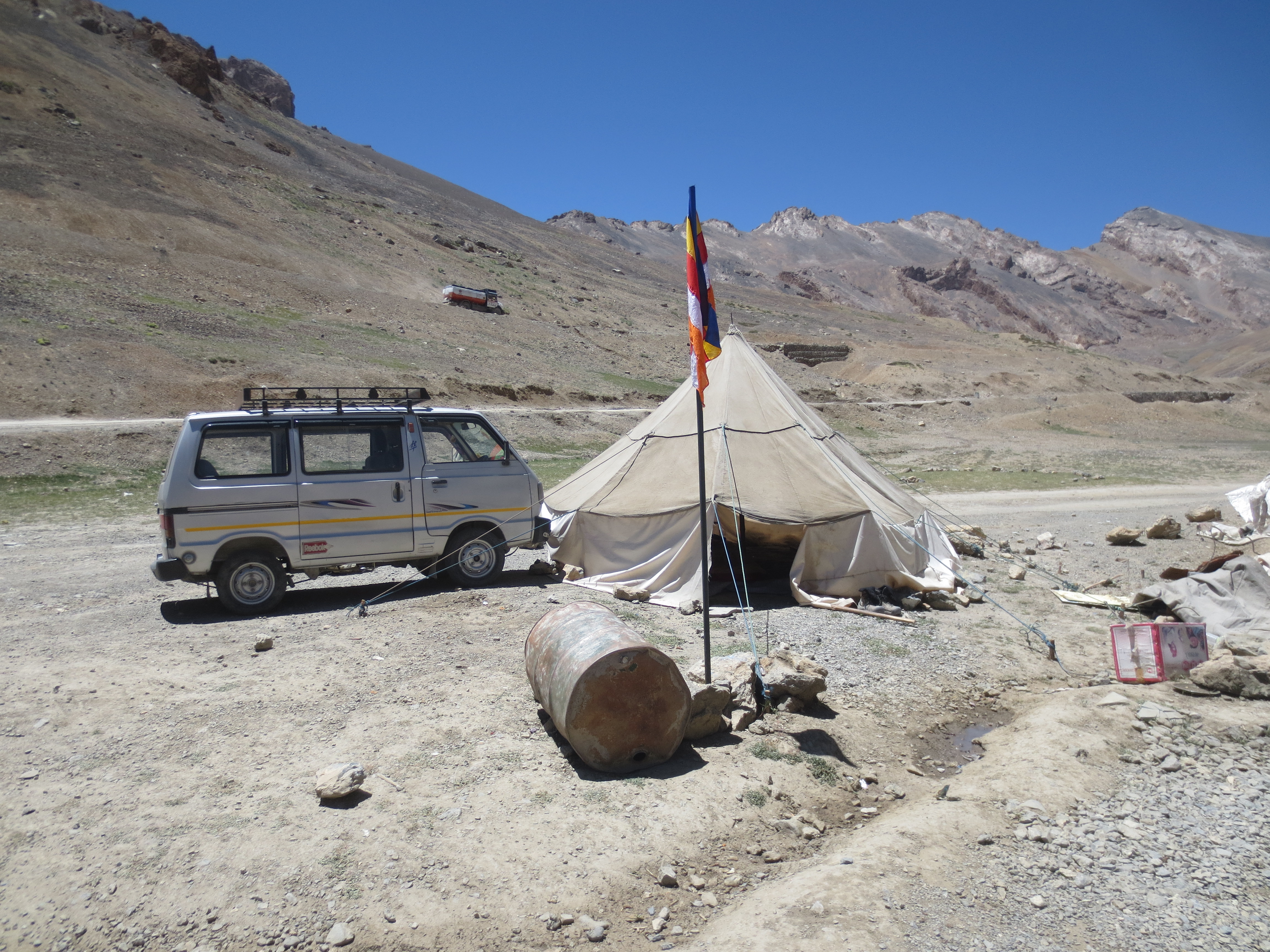 Le trajet a consisté en une descente TOUT LE LONG jusqu’à Tangtse. Moi et Jaume n’y comprenions rien. Lors de notre trajet de bus d’hier, nous avions l’impression que la route allait monter toute la journée. On a plutôt descendu pendant plus de 30km non stop de Pangong à Tangtse, dernier endroit offrant de l’hébergement avant l’ascension jusqu’à la ChangLa Pass 40km plus haut. Pas que nous étions déçu, au contraire, mais bon…