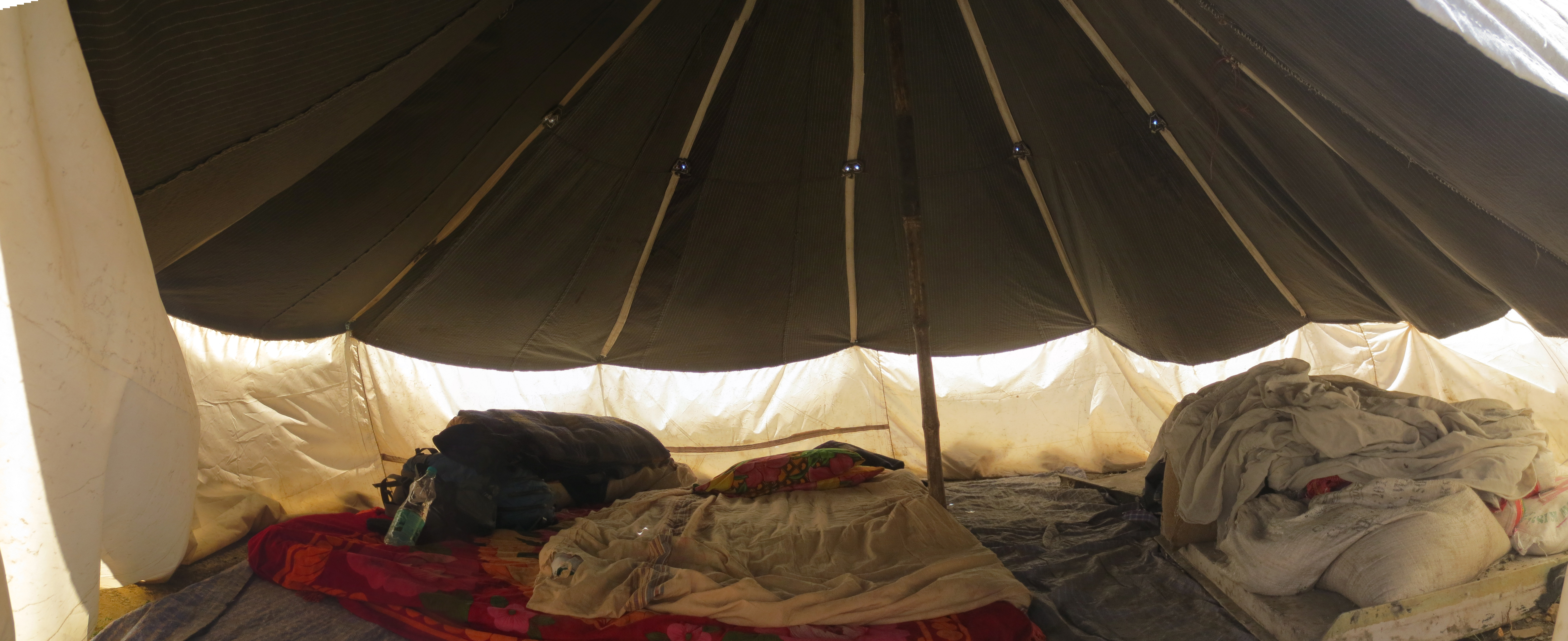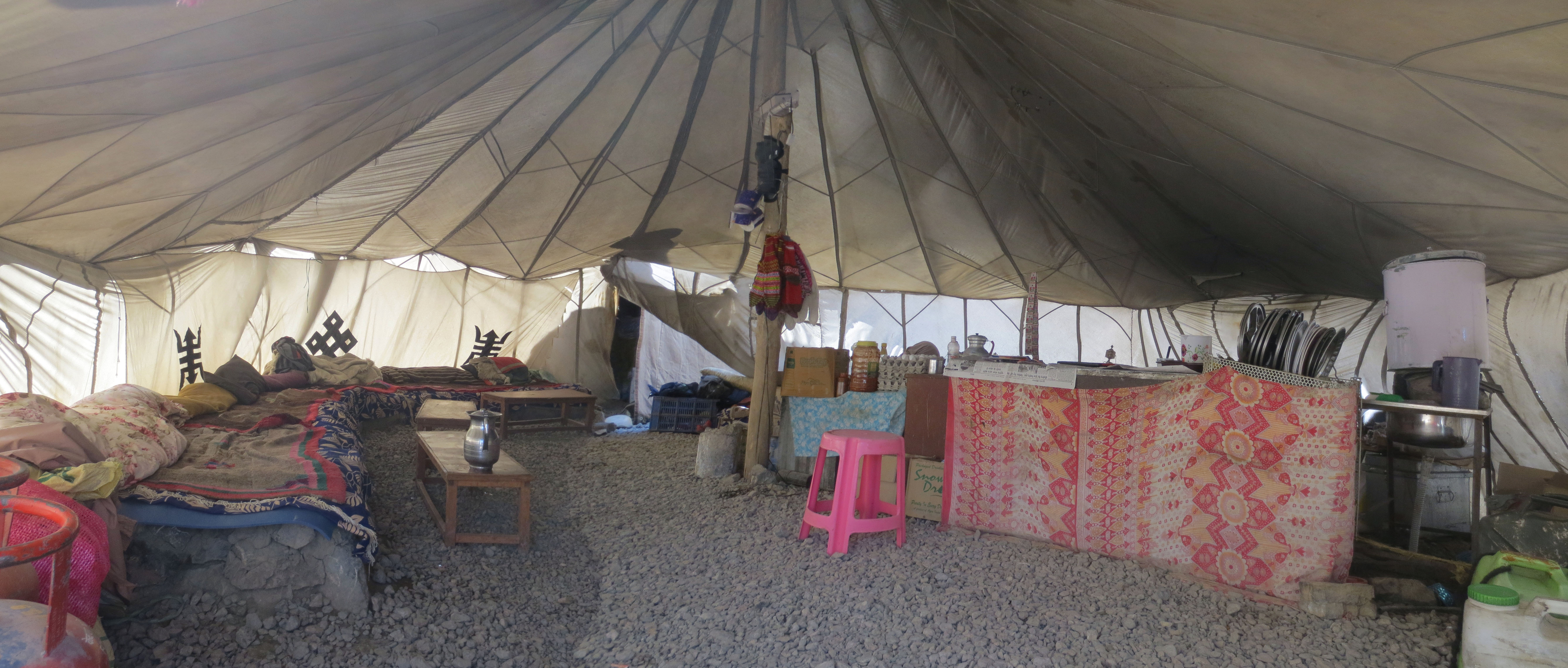 Le bus continuait à aller de plus en plus loin, tout en descendant encore, encore et encore. Le lac n’était toujours pas en vue. J’ai alors commencé à paniquer et à douter fortement que nous soyons capables de rejoindre le sommet du col dès demain comme prévu. Ne m’étant pas impliqué dans la planification du trip jusque là, j’ai entrepris de calculer le nombre de kilomètre à faire pour rejoindre le col à partir de Spangmik, notre point de départ. Le décompte non officiel atteignait 80km… tout en montée. J’ai alors proposé à mon gentil conquistador de séparer l’ascension en 2 journées en s’arrêtant dans un village où nous avions vu des hébergements en passant plus tôt. Il m’a alors regardé avec un espèce de regard de soulagement en acquiesçant à mon idée.
