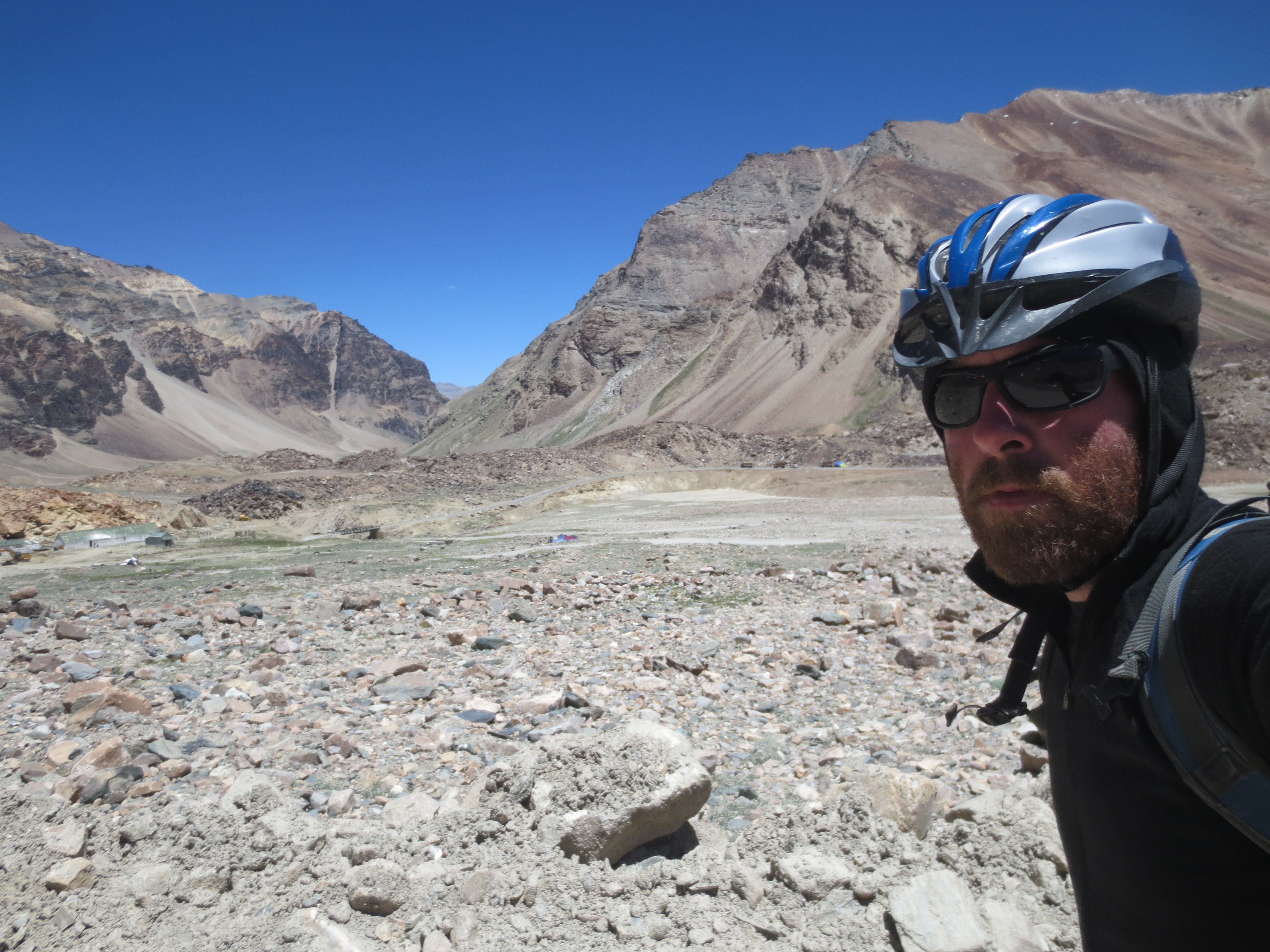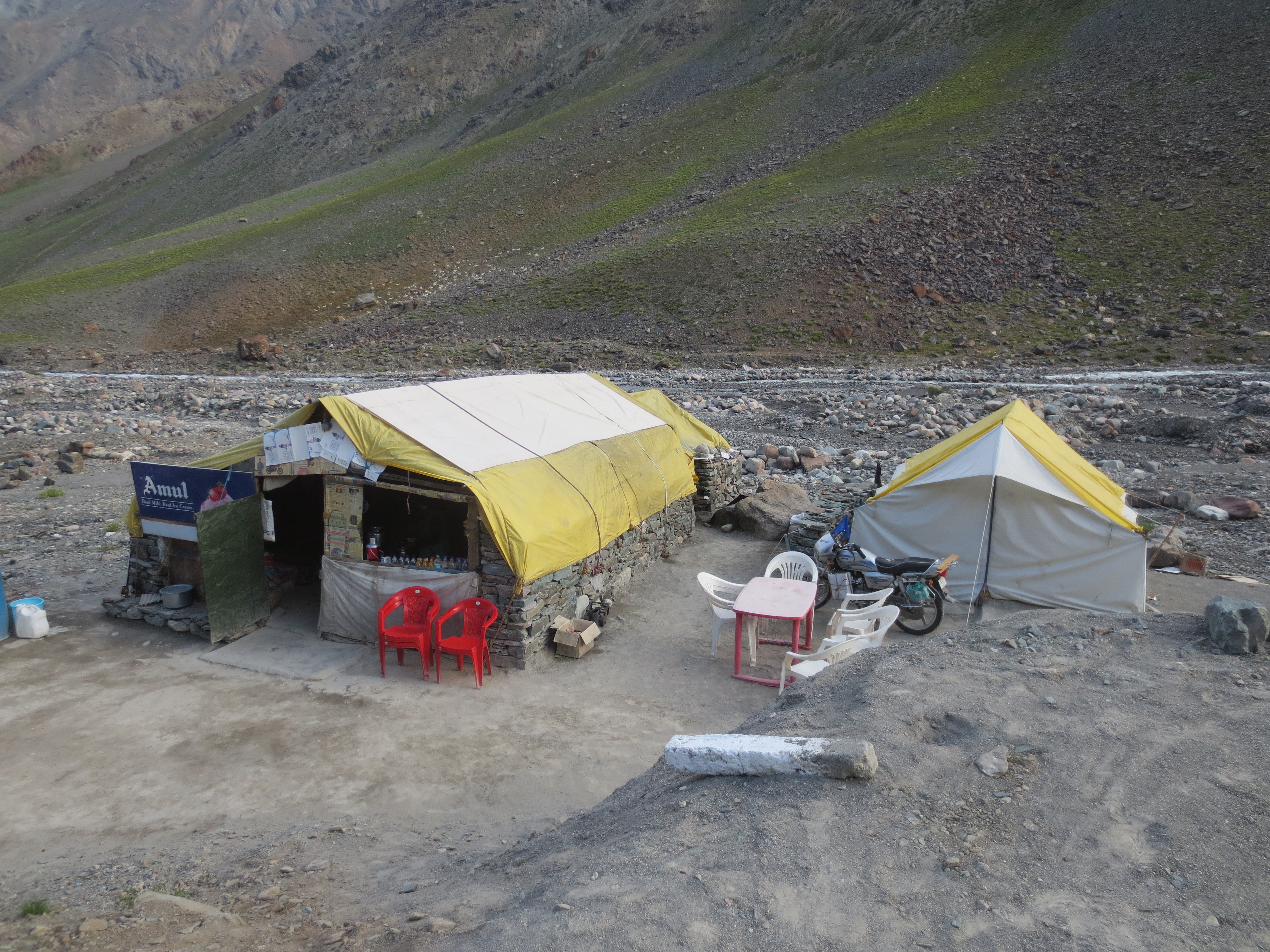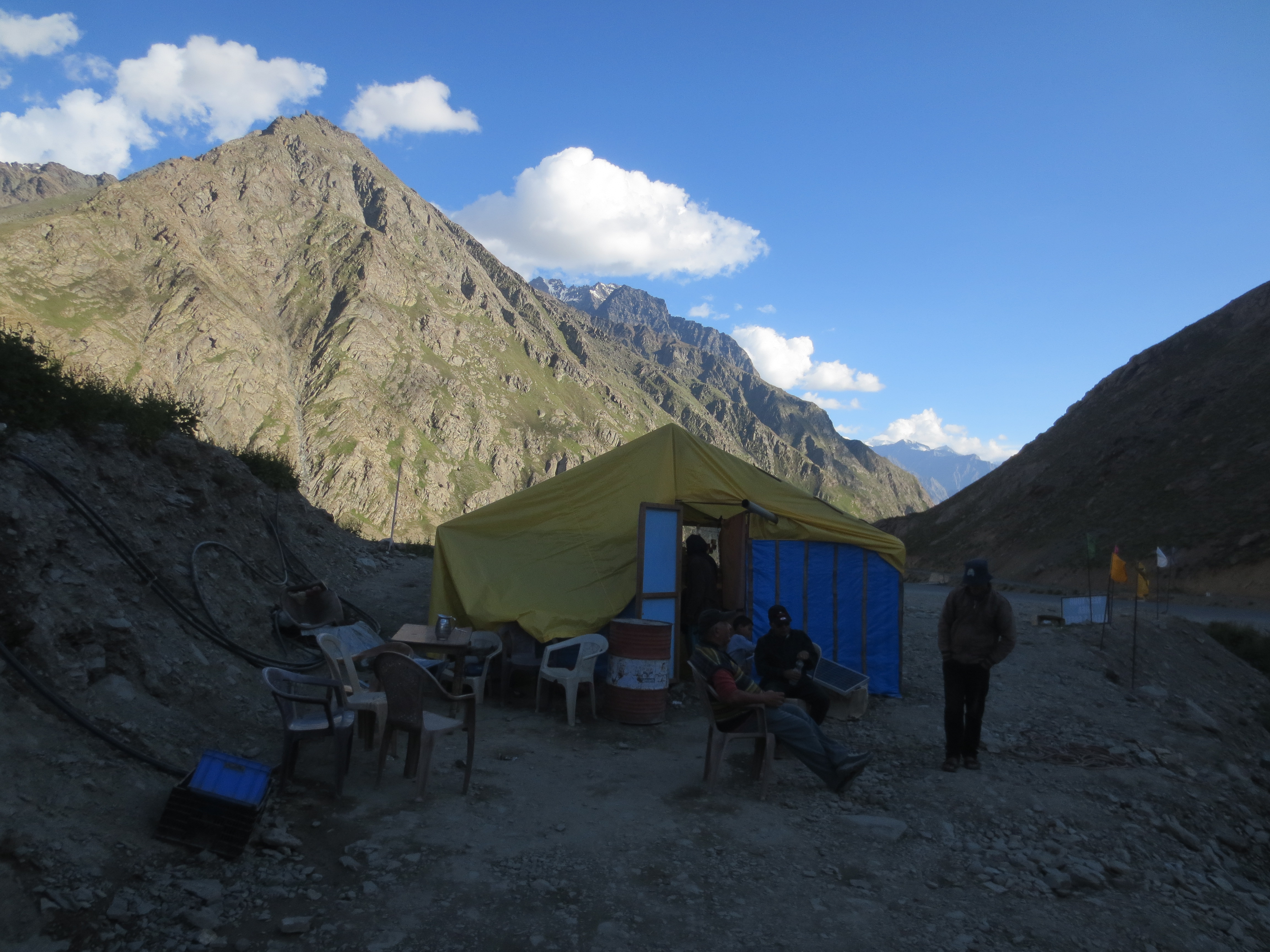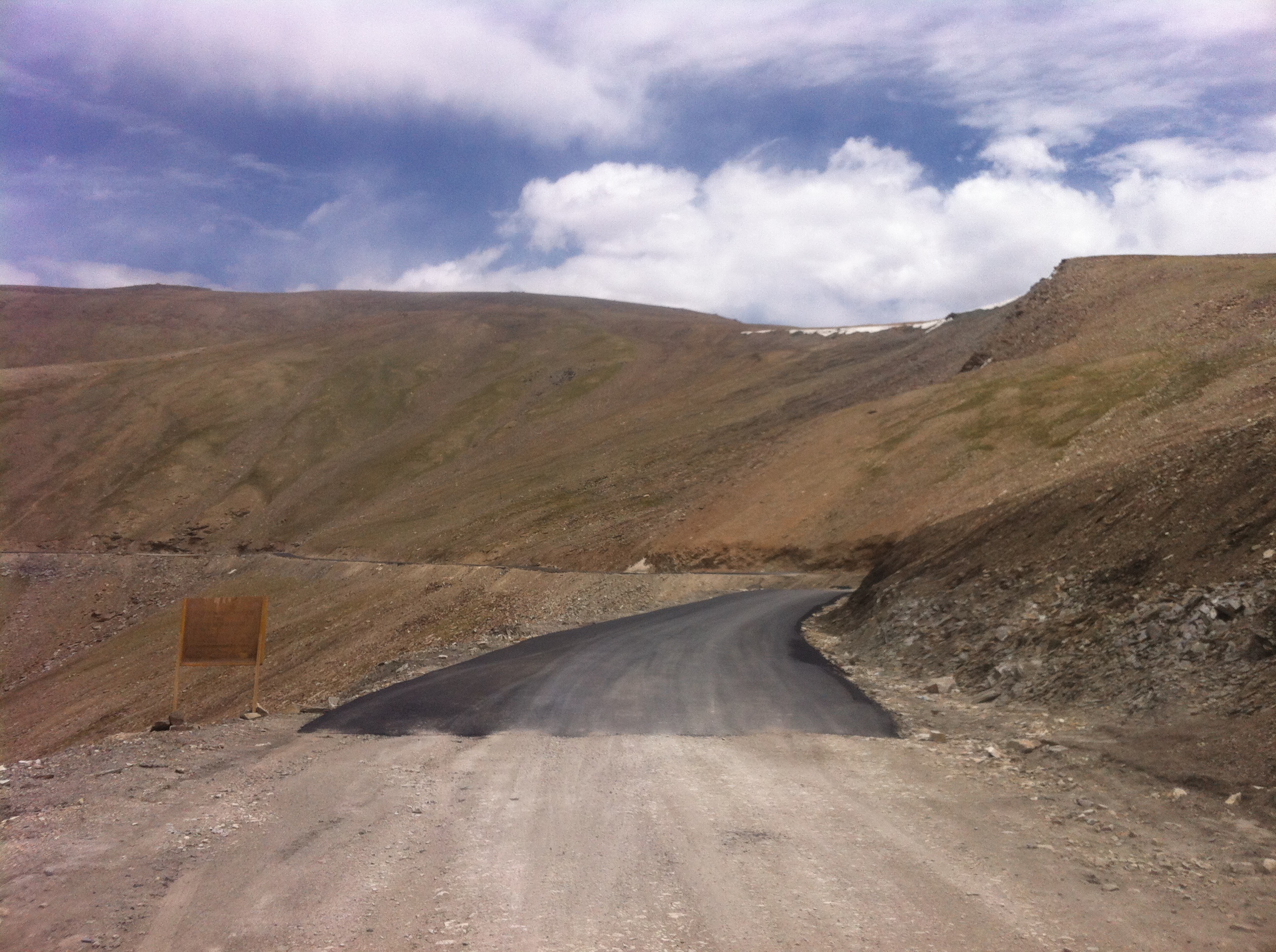 Une fois au sommet, quelle ne fut pas notre surprise de trouver plein de bâtiments; une cafétéria, etc. C’est la première fois que je vois cela sur le dessus d’un col où la neige peut se pointer à tout moment et où il fait un froid de canard. Bref, très inusité, mais un problème de moins pour nous demain puisque nous pensions devoir apporter avec nous de la nourriture pour effectuer l’ascension et la descente du col (plus de 80km).