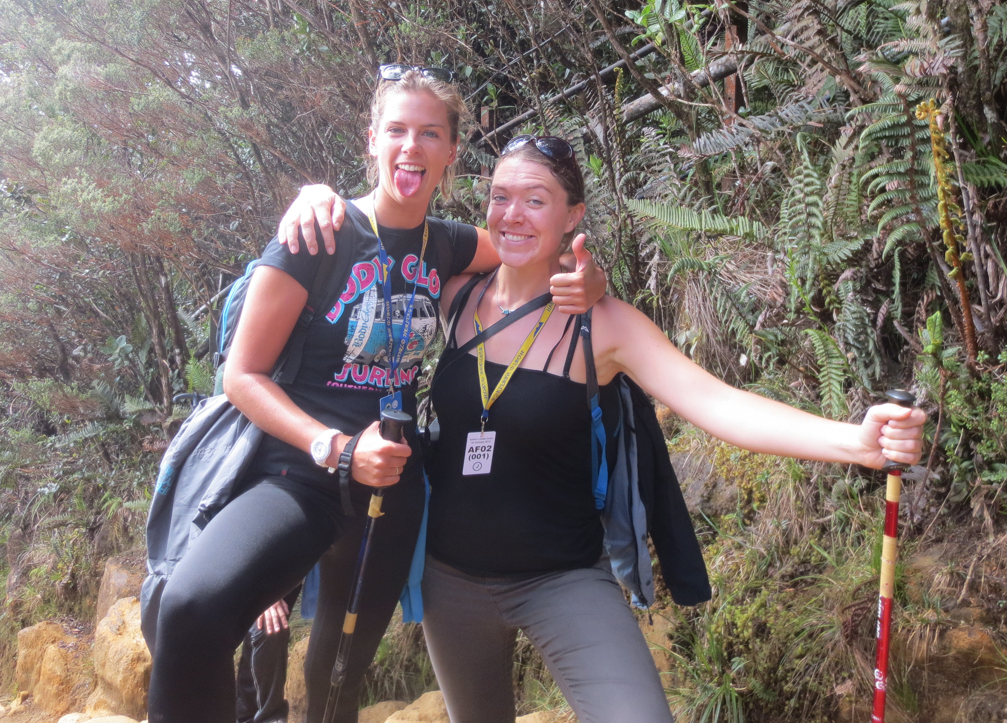 À mi-chemin de la descente, j’ai croisé Sarah et Anja qui montaient jusqu’à Laban Rata pour y passer la nuit. Quand je les ai vues, je me suis littéralement effondré. Elles ont donc pris le temps qu’il fallait pour me remonter le moral, Sarah tentant même de relâcher mes points de pression… ou quelque chose comme cela… truc de yoga chose machin. Je tiens donc à les remercier puisqu’elles ont été d’un très grand support moral.