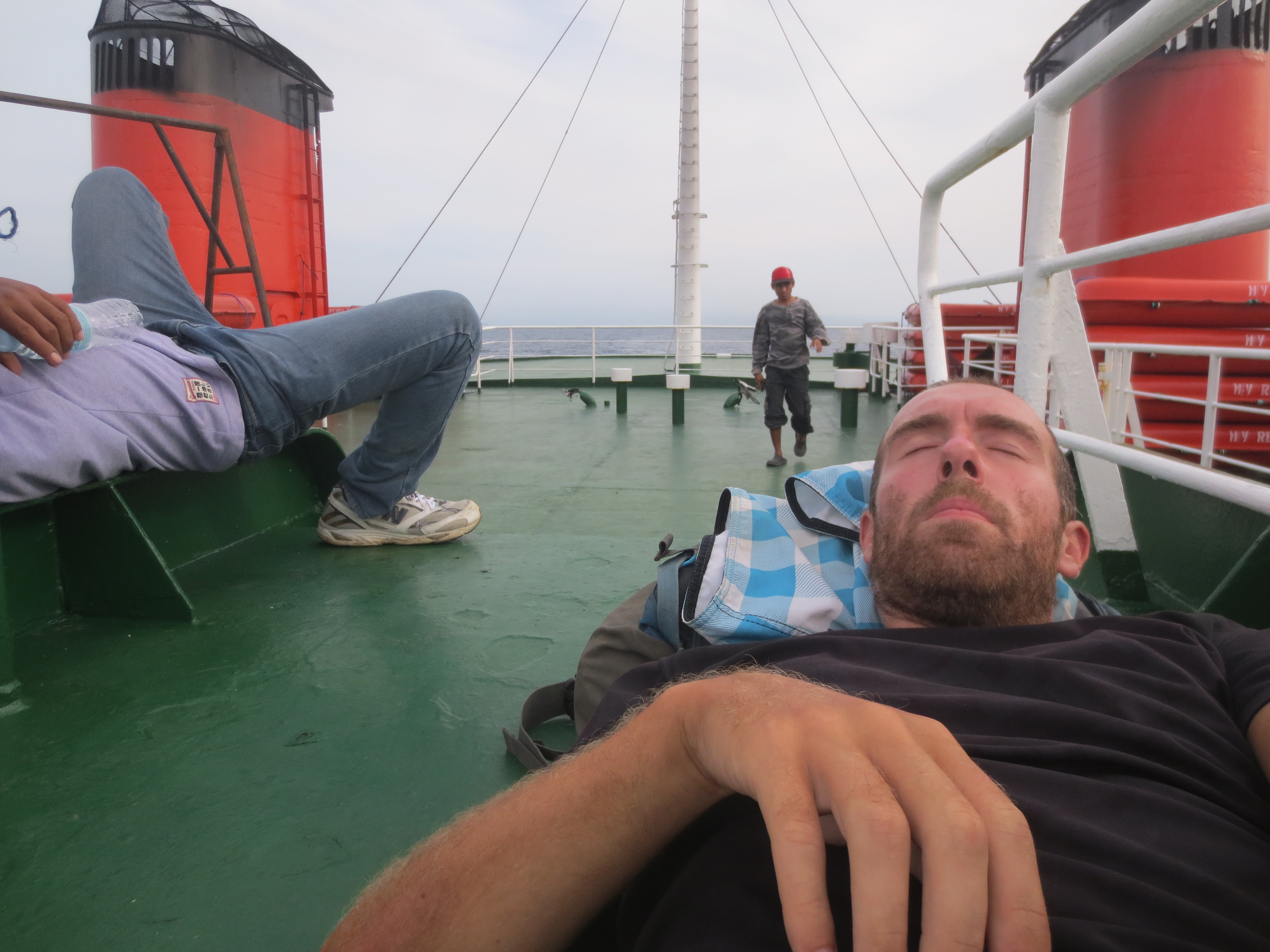 Dormir sur le dessus d’un immense paquebot pendant plus de 4h; Check. Que demander de mieux que de se faire bercer par les vagues et écouter un bruit de moteur s’apparentant beaucoup plus à une sécheuse qu’à un bateau…