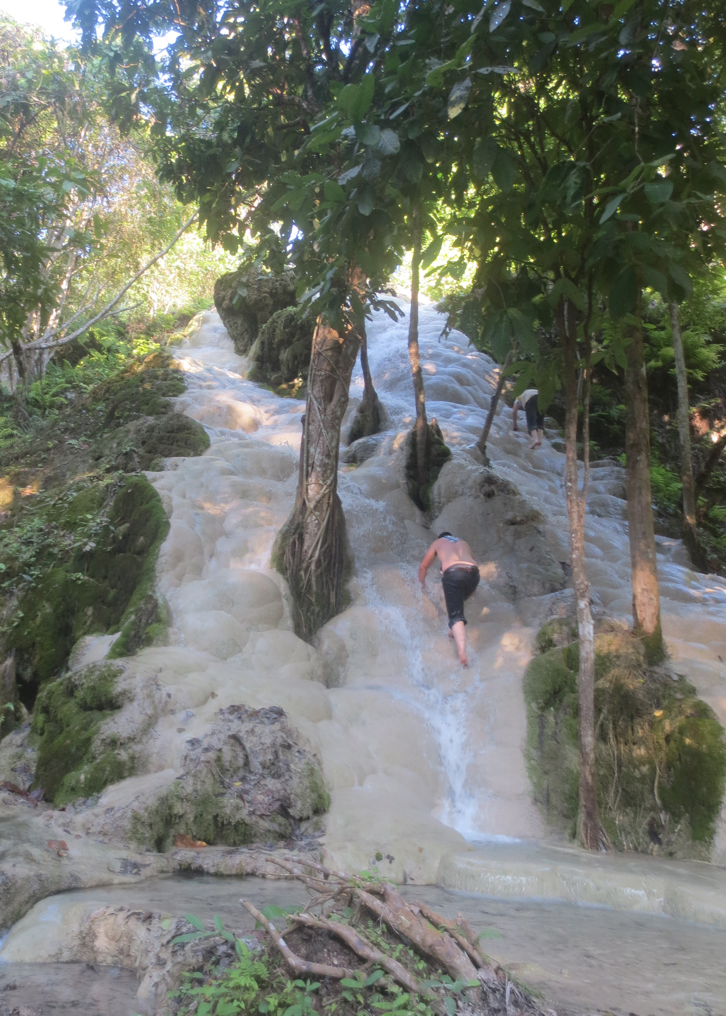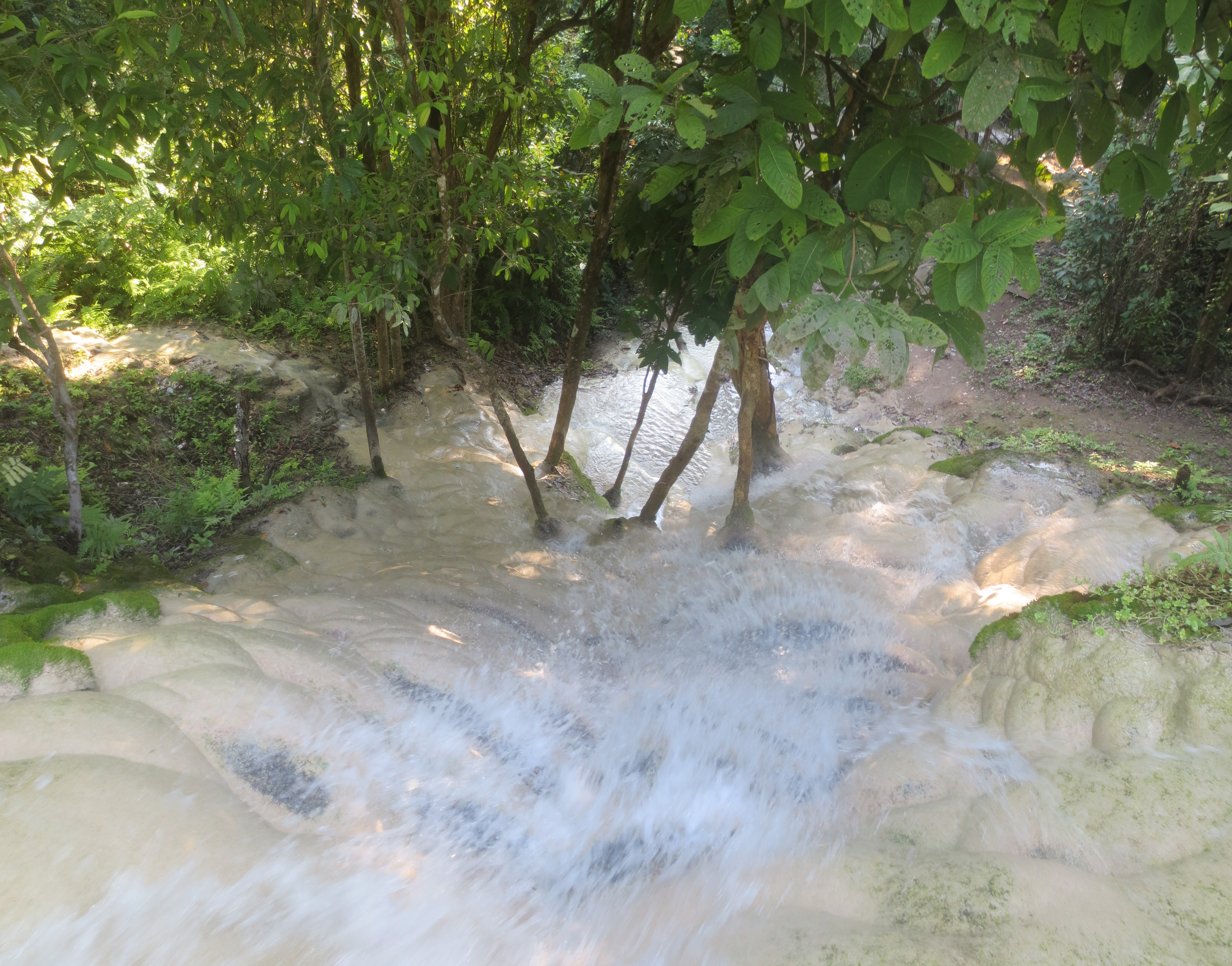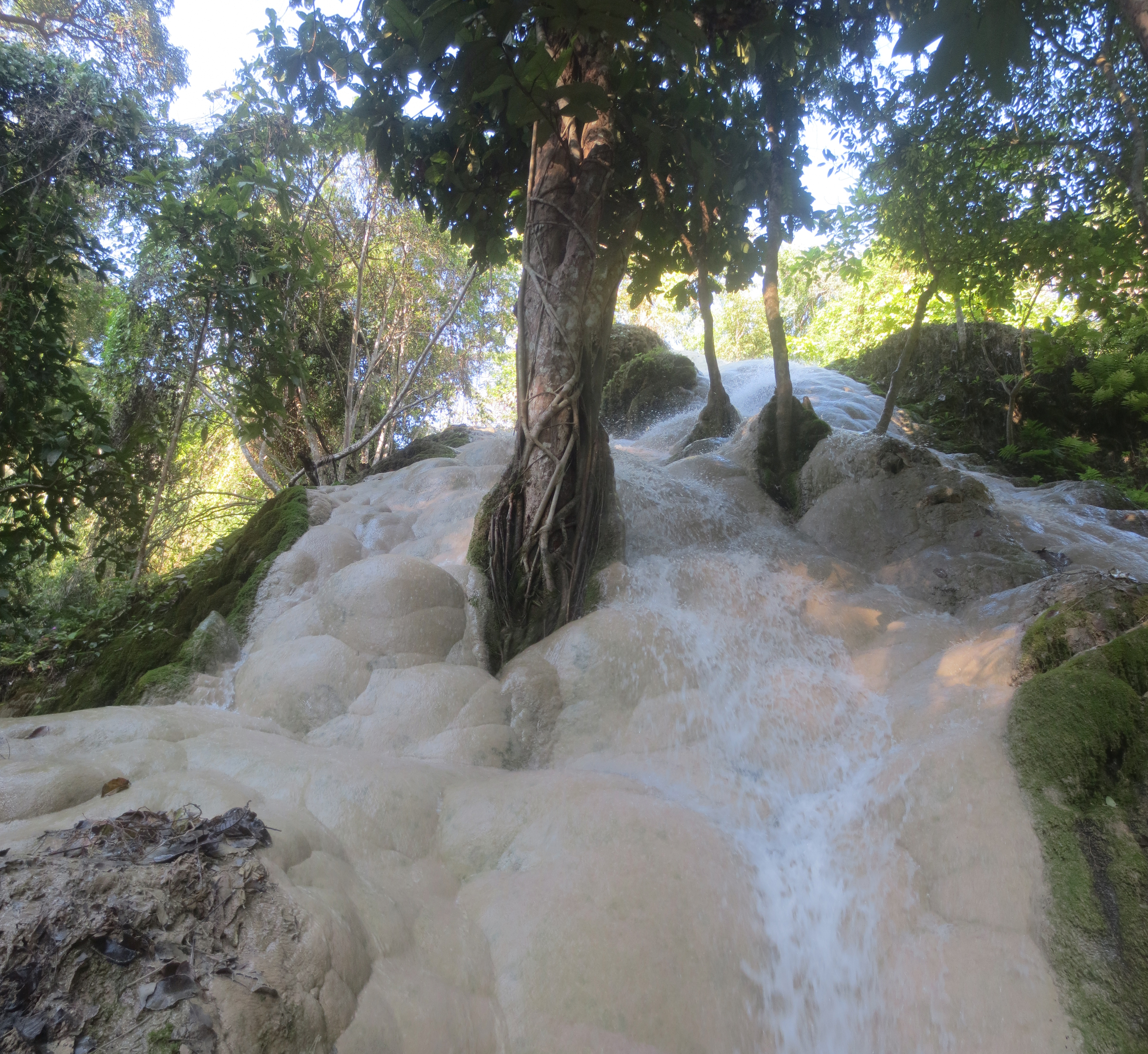 D’un blanc quasi immaculé, la surface rocheuse de la chute est très rugueuse… comme dans TRÈS rugueuse… ce qui permet de s’y agripper les pieds et les mains sans problème et ce, même si l’eau dévale à pleine vitesse. Vous pouvez donc marcher (monter/descendre) sans problème DANS la chute… expérience unique. Dame Nature devait être complètement saoule quand elle a imaginé cet endroit.