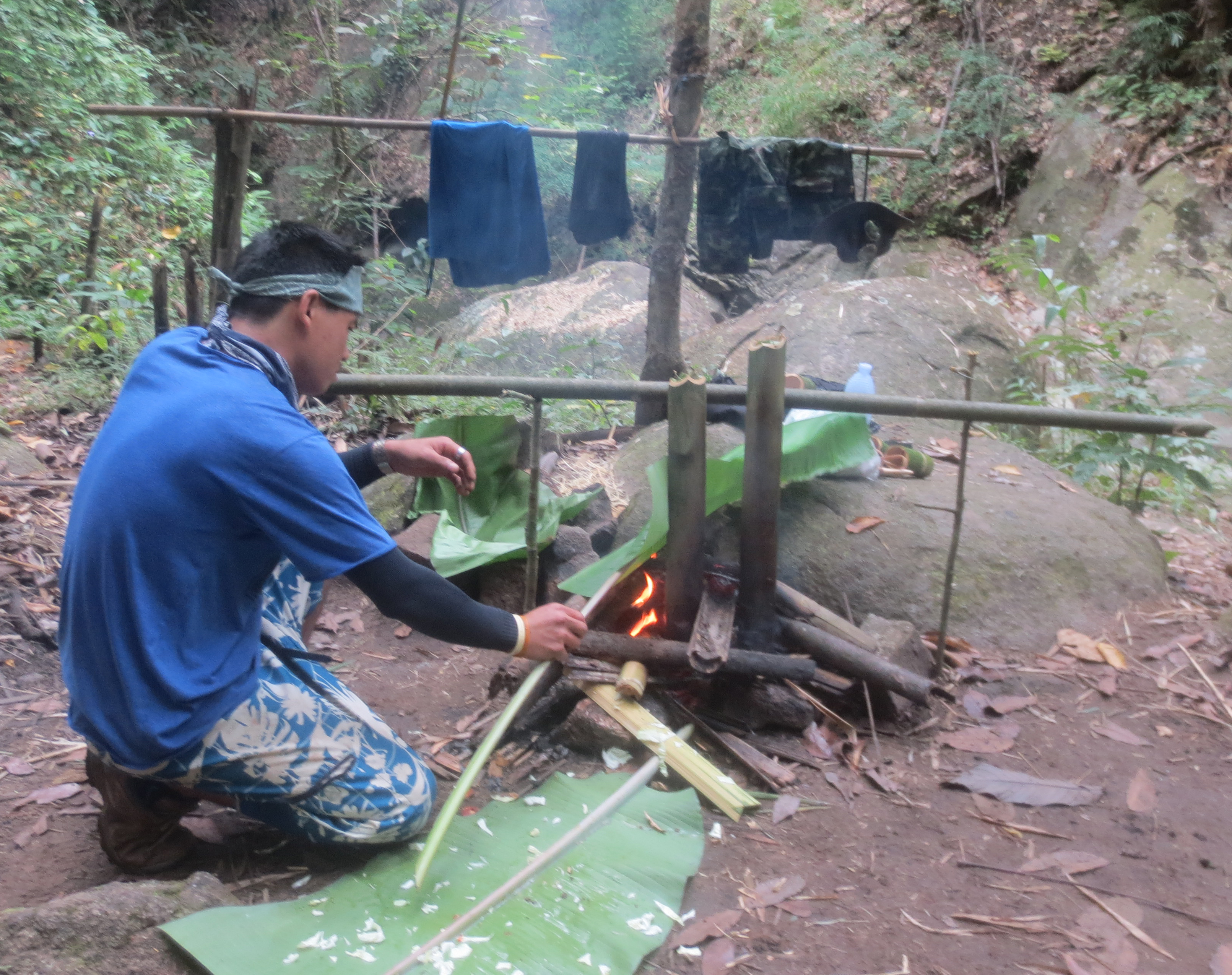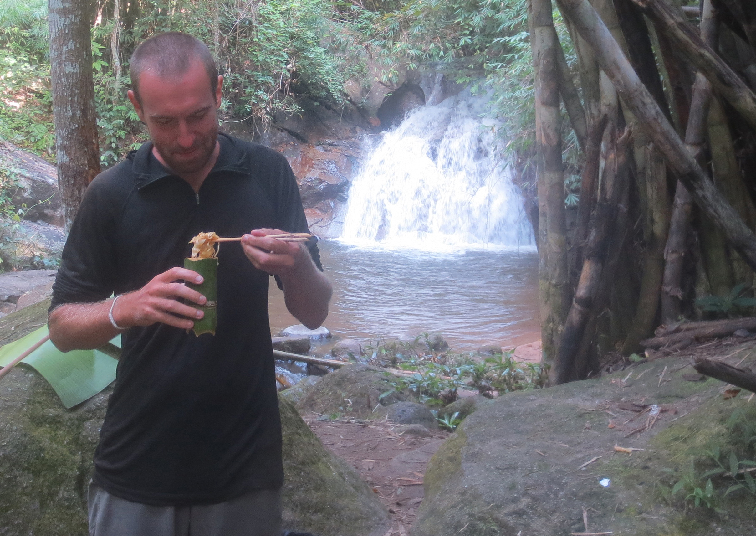 Pour le lunch, le guide nous avait préparé une petite surprise; il a commencé à travailler des tiges de bambou pour nous fabriquer des ustensiles (baguettes), des plats (feuille de bananier) et des tiges de bambou en guise de verre. Il allait ensuite préparer le lunch avec les produits que l’on trouvait dans la jungle (éviter les bananes… elles ne sont pas comestibles dans la jungle) et le faire cuire dans des tiges de bambou sur le feu. Quand le bambou passait du vert au noir, cela voulait dire que la nourriture était prête.