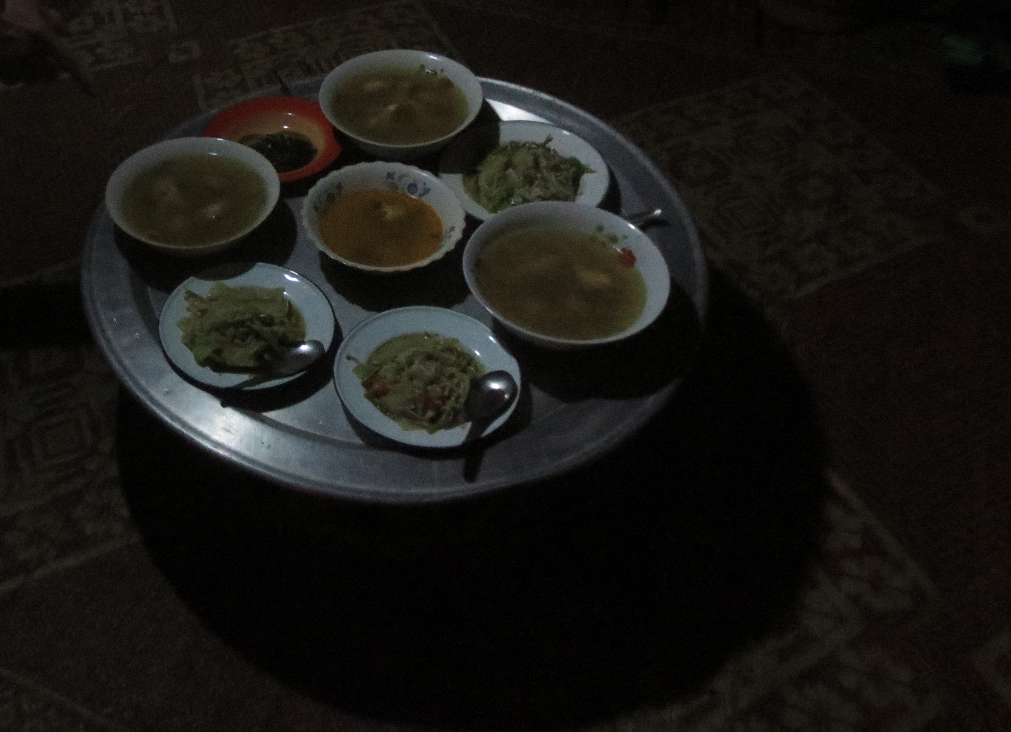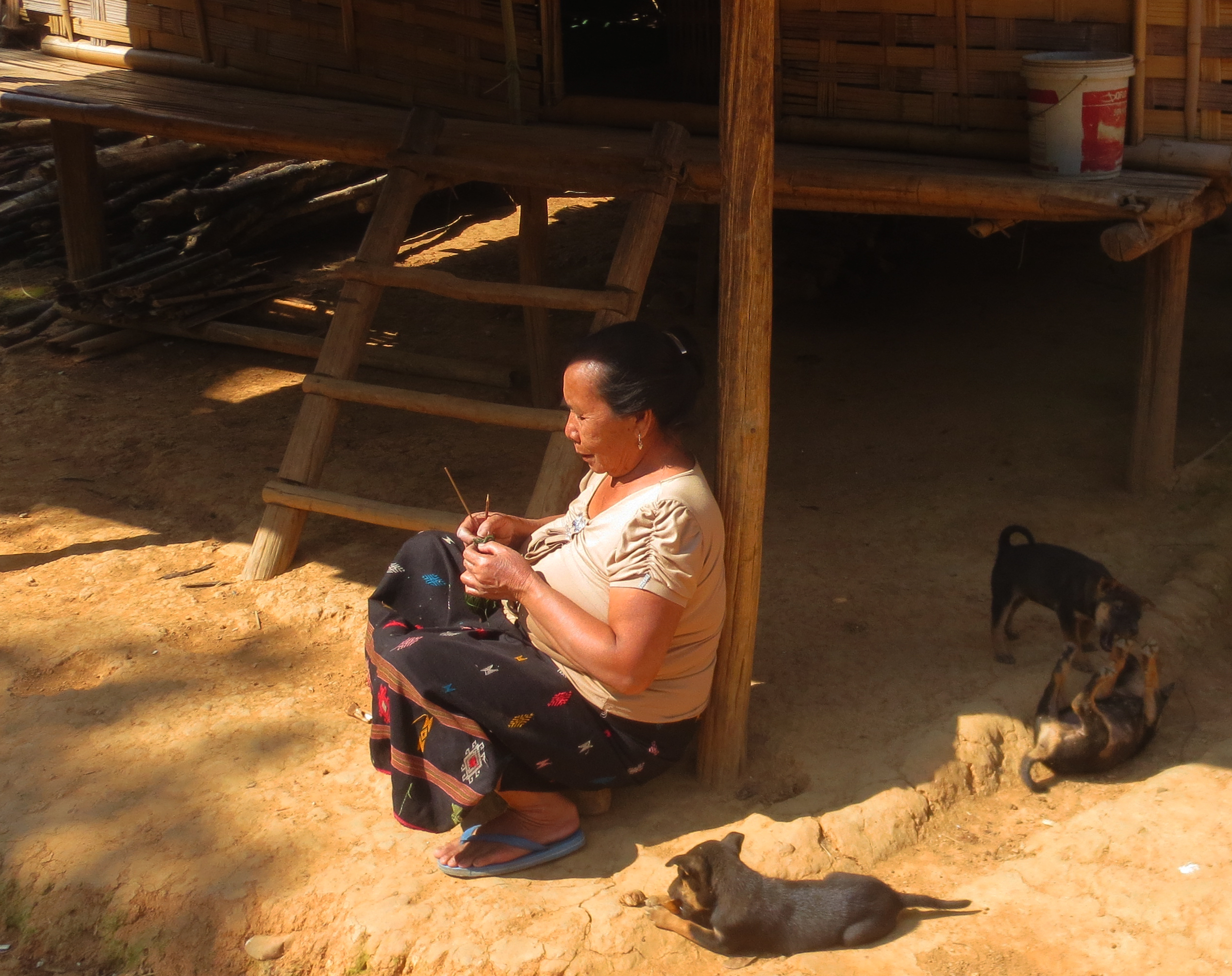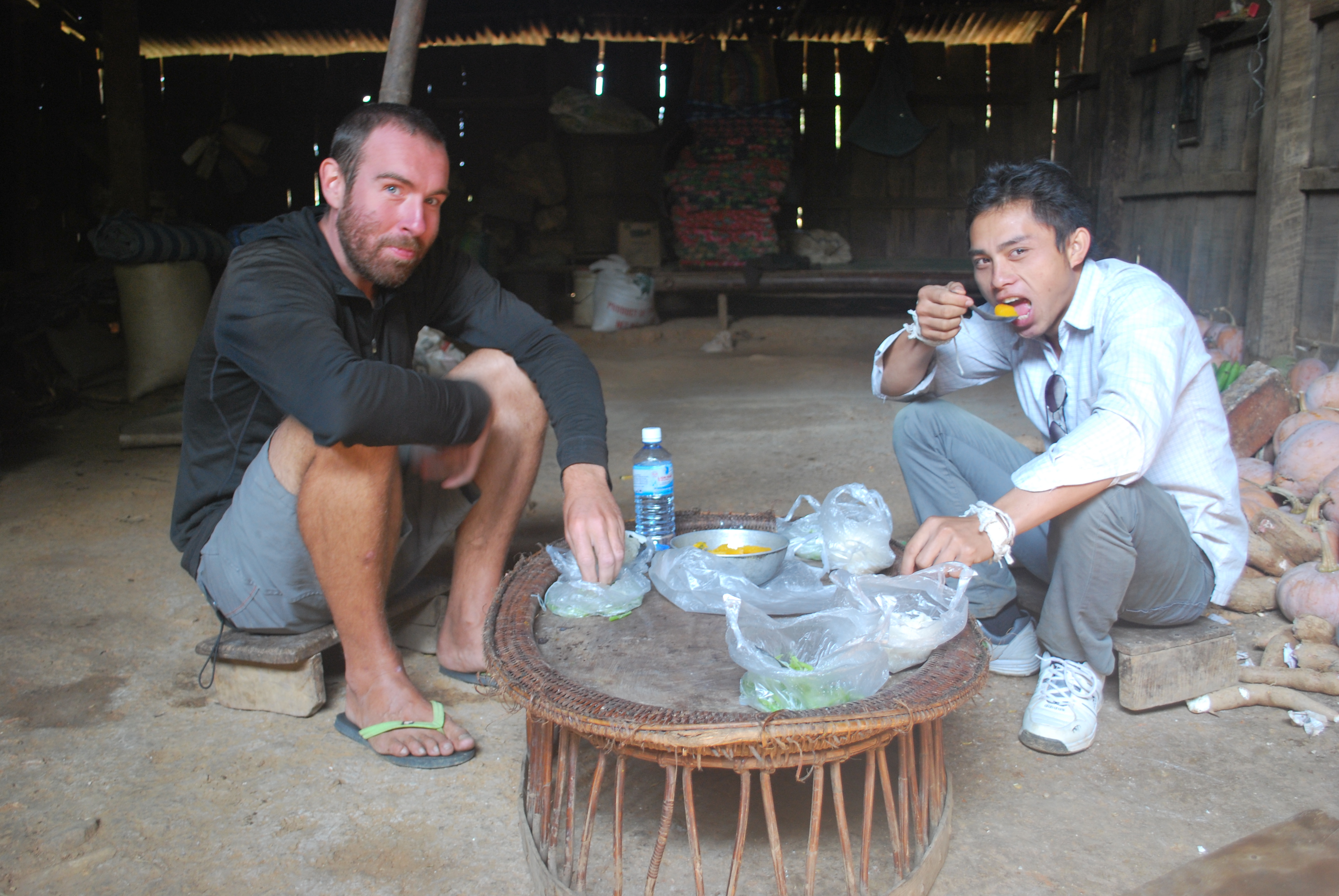 Après avoir dégusté un souper traditionnel concocté par notre guide (salade de légumes, potage avec ailes de poulet steemé dedans… au plus grand bonheur du chien de la maison qui scrutait nos moindre faits et gestes en attendant qu’on lui lance des os… du sticky rice… bref, de la nourriture), nous avons passé la fin de soirée autour du feu sur la place publique du village… le seul endroit où on ne mourrait pas de froid… à sourire et à ne pas comprendre un mot de ce que les habitants du village pouvaient bien nous dire.