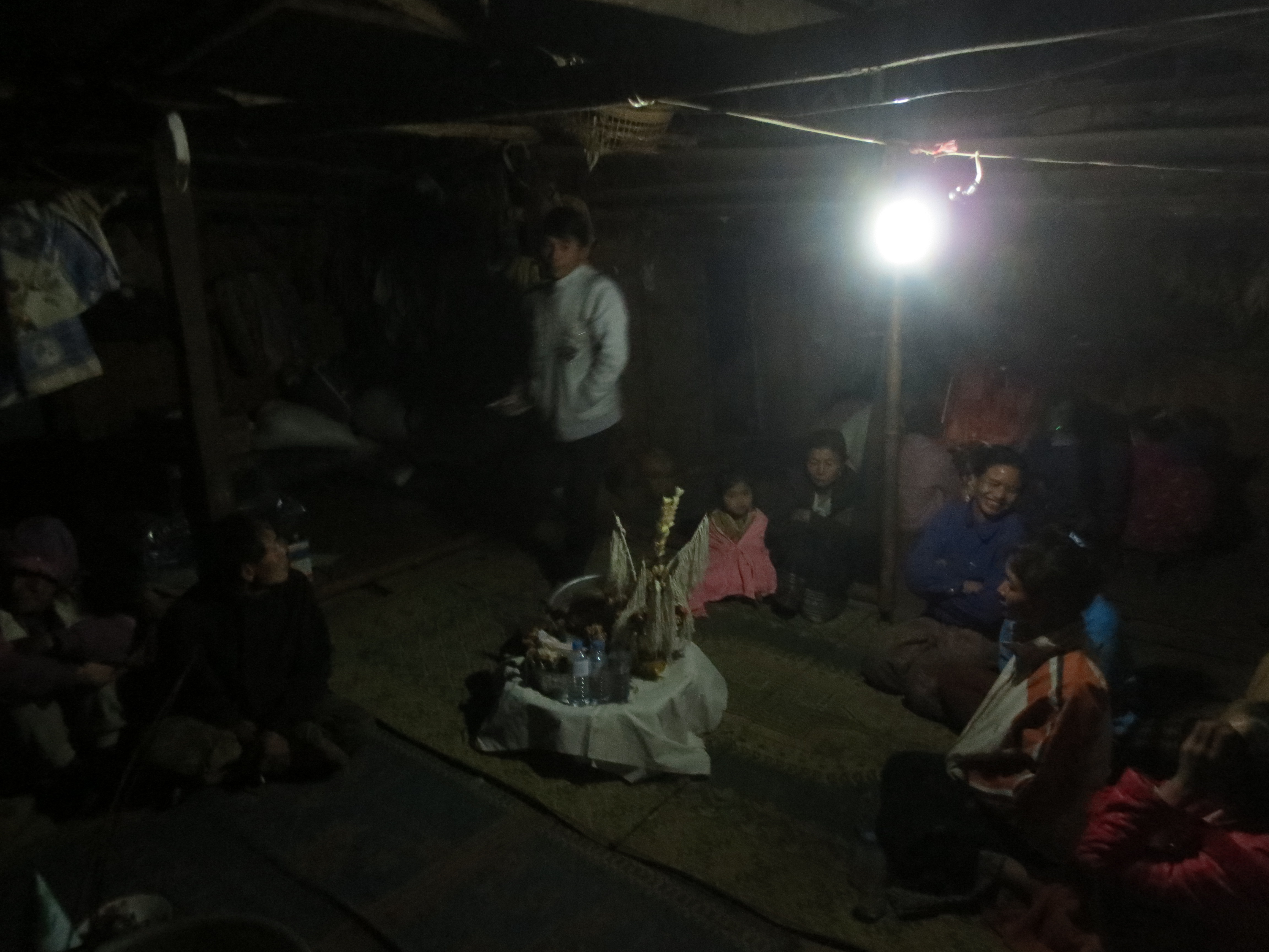 En fin de soirée, notre guide nous a conduit à une cérémonie Hmong, cérémonie en l’honneur d’un autrichien (nous n’étions pas les seuls blancs dans le village) qui sponsorisait les études d’un jeune du village. Ils ont alors fabriqué une espèce d’hôtel après avoir préalablement tué un cochon en offrande (j’ai vu le cochon entrer dans la maison, je l’ai entendu crier, pour finalement ne plus entendre aucun son… je peux vous dire qu’il n’avait aucune intention de participer à la cérémonie). La tête et la queue ont donc été disposées devant l’hôtel de manière à ce que le chaman puisse ‘’discuter’’ avec les esprits… si vous voulez mon avis, la cérémonie était un simple excuse pour boire et par chaman, ils veulent dire alcoolique.