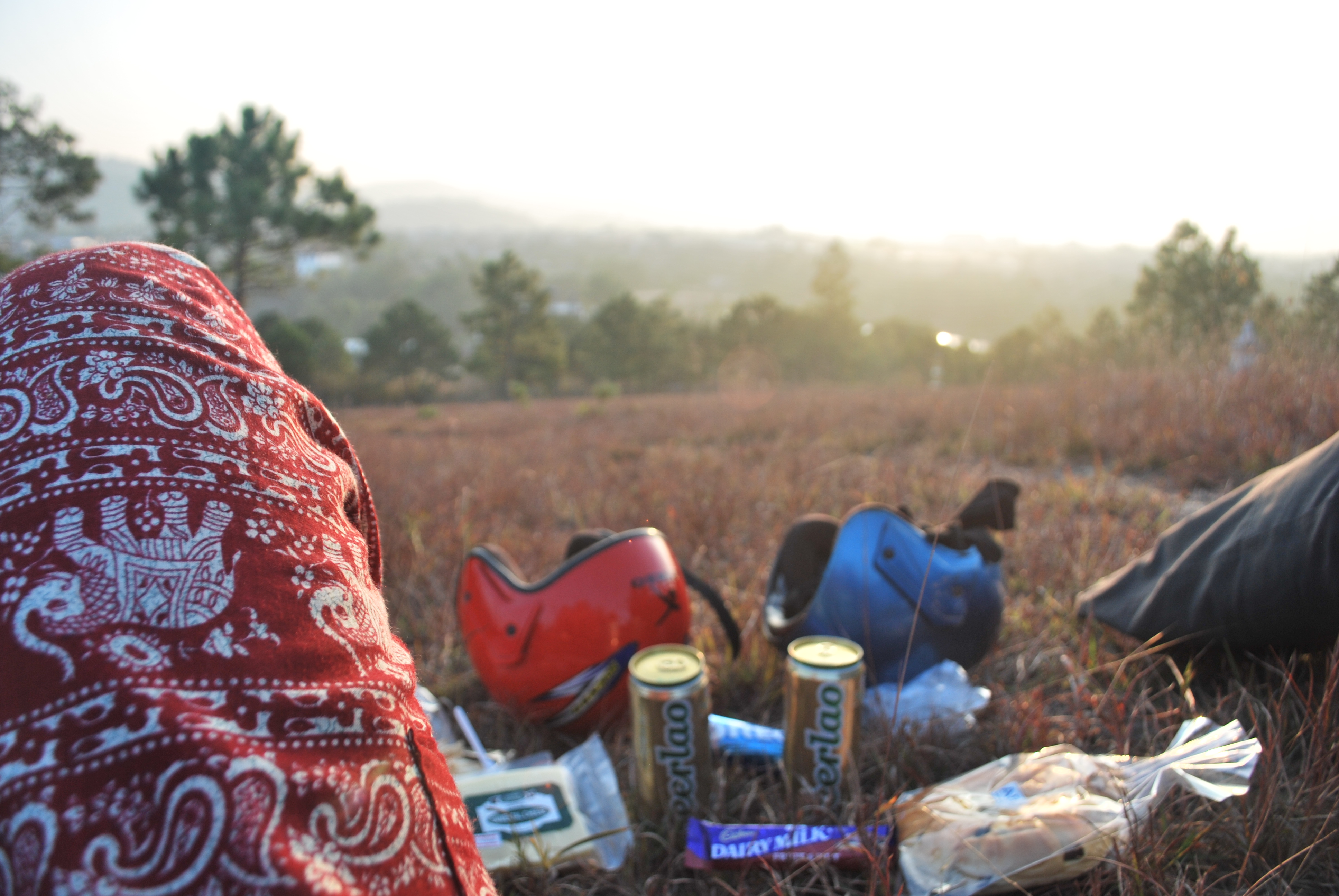 Nous sommes ensuite passés au dépanneur du coin afin de faire nos emplettes et préparer notre festin. Mon souper de Noel 2013 a donc consisté à une bière, des craquelins, un pain au raisin, du fromage et des biscuits Oréo… à regarder un coucher de soleil… dans un cimetière… perché sur une montagne surplombant les environs… en périphérie de Phonsavanh… au Laos… en compagnie d’une australienne qui n’a jamais eu de neige pour Noel.