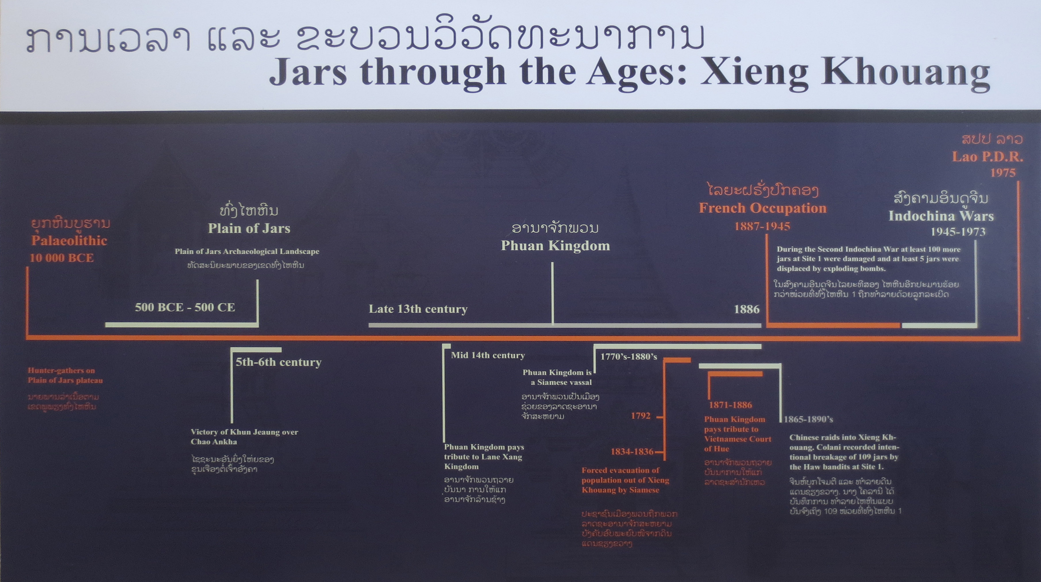Autrefois baptisé Xieng Khouang, l’endroit fut jadis la capitale du royaume de Phuan (?!?). Tout comme Phonsavanh, l’endroit a été complètement détruit lors de la guerre du Vietnam suite à des bombardements fréquents. Reconstruit de ses cendres, l’endroit se nomme aujourd’hui Muang Kheun, et tout comme pour Phonsavanh, les russes ont oublié le facteur ‘’chaleur humaine’’. Bref, un endroit glacial et sans intérêts… autrement que pour voir les 2 endroits que nous allions visiter…
