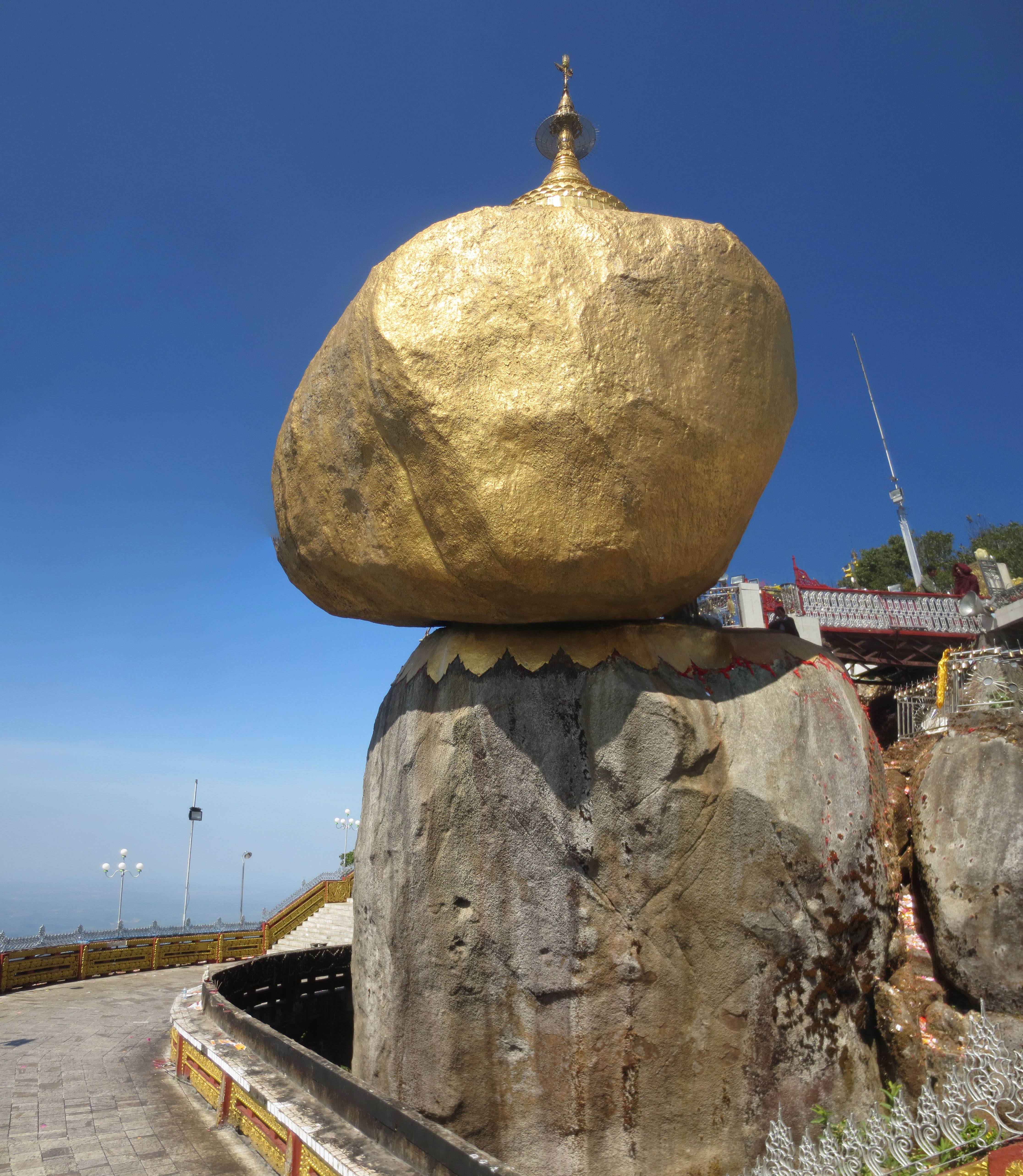 Autrement, étant un objet de culte, chaque pèlerin apporte une petite feuille d’or pour la coller sur la roche… d’où sa couleur dorée.