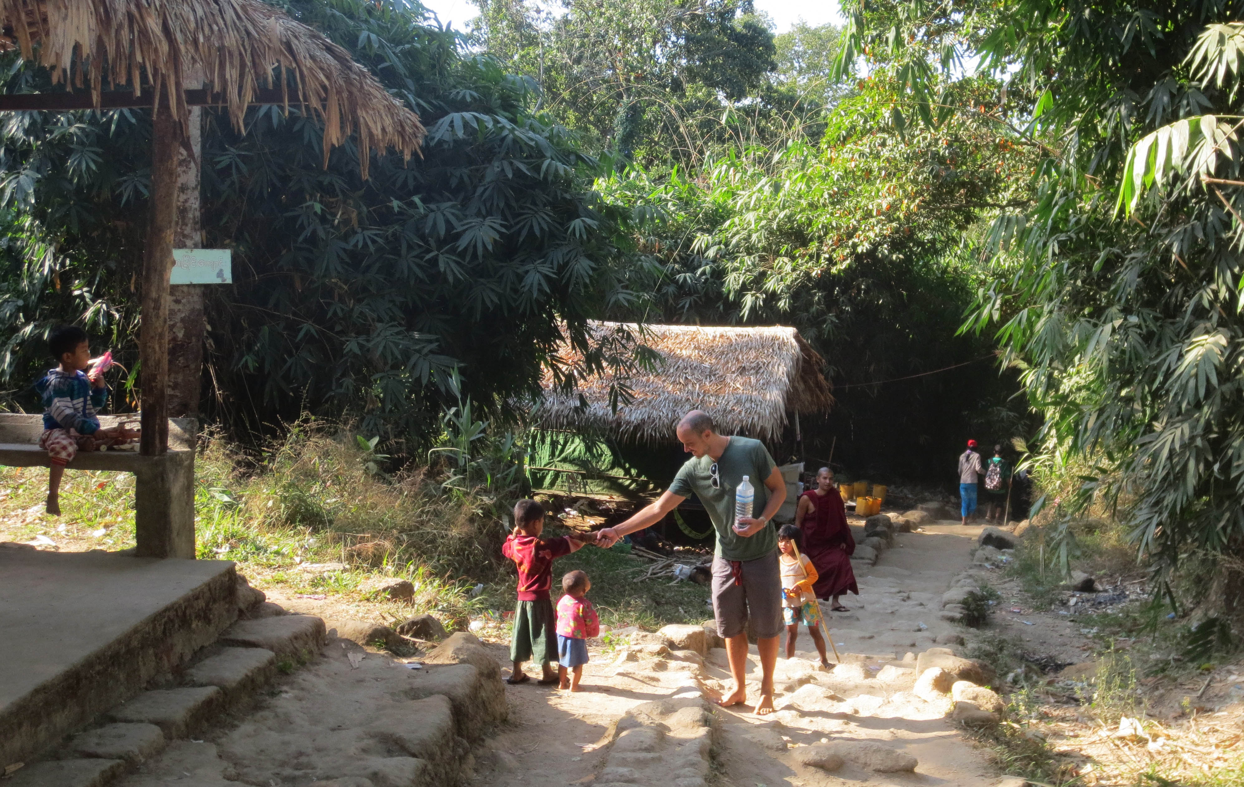 J’avais alors l’impression que ca faisait 6h que nous marchions… ma motivation était à son plus bas et mes pieds étaient en compote. Heureusement, j’avais un boost de moral à chaque fois que nous croisions un groupe de birman qui nous souriait et nous encourageaient.