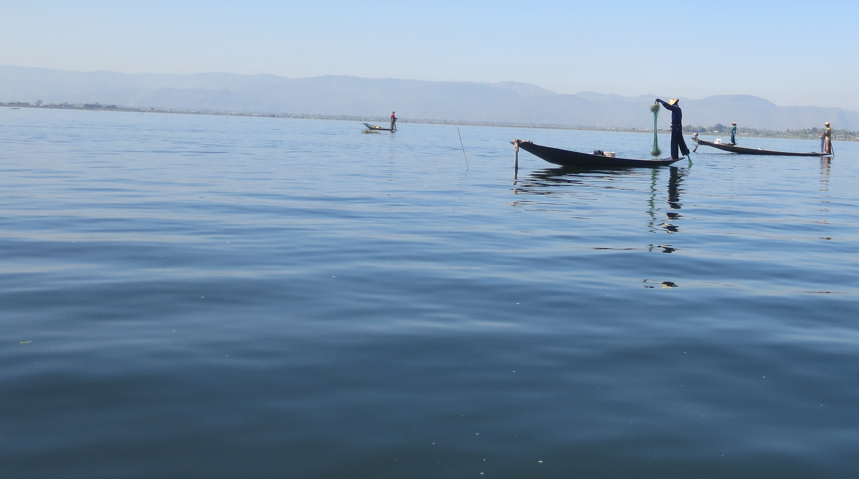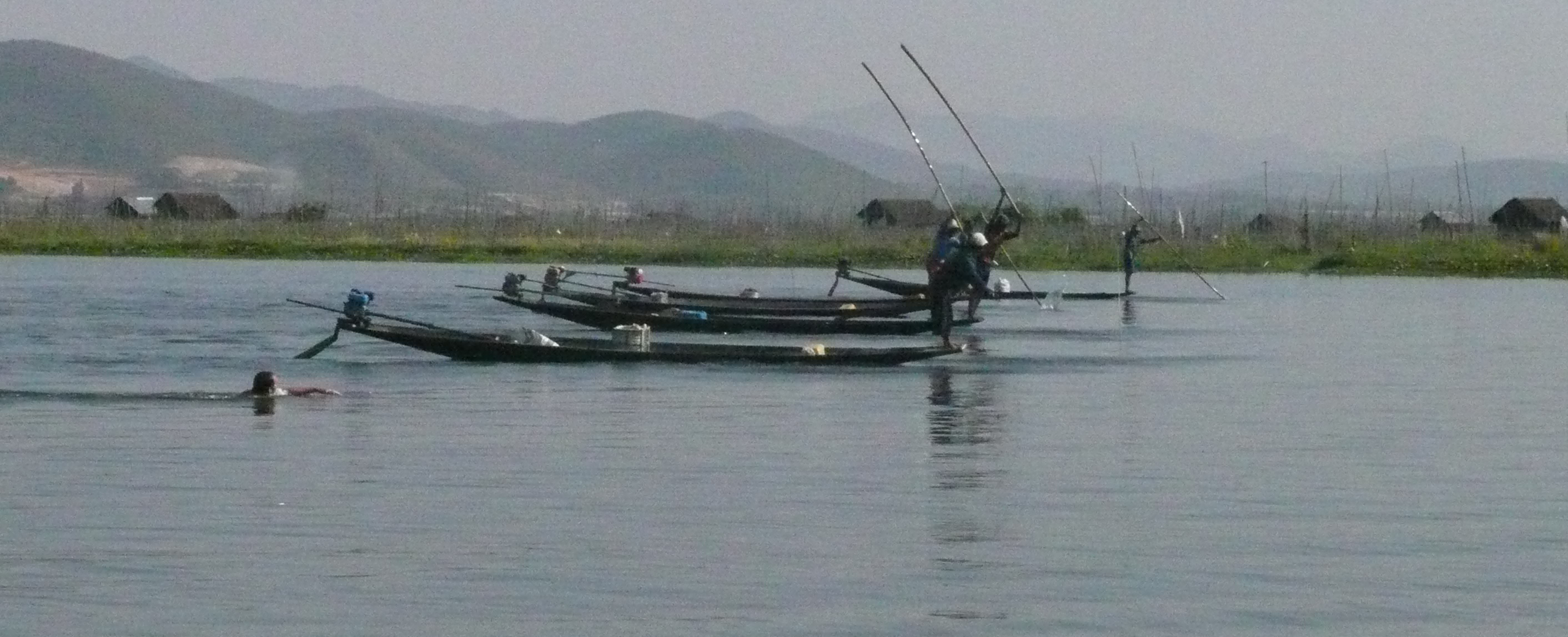 Un peu avant de retourner à Nyaung Shwe, notre point de départ d’il y a 3 jours, le pilote du bateau s’est arrêté au milieu du lac et nous a demandé si on voulait se baigner. Difficile de dire non à cette occasion qui ne se reproduirait probablement jamais. À peine dans l’eau qu’un groupe de pêcheurs passaient à coté de nous en tapant l’eau avec leur pagaie afin de diriger les poissons vers des filets… j’en ai donc profité pour piquer une petite course avec eux…