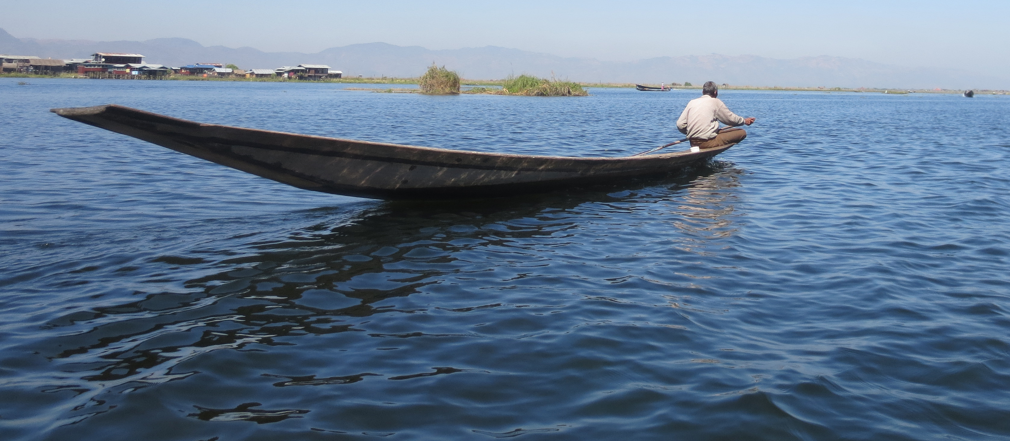 Inle lake… Ceinturé par une chaine de montagne, c’est un lac extrêmement long, pas très large, qui représente la plus grande source d’eau potable d’Asie du Sud-Est et dont ont distingue difficilement la limite entre l’eau et les champs tout autour tellement ils ne font qu’un.