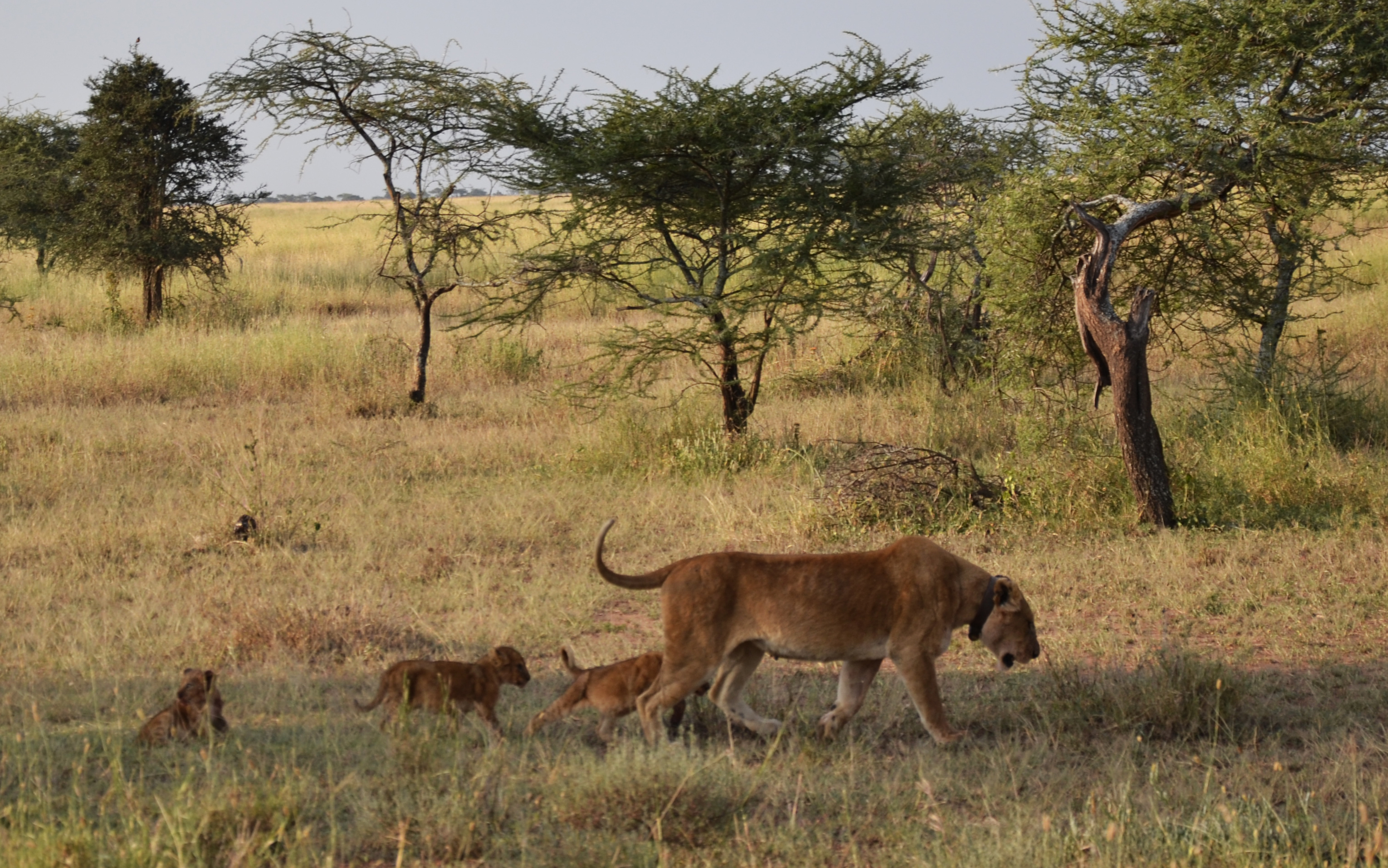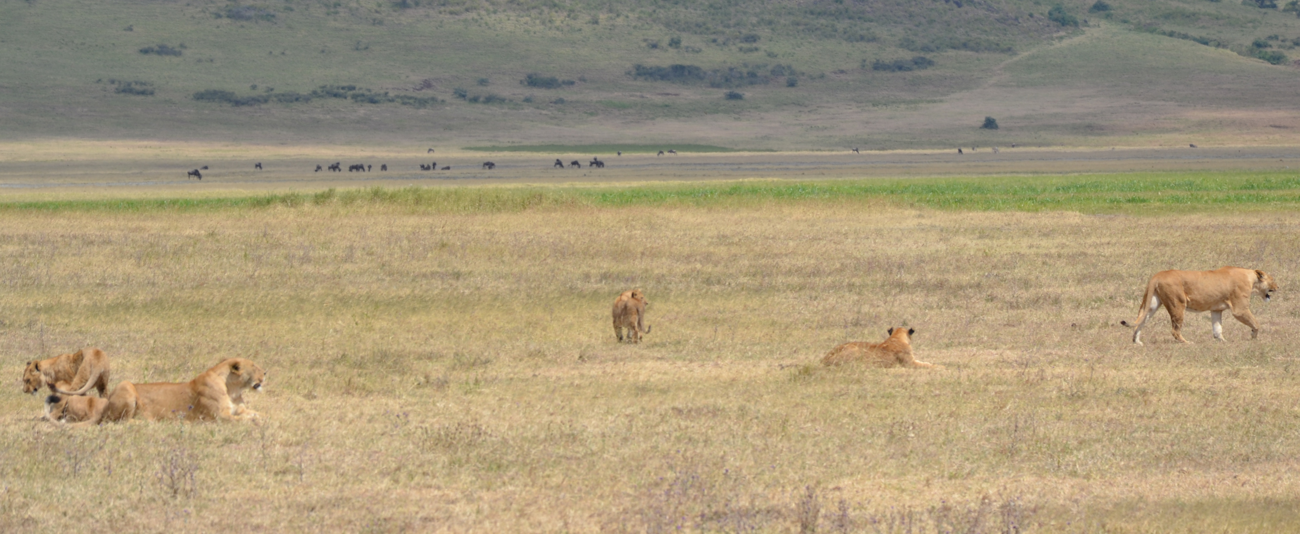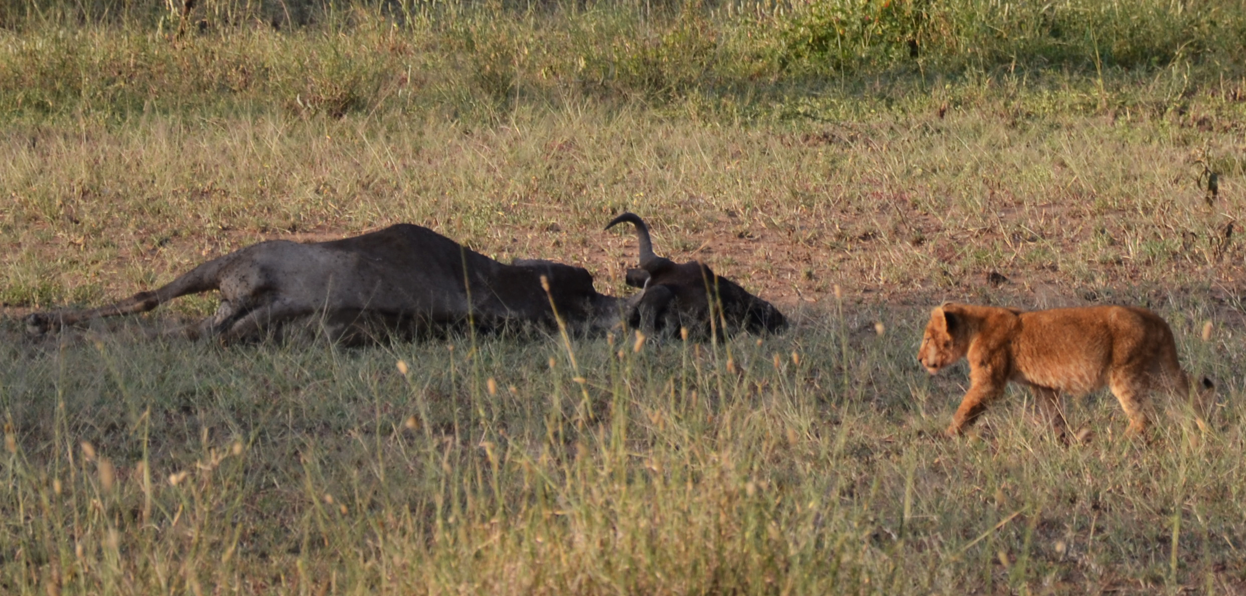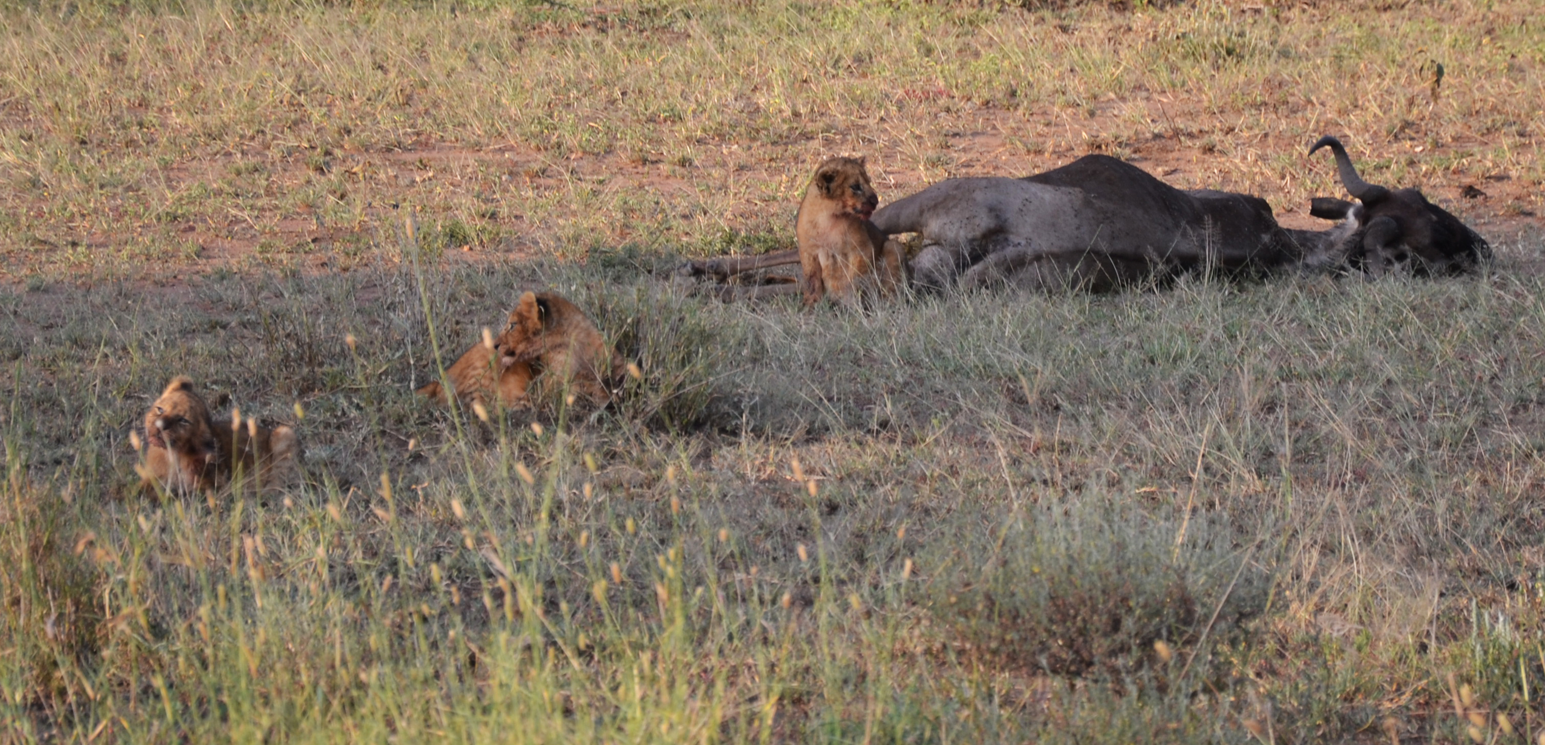 Une lionne et ses 3 lionceaux. Ceux-ci s’amusaient à coeur joie sur la carcasse du gnou probablement tué par leur mère quelques minutes plus tôt. Ceux-ci allaient manger à saietté pour ensuite laisser les hyènes, jamais bien loin, finir le travail.