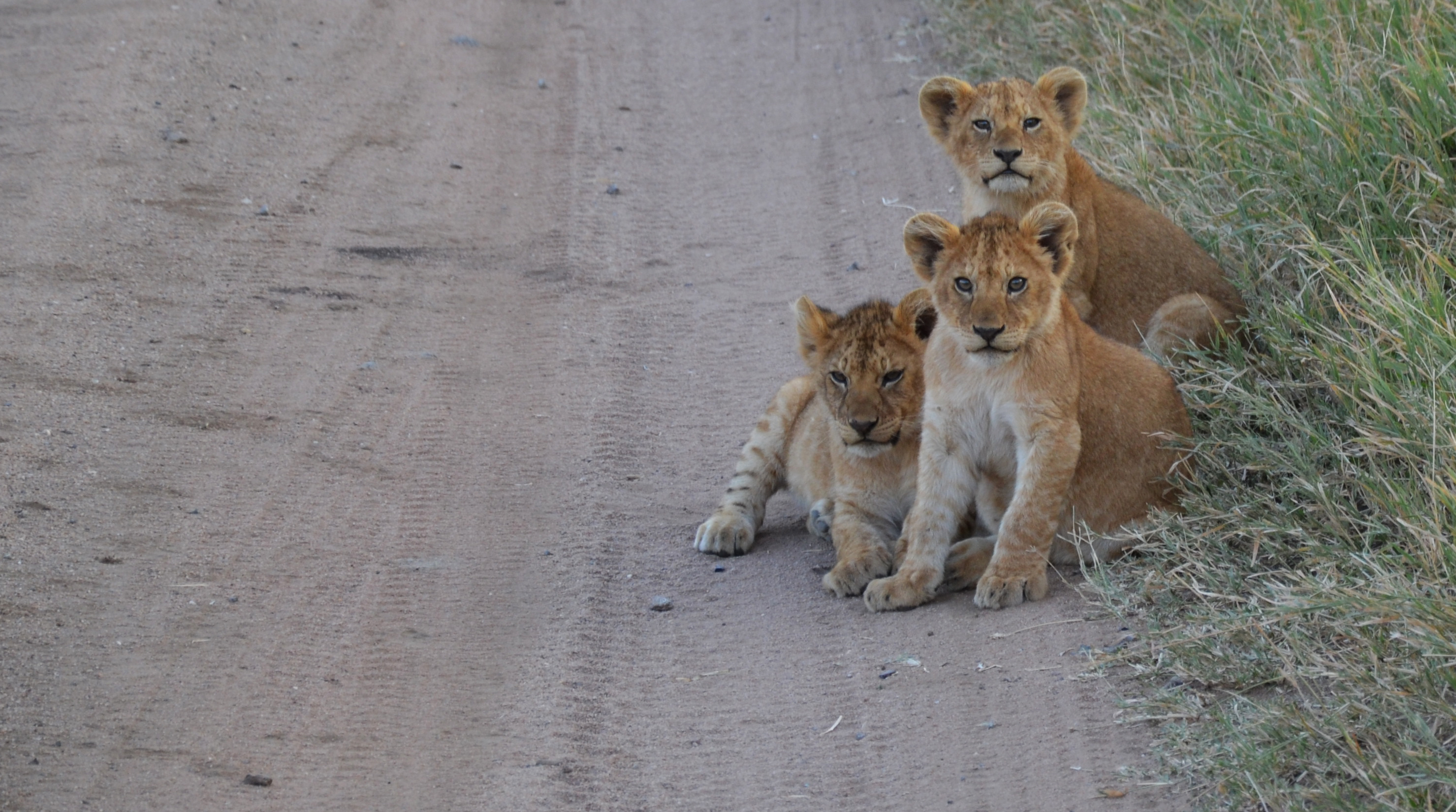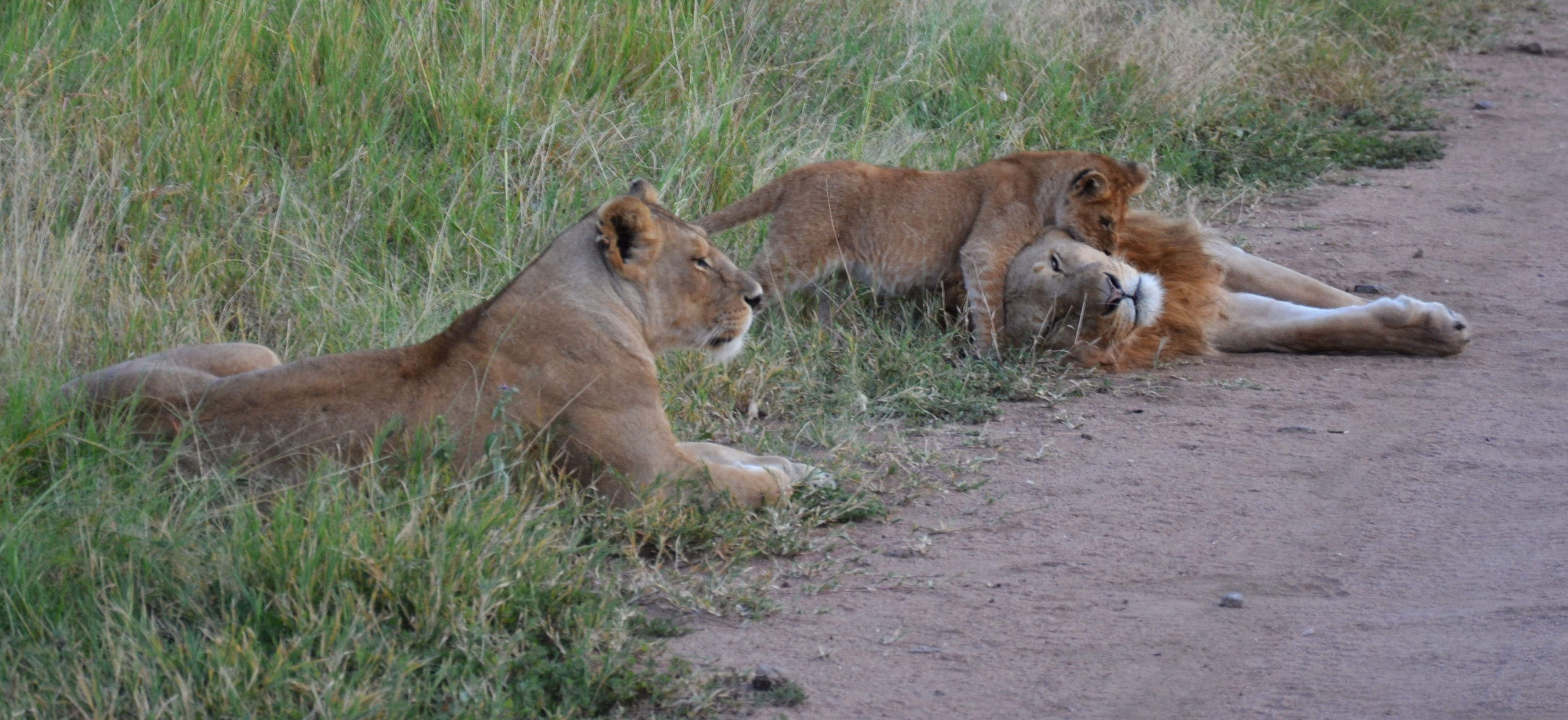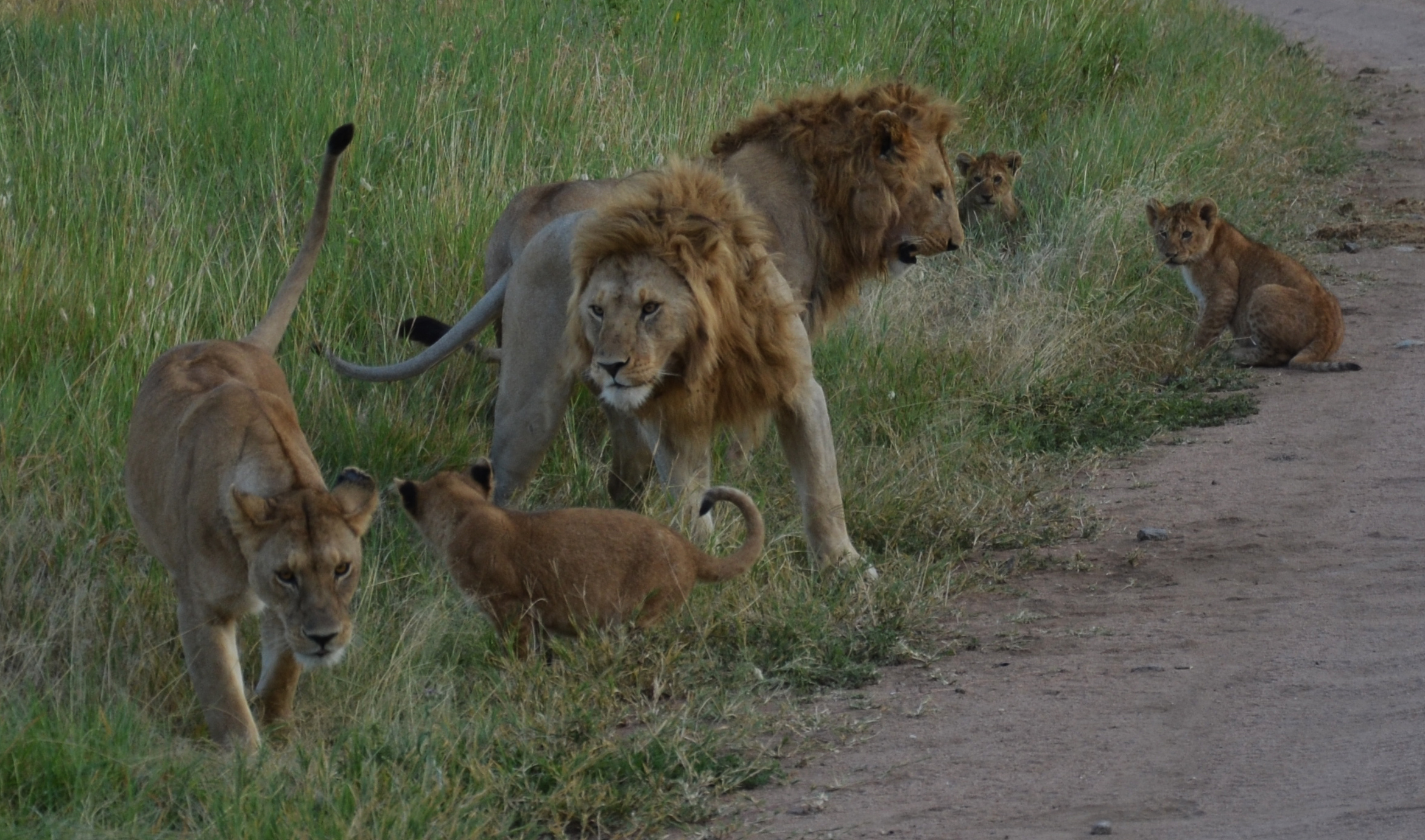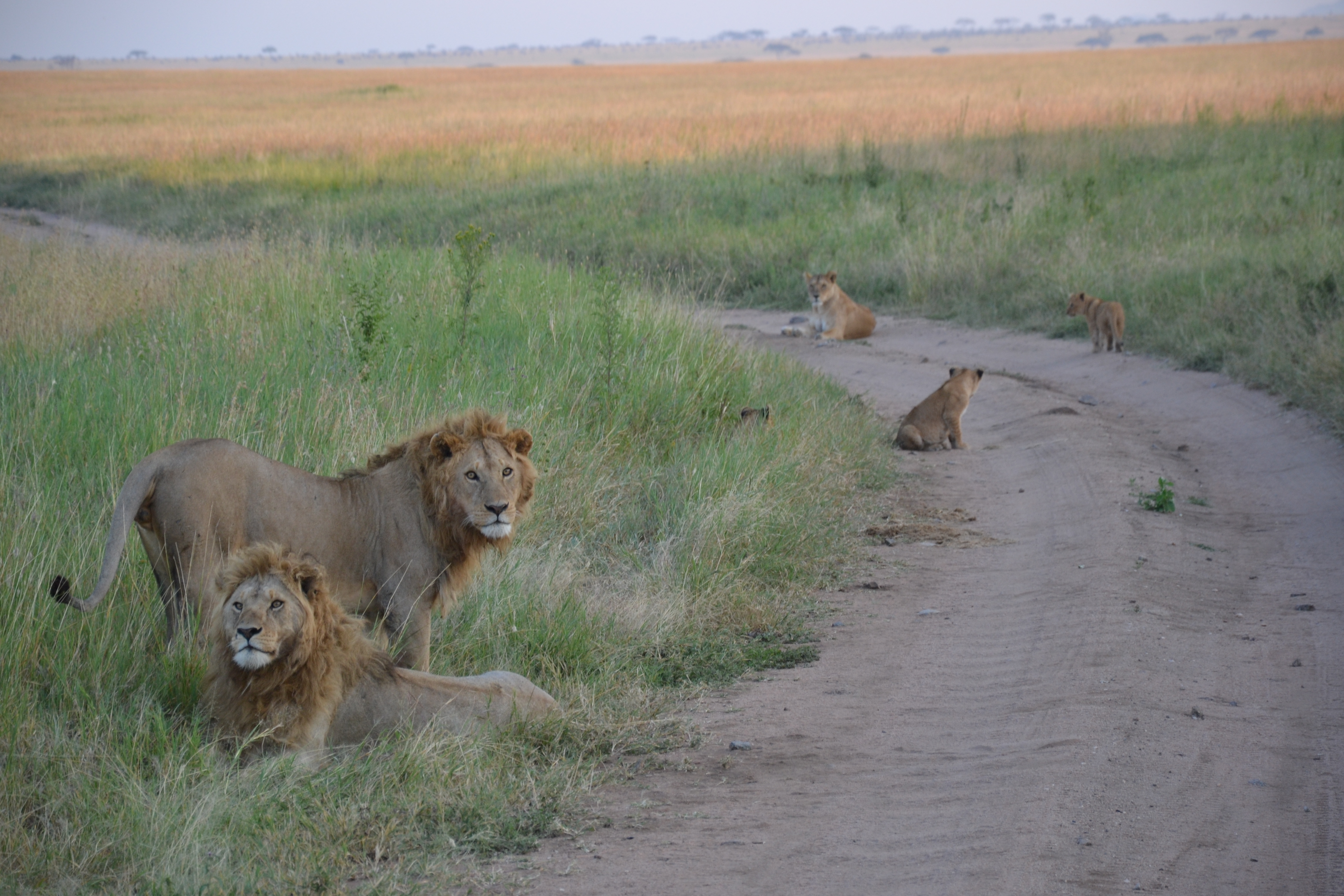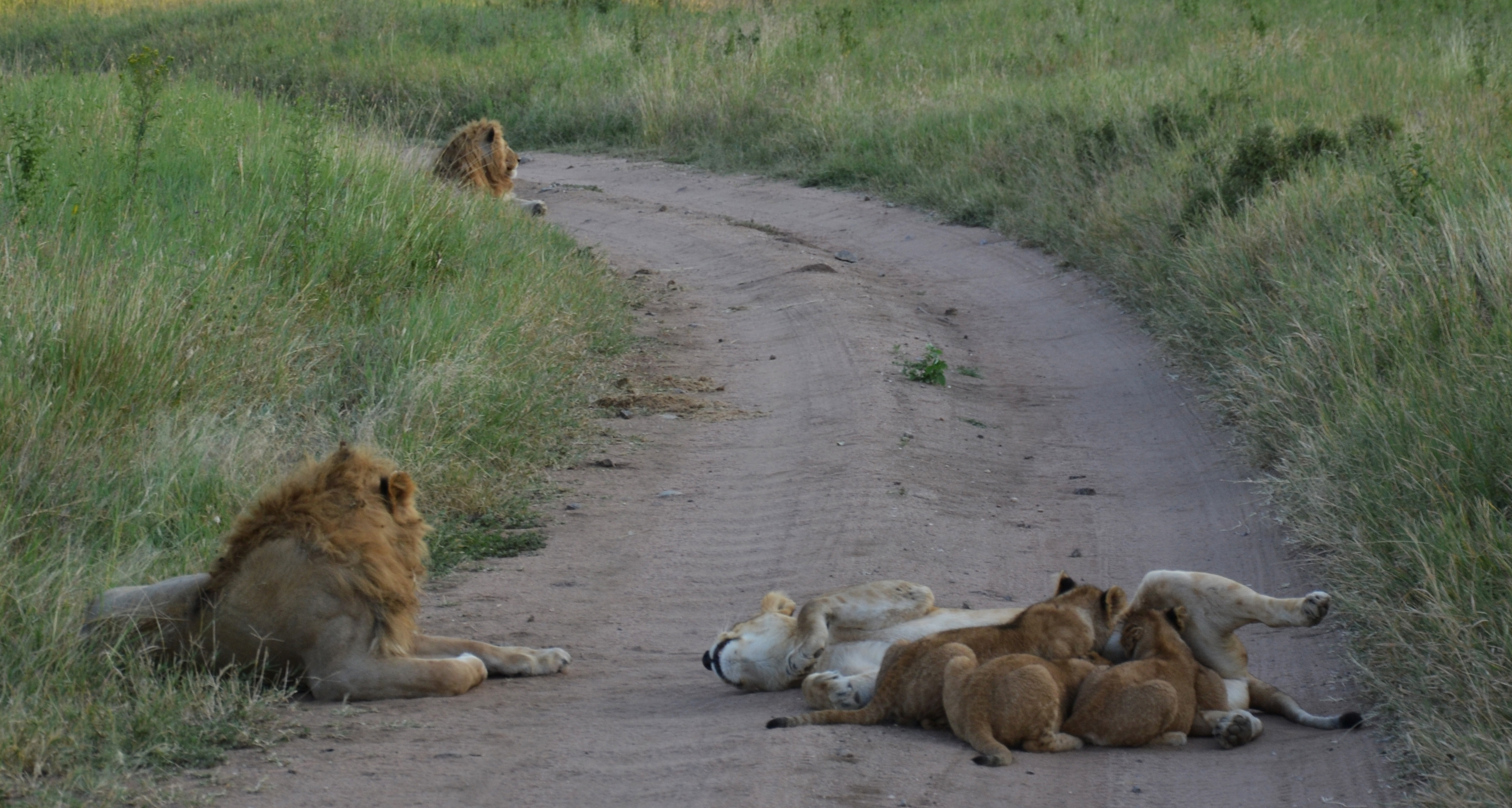 Cela ne fait pas 10min que nous roulons que nous tombons sur une famille de lions (2 mâles, 1 femelle et 3 petits d’environ 3mois) sur la route tout juste devant nous. On a du passer un bon 40min à les regarder.