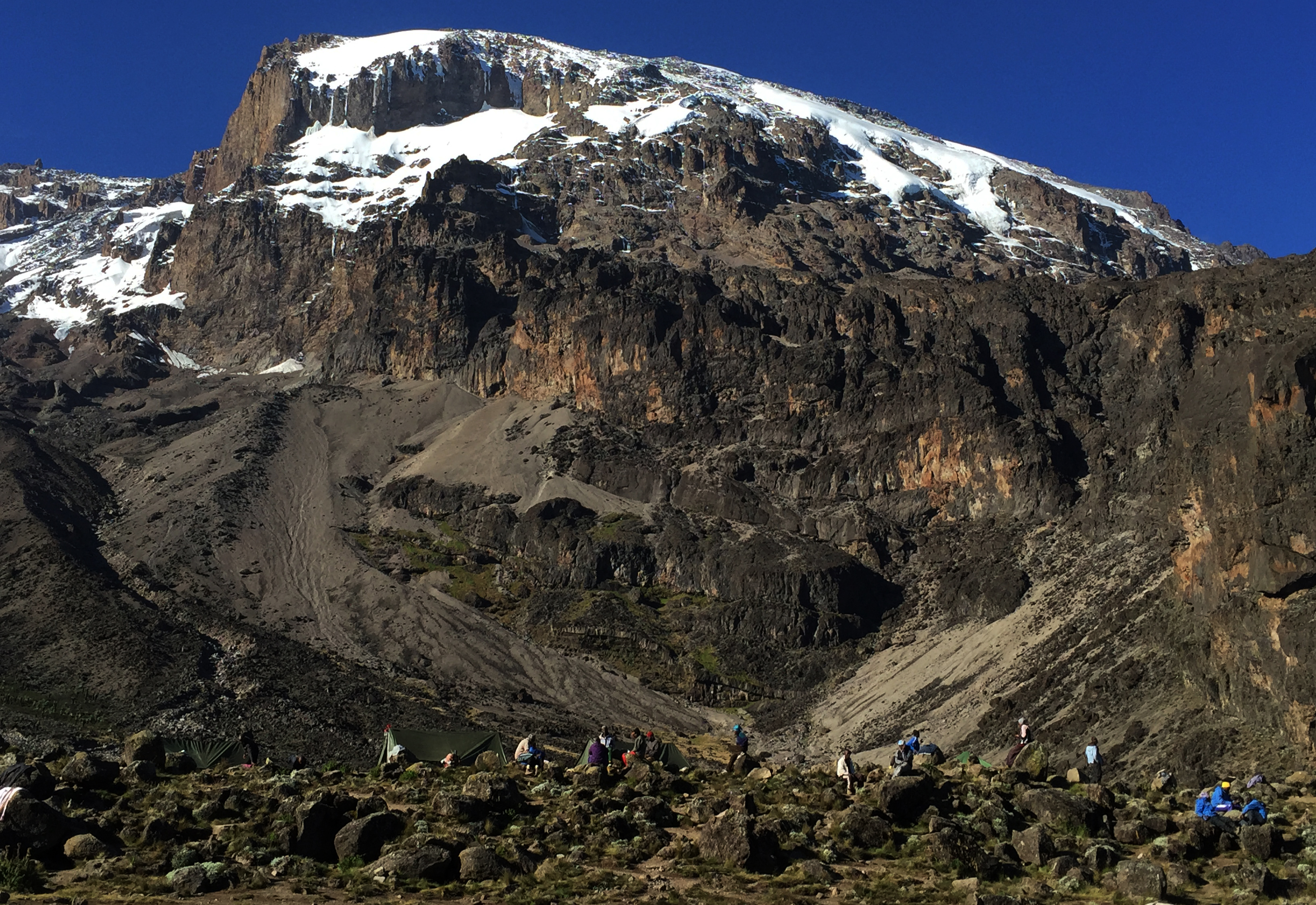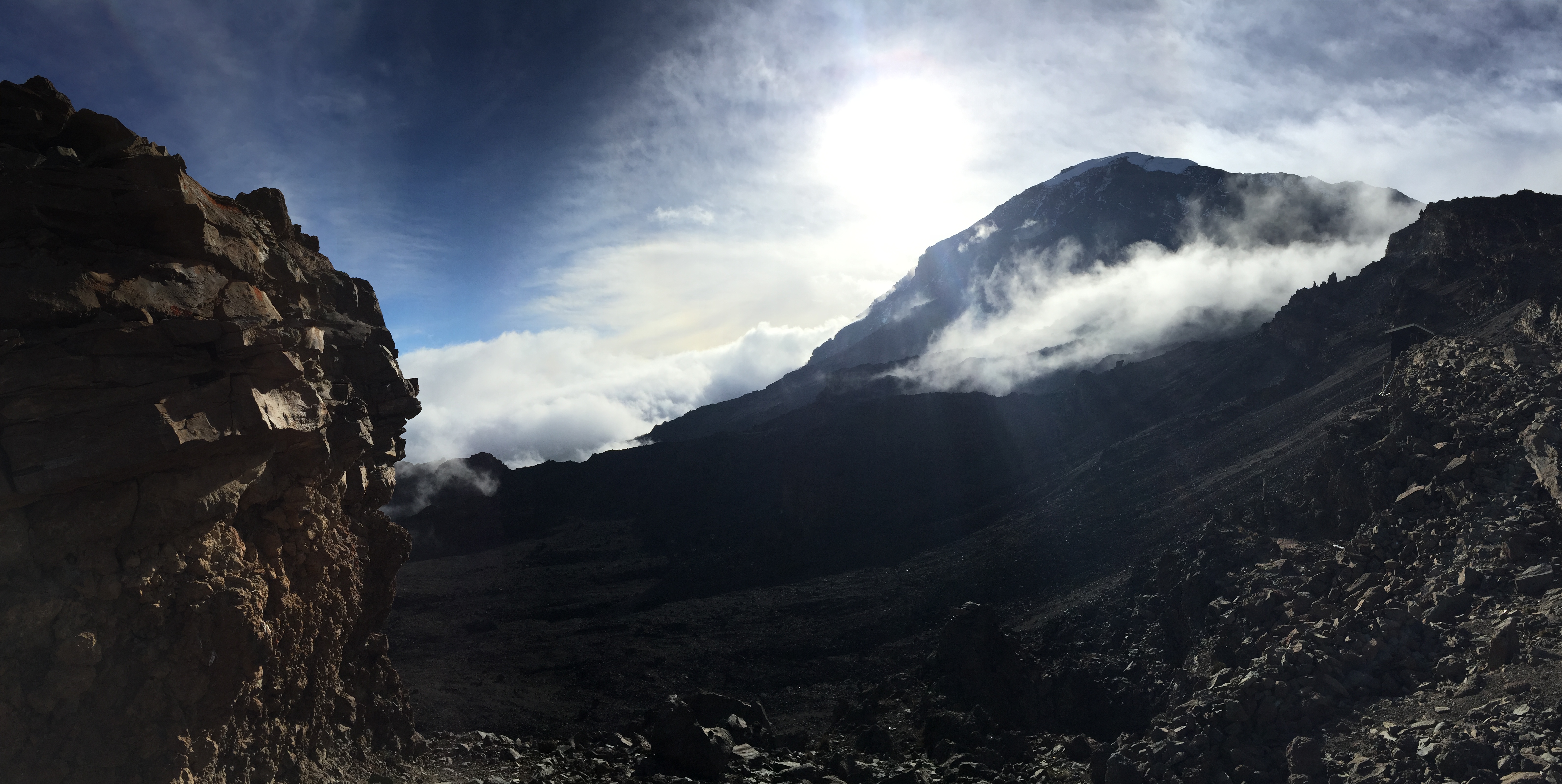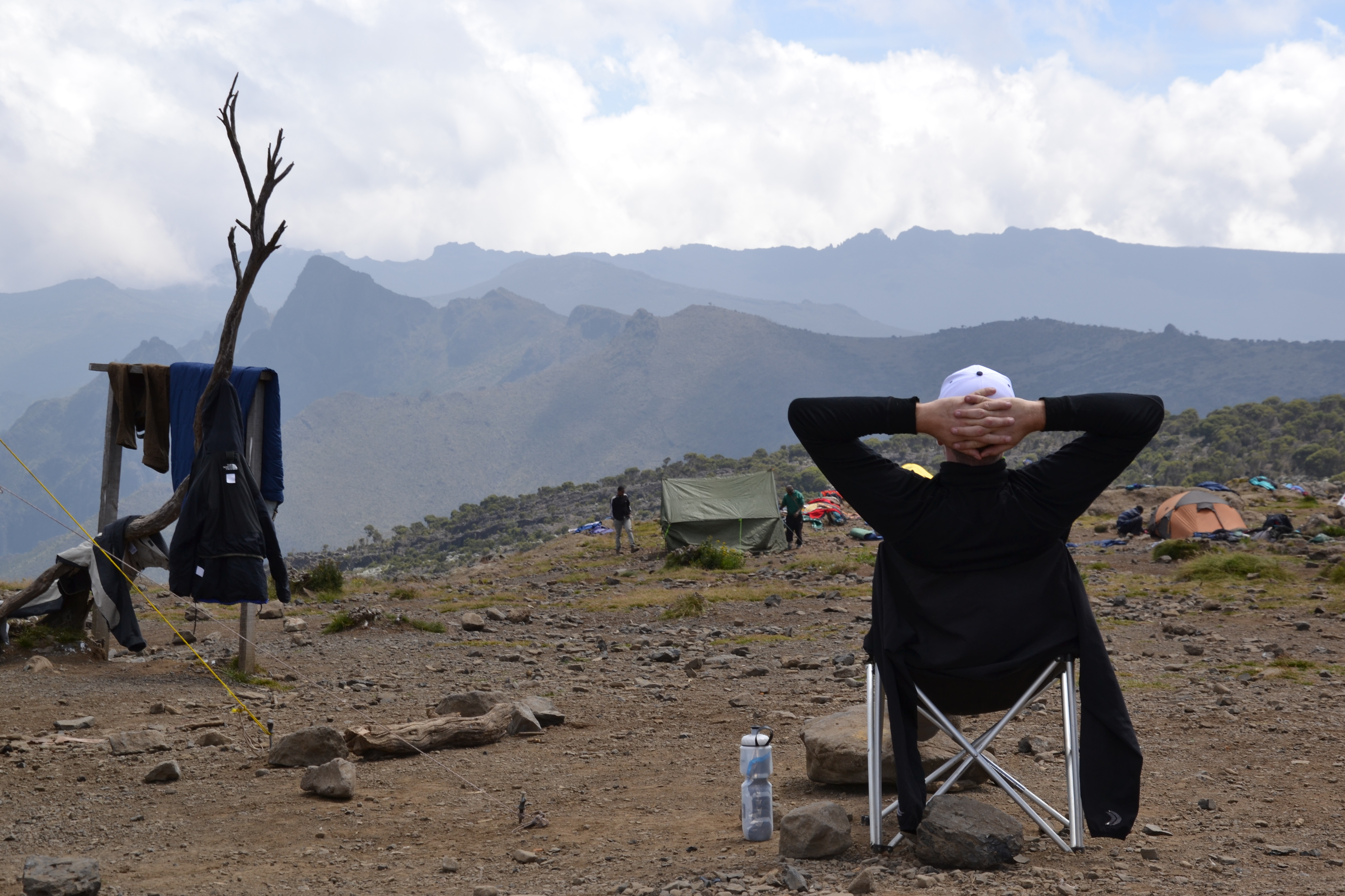 Le camp, surnommé Barafu Camp, communément appelé Base Camp, se situe sur une crête à plus de 4600m. Le brouillard ayant disparu peu à peu, nous pouvions désormais apercevoir la splendeur qui nous entourait; une vue plongeante sur la vallée en contrebas et la majestueuse montagne plus haut… montagne à laquelle je devrais m’attaquer dès ce soir.