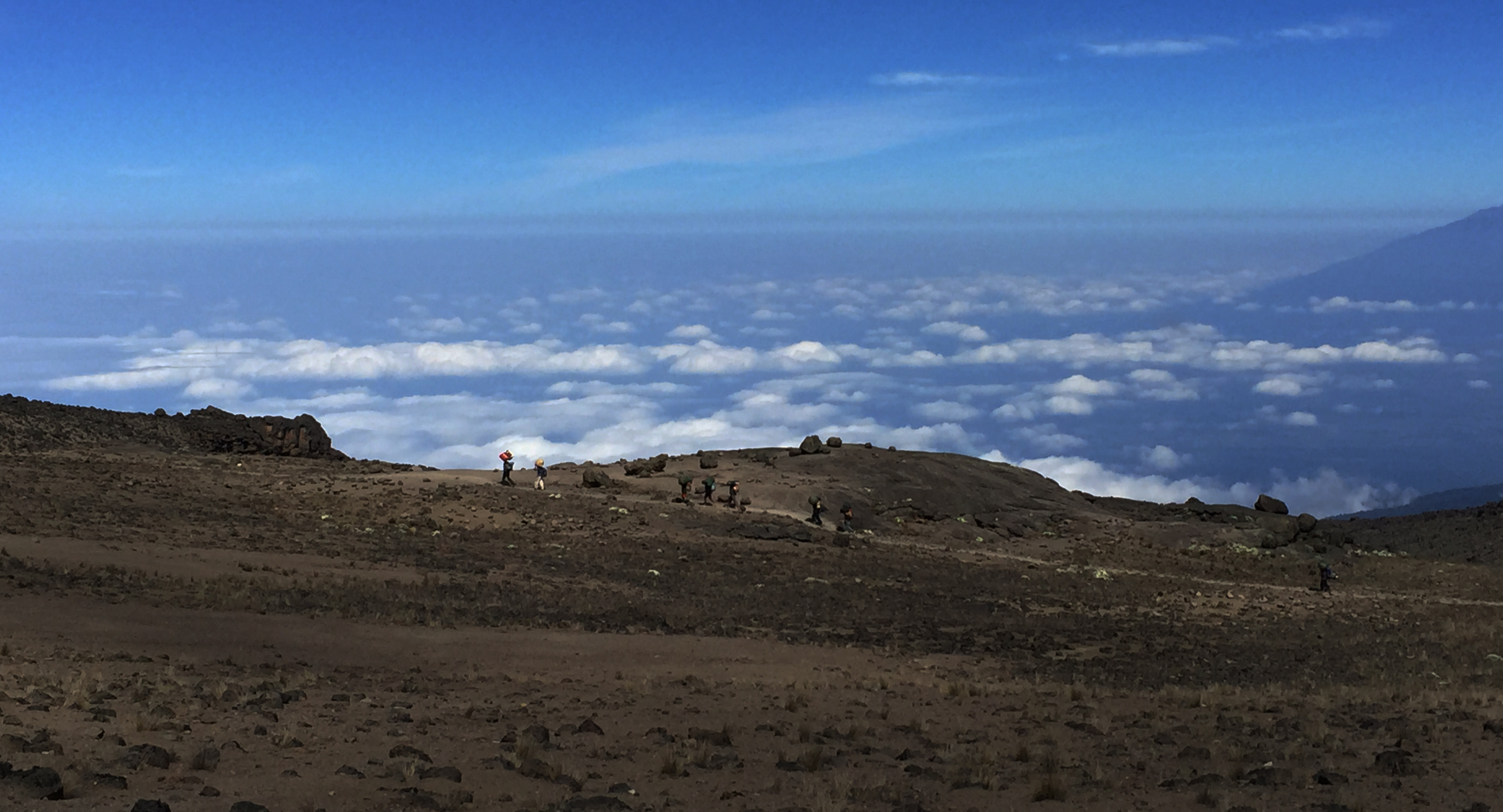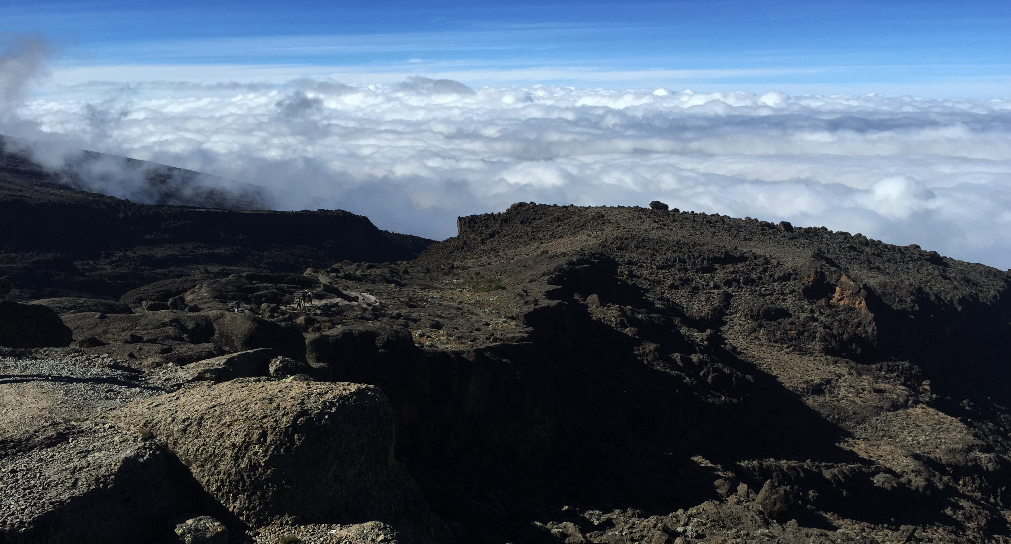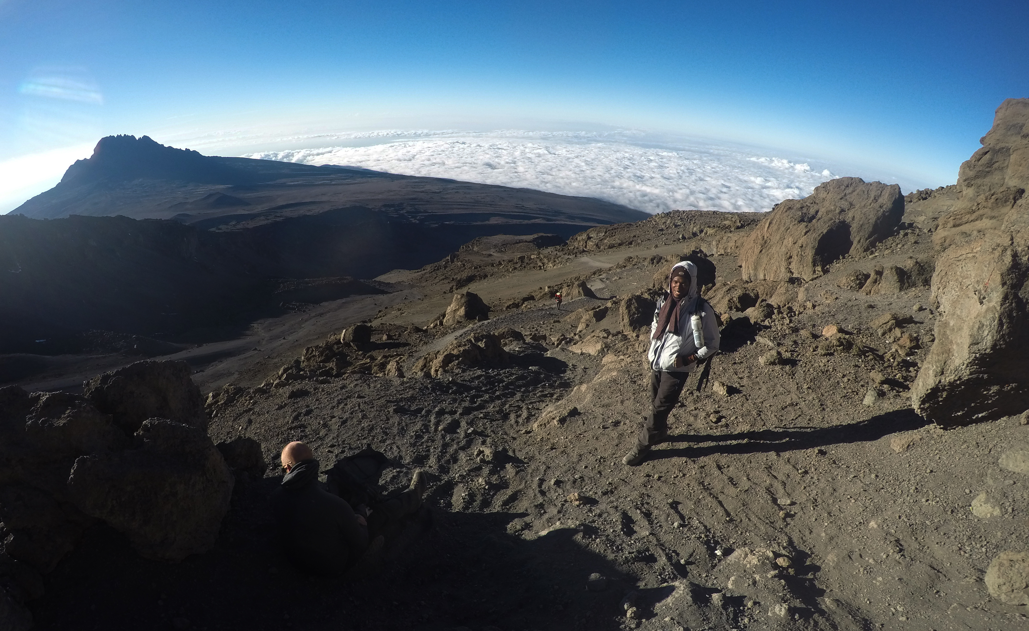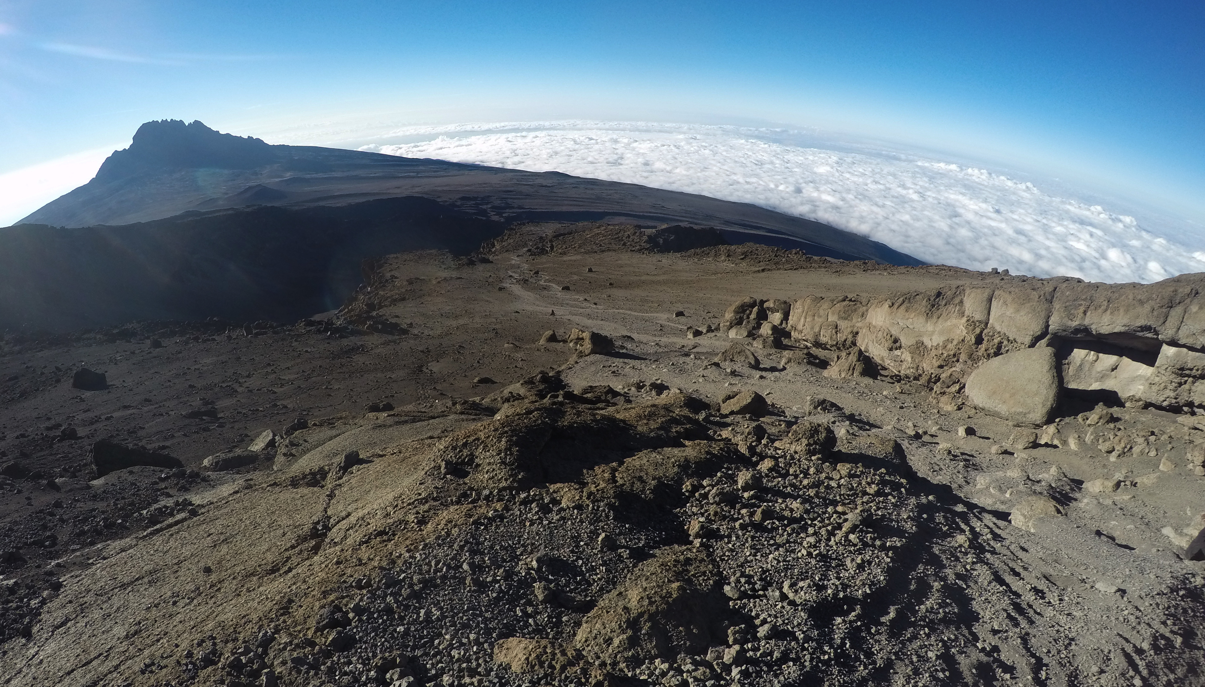 À ce moment là, il n’y avait plus rien de plus haut que nous en Afrique sauf le sommet au-dessus de nous et le Mont Kenya (5199m – Kenya). Le mont Meru (4565m – voisin du Kili), qui complète le podium des plus hautes montagnes en Afrique, se situait déjà en dessous de nos pieds.
