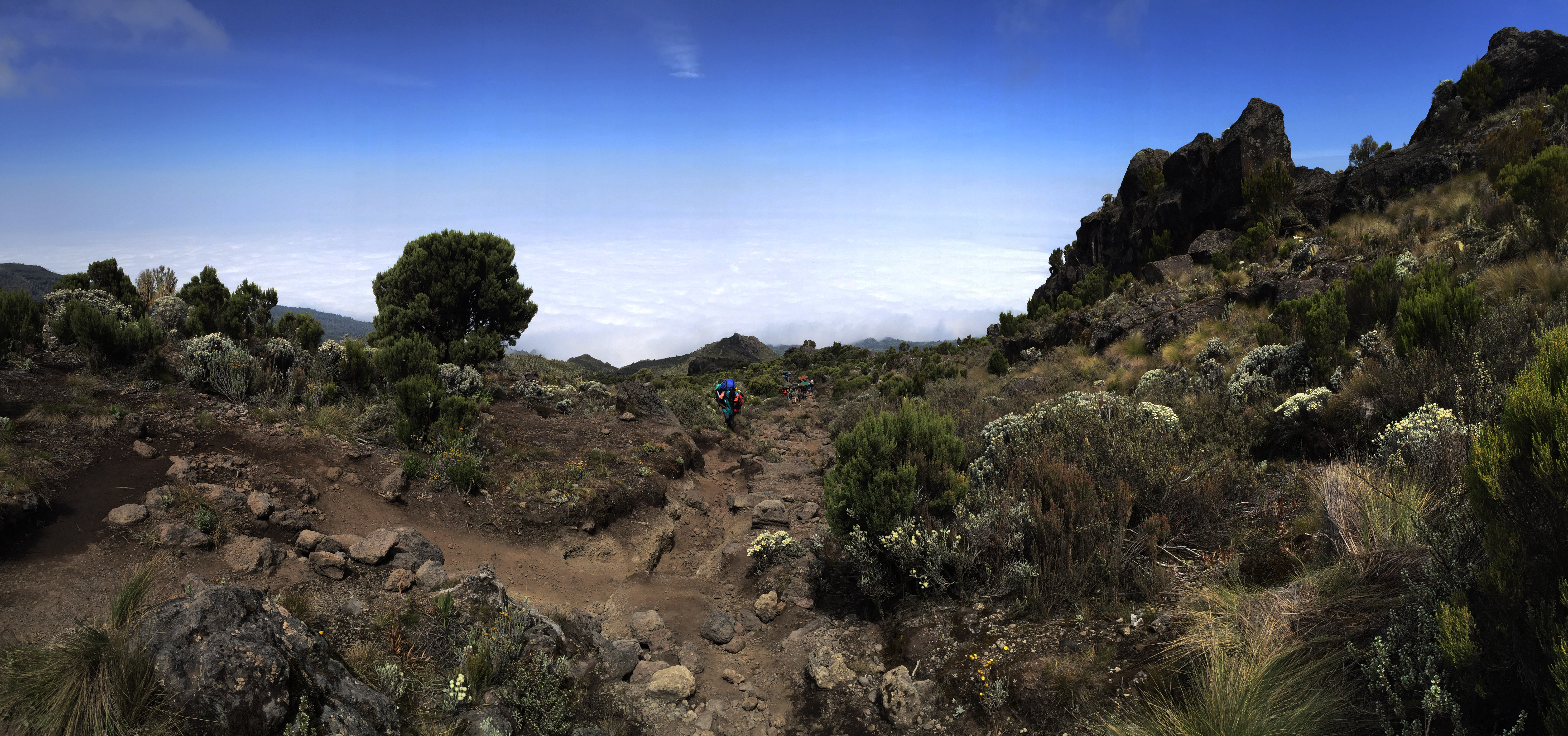 À partir de là, 2 routes ne fessaient maintenant plus qu’une: Machame avait fusionnée avec Lemosho (les gens de Lemosho avaient pris au moins une journée de plus pour atteindre le même endroit).