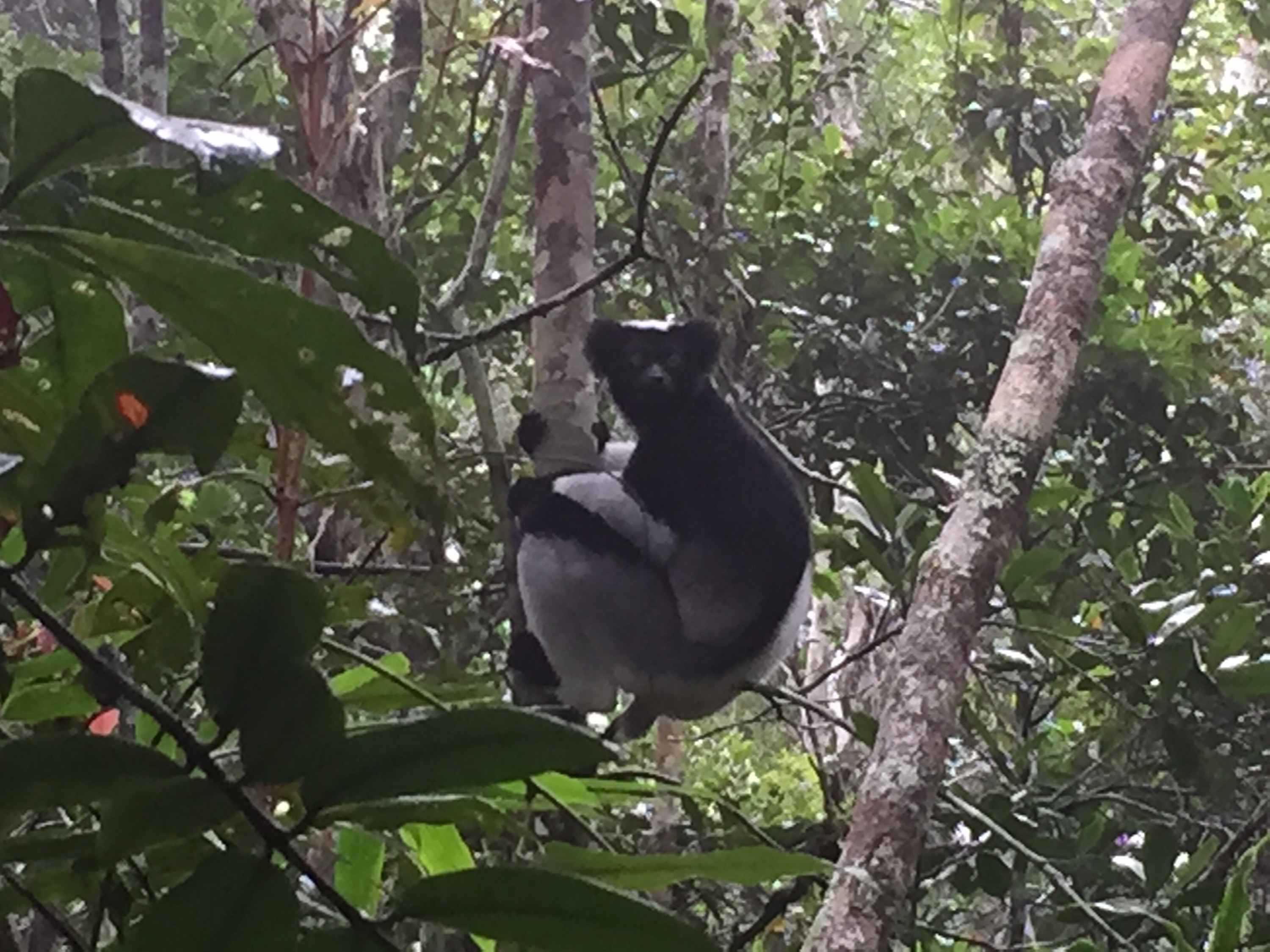 S’en est suivit une promenade hors sentier d’environ 1h à suivre les Indris. En plus d’être les plus grands lémurs, ils sont facilement identifiable par leur pelage blanc et noir, et leur marque blanche sur le dessus d’une tête toute noire. Cette marque blanche leur donnait l’impression d’être chauve. Les voir sauter d’arbre en arbre était assez impressionnant. Ils sont rapides et agiles ces petites bêtes. Fait intéressant, les Indris n’ont pas de queue… ce sont donc des femelles 🙂