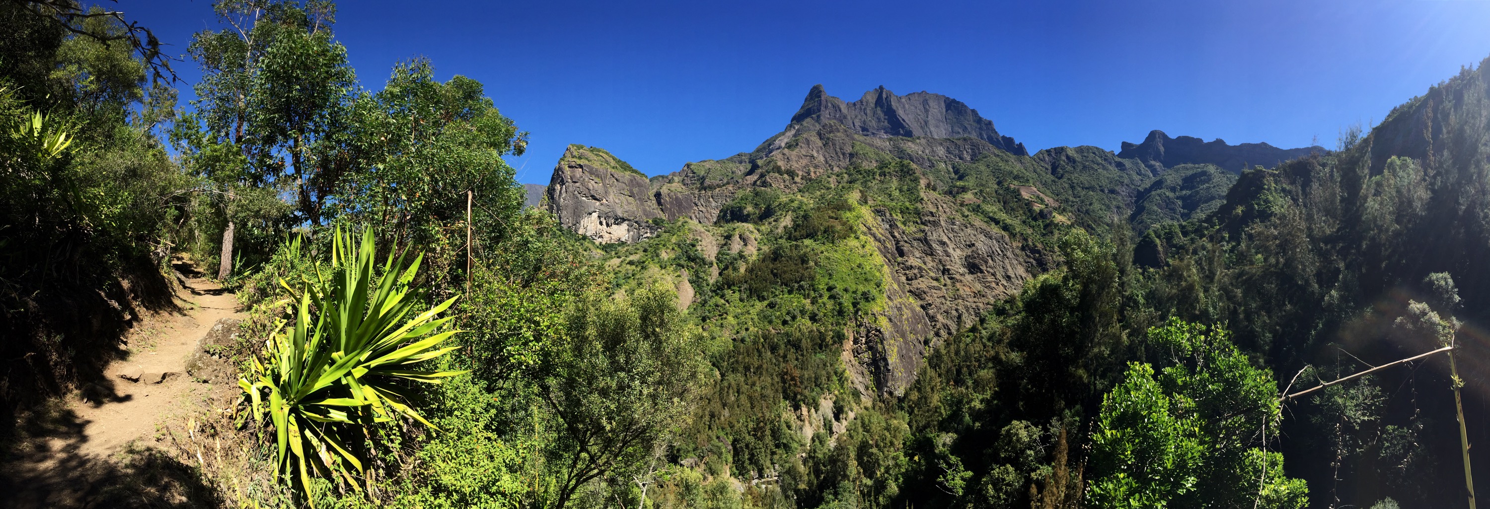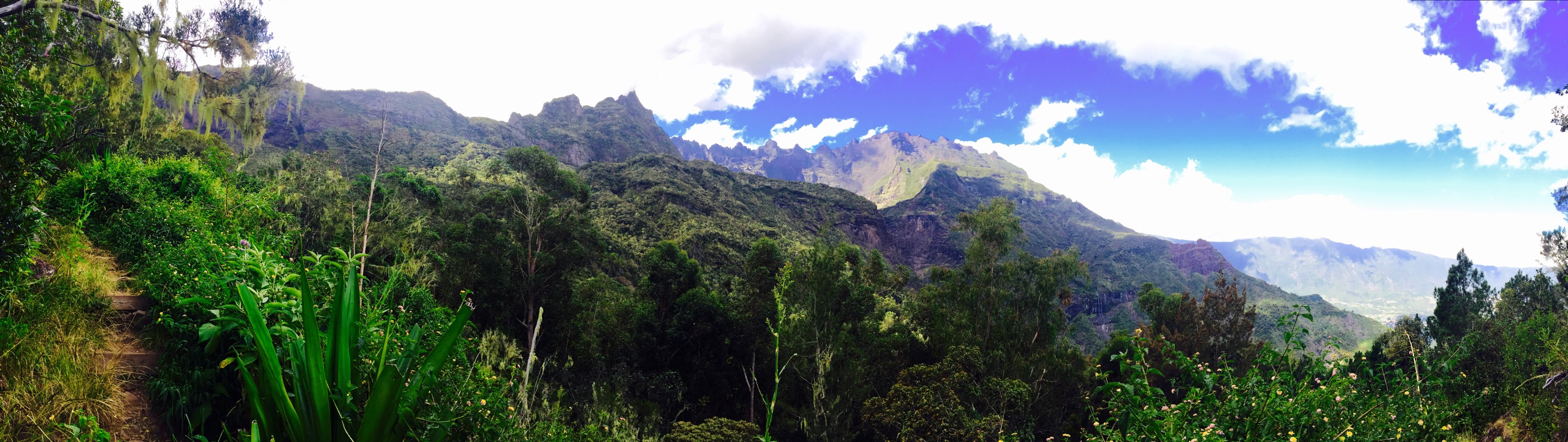 Heureusement pour moi, le sentier était incroyable et offrait une vue imprenable sur tout le cirque de Cilaos. J’en ai vu des paysages de montagne, mais cette vue là est l’une des plus belles que j’ai pu voir de toute ma vie. C’était tout ce qu’il me fallait pour effacer l’ardoise de fatigue et me redonner un nouveau souffle. De plus, le sentier était sur un flanc de montagne complètement à l’ombre.
