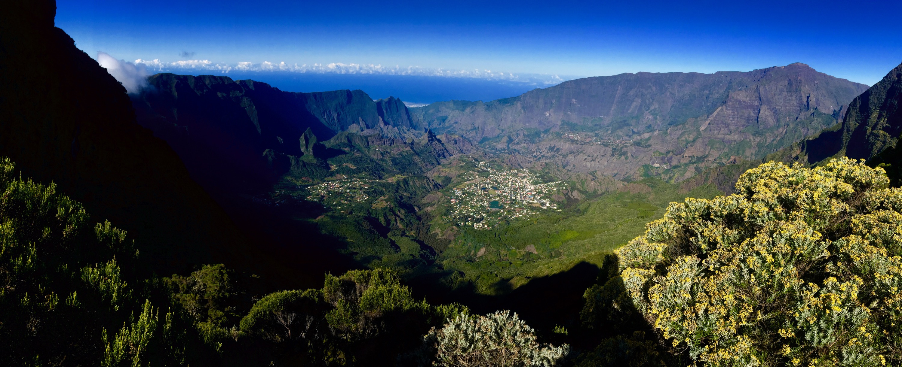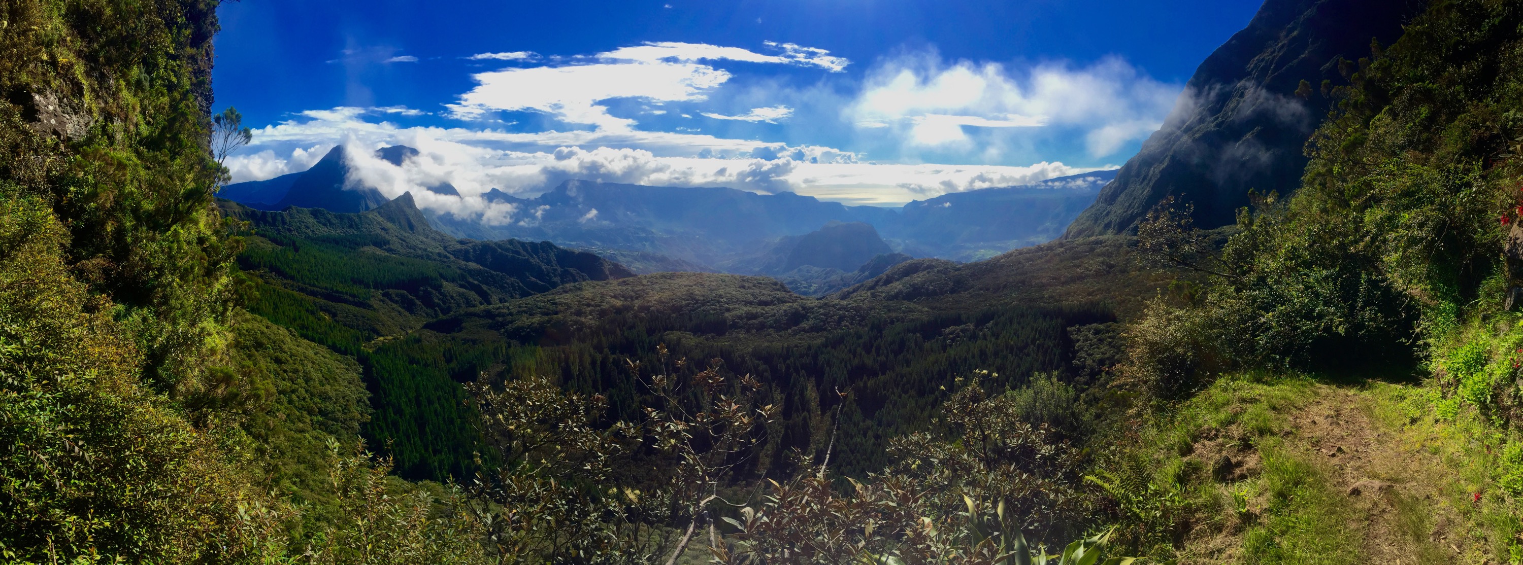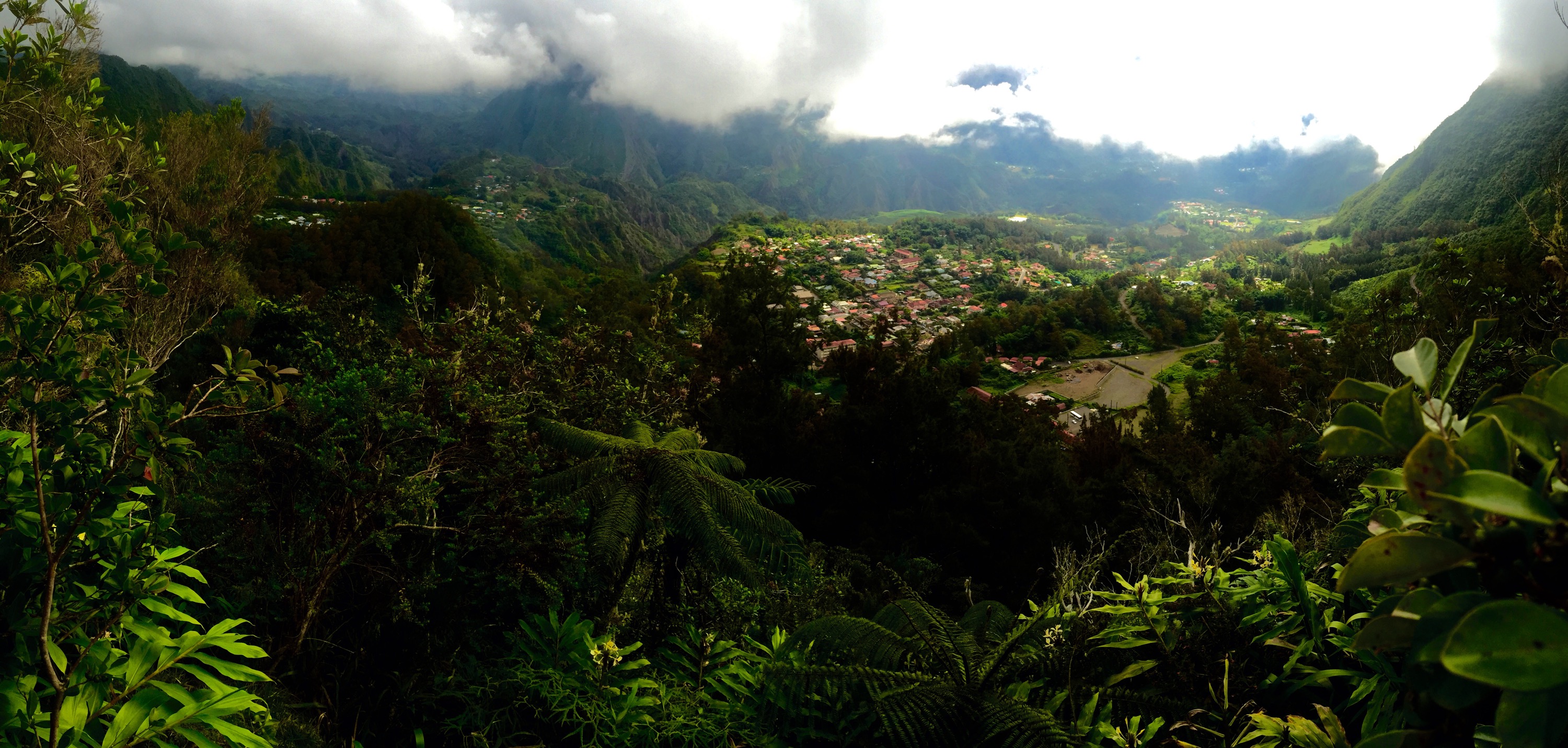 En moins de 2 heures, j’avais atteint le col (2000m). L’absence de nuage me permettait d’avoir une vue d’ensemble des 2 cirques… tout simplement sublime. D’un coté le cirque de Mafate avec sa végétation luxuriante et sa quasi absence de civilisation, et de l’autre le cirque de Salazie, tout aussi impressionnant mais avec des traces évidentes de civilisation ici et là.