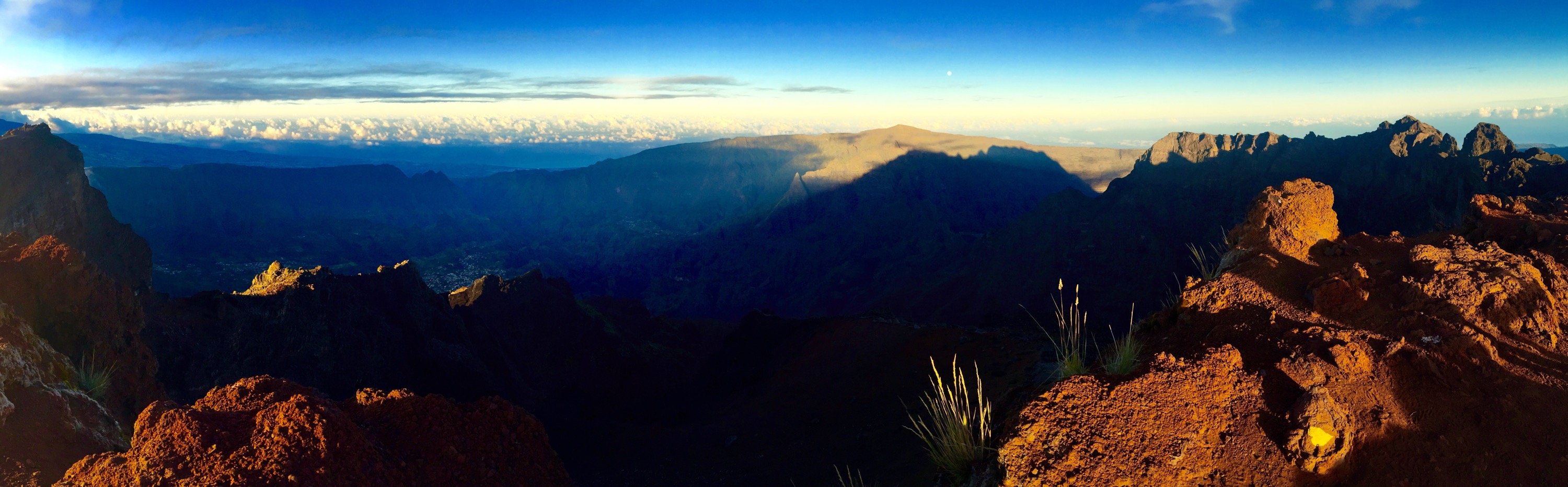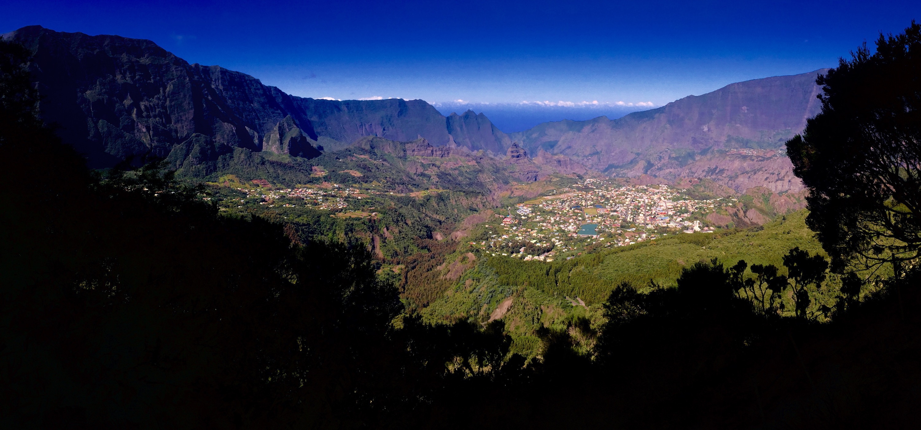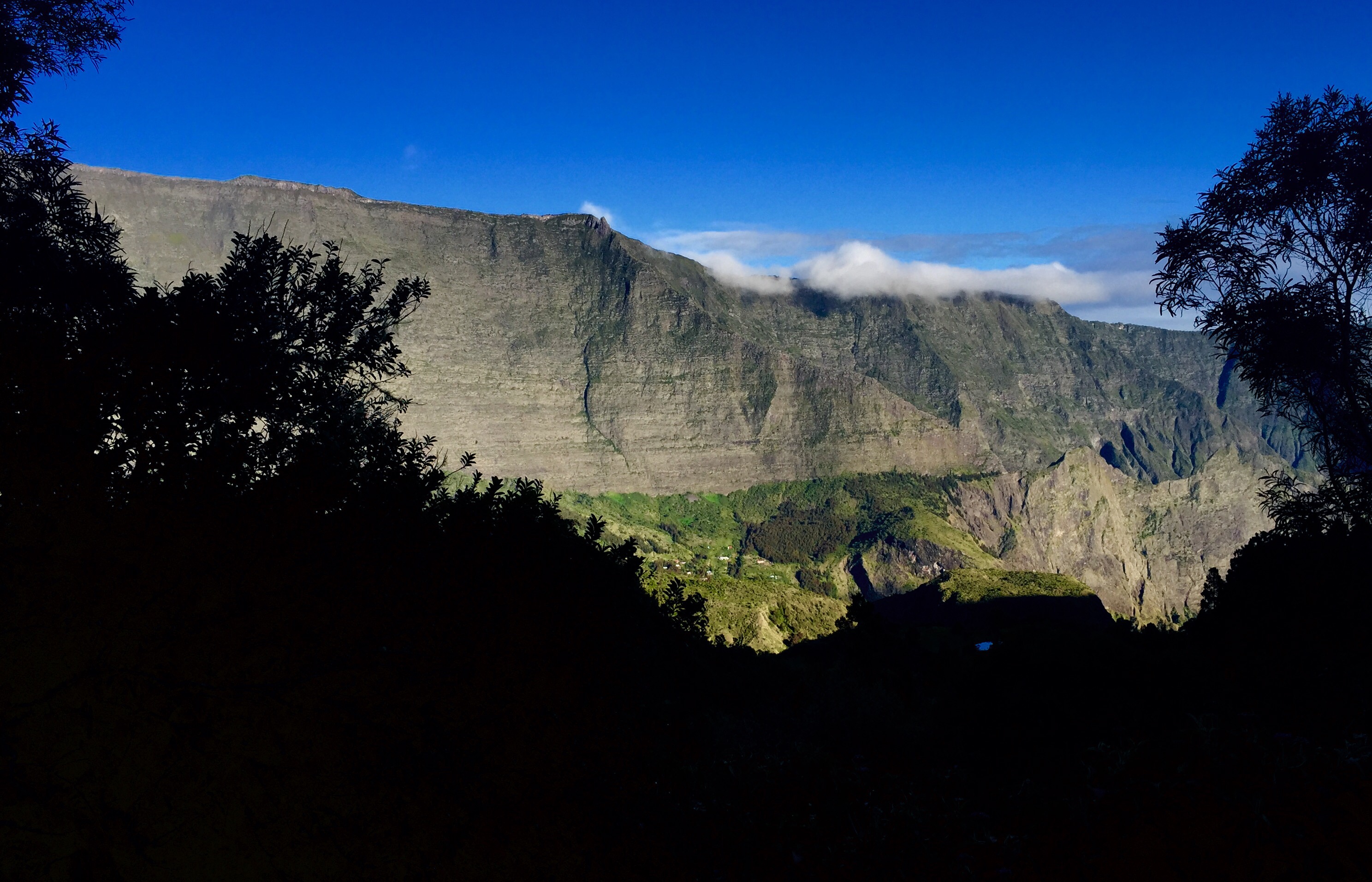 En moins de 2 heures, j’avais atteint le col (2000m). L’absence de nuage me permettait d’avoir une vue d’ensemble des 2 cirques… tout simplement sublime. D’un coté le cirque de Mafate avec sa végétation luxuriante et sa quasi absence de civilisation, et de l’autre le cirque de Salazie, tout aussi impressionnant mais avec des traces évidentes de civilisation ici et là.