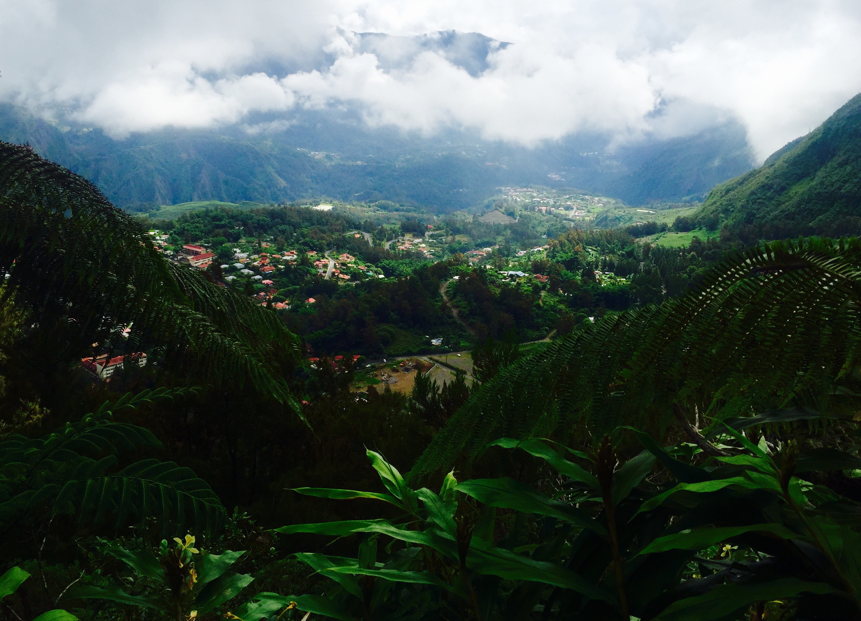 Après avoir négocié une route en lacets très serrés entre montagnes et falaises… les roues du bus passant à moins de 1m du vide à quelques reprises… chapeau conducteur… je me retrouvais à 1200m d’altitude dans le village de Cilaos. Cilaos, mot dérivé de la langue malgache signifiant « le pays qu’on ne quitte jamais »… et je comprenais très bien pourquoi on avait appelé l’endroit ainsi au premier coup d’oeil.