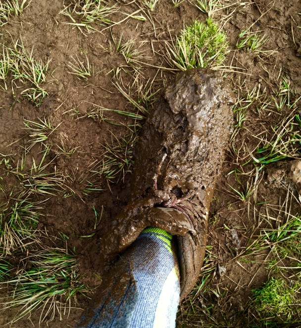 Je n’avais jamais vu ça. J’avançais à pas de tortue dans des champs de boue. Après un certain moment, j’arrêtais d’essayer d’éviter la boue… ça n’avait pas trop bien marché et je m’étais fait mal à marcher dans les buissons sur le coté. J’allais maintenant privilégier la méthode directe… je laverais mes jambes/bas/bottes plus tard…