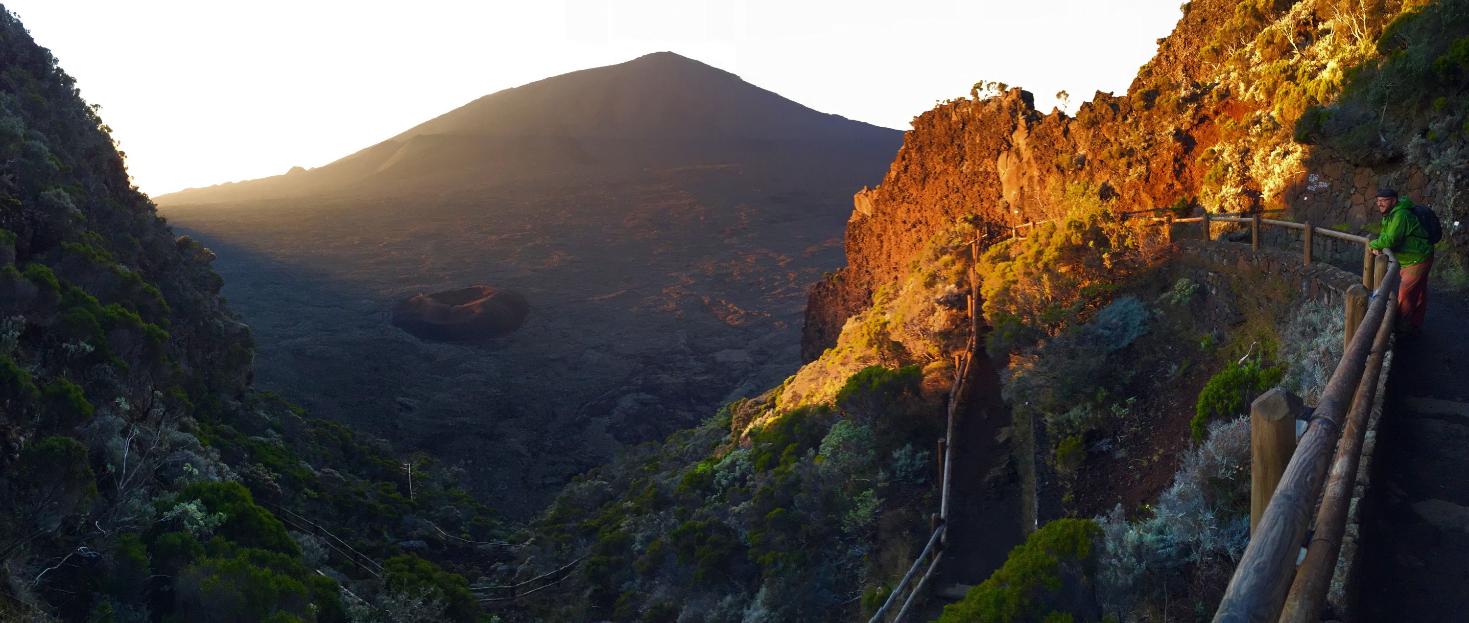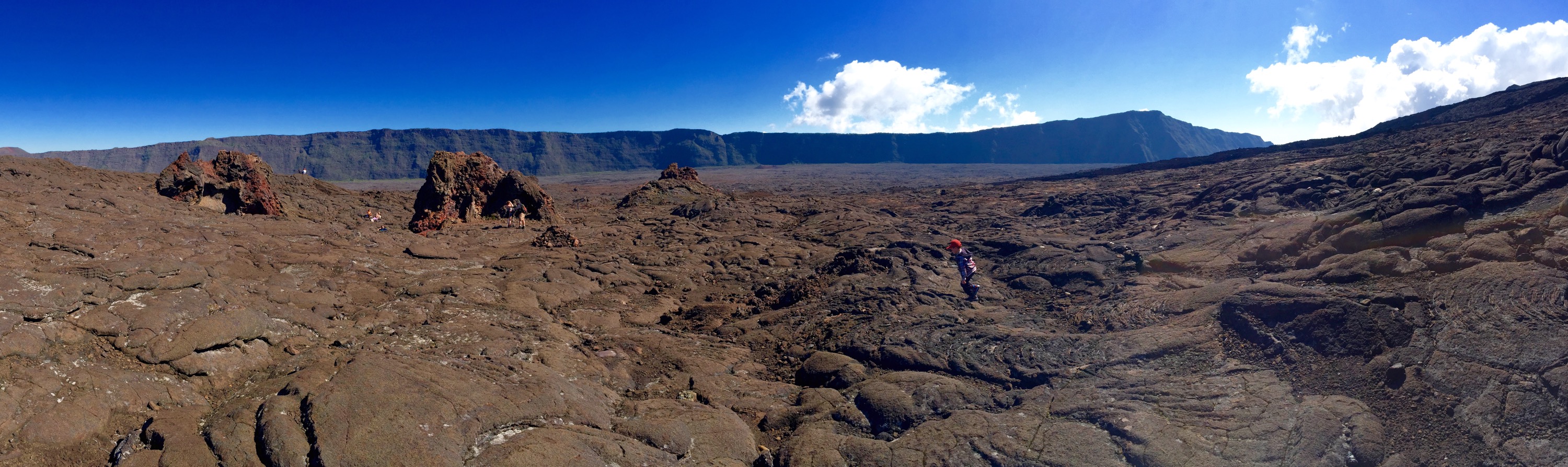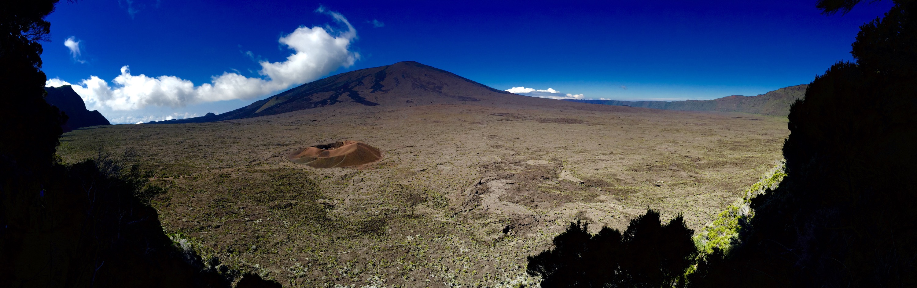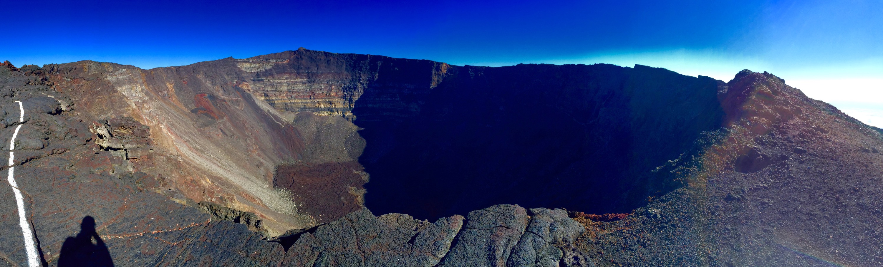 La dernière éruption majeure remonte à 2007. À ce moment là, le Piton était un cône presque parfait, le cratère Dolomieu n’étant qu’un tout petit trou. C’est alors que le volcan s’est effondré sur lui-même… le cratère devenant un gigantesque trou de 1000m de diamètre et 350m de profond… trou où je me trouvais juste à coté. Depuis, la lave a comblé 70m de profondeur. Les experts estiment que le Piton de la Fournaise sera à nouveau un cône dans 100 ou 200ans.