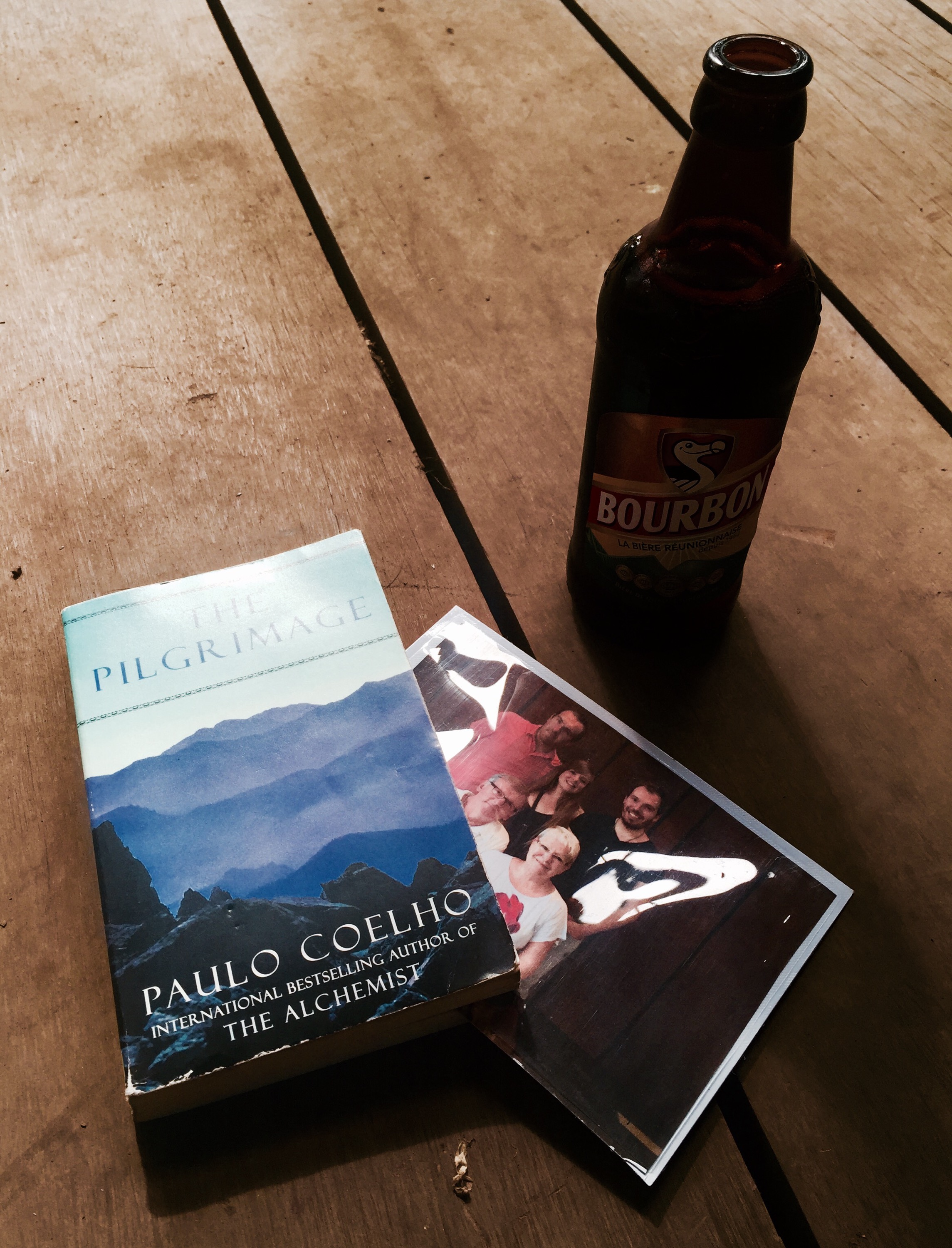 Trop de bandages dans mon kit médical… Out… 3 sous vêtements au lieu de 5… 1 seule paire de bas au lieu de 3… j’en entend déjà dire ouache… les bas ont 2 cotés non?!?… ça fait comme 2 paires de bas ;-)… imperméable?!? Même quand il ne pleut pas je suis détrempé de sueur… pourquoi je mettrait un imperméable quand il pleut… pour garder la sueur sur mes vêtements?!? Out… Le livre Lonely Planet La Réunion… allez hop je prenais quelques photos des pages importantes sur mon iphone… et puis Out… Mon livre « Le Pèlerinage » de Paulo Cuelho racontant son périple sur le Chemin de Compostelle… ahhh ça je le garde… au moins jusqu’à ce que je le finisse… ensuite Out.