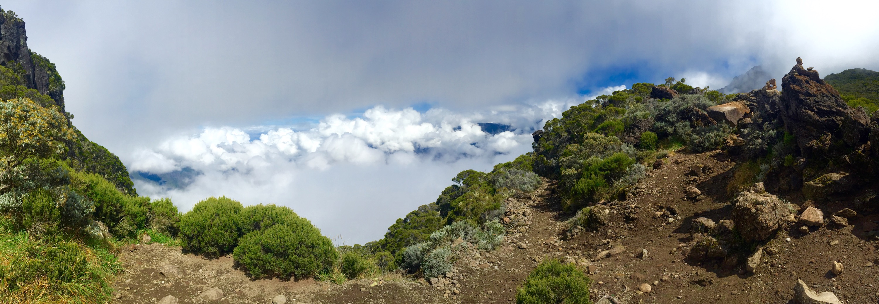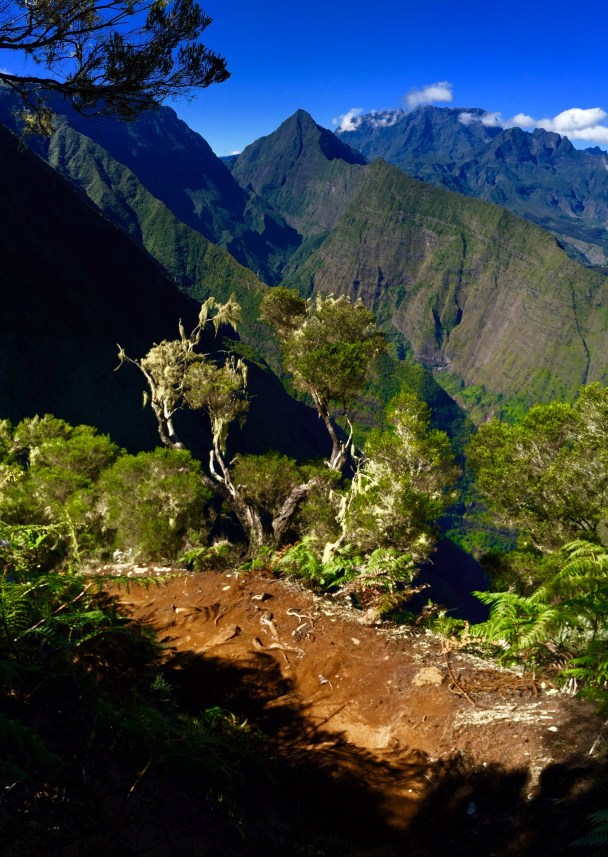 La jungle était devenue de moins en moins dense et le paysage s’ouvrait devant moi. Je me retrouvais à marcher sur l’étroite arrête sommitale du rempart rocheux ceinturant le Cirque de Mafate… immédiatement en contrebas sur ma gauche. Cette section de sentier ne pardonnait pas puisqu’un tout petit faux pas me mériterait un allé simple… et très rapide vers le fond du cirque plus de 1000m plus bas.