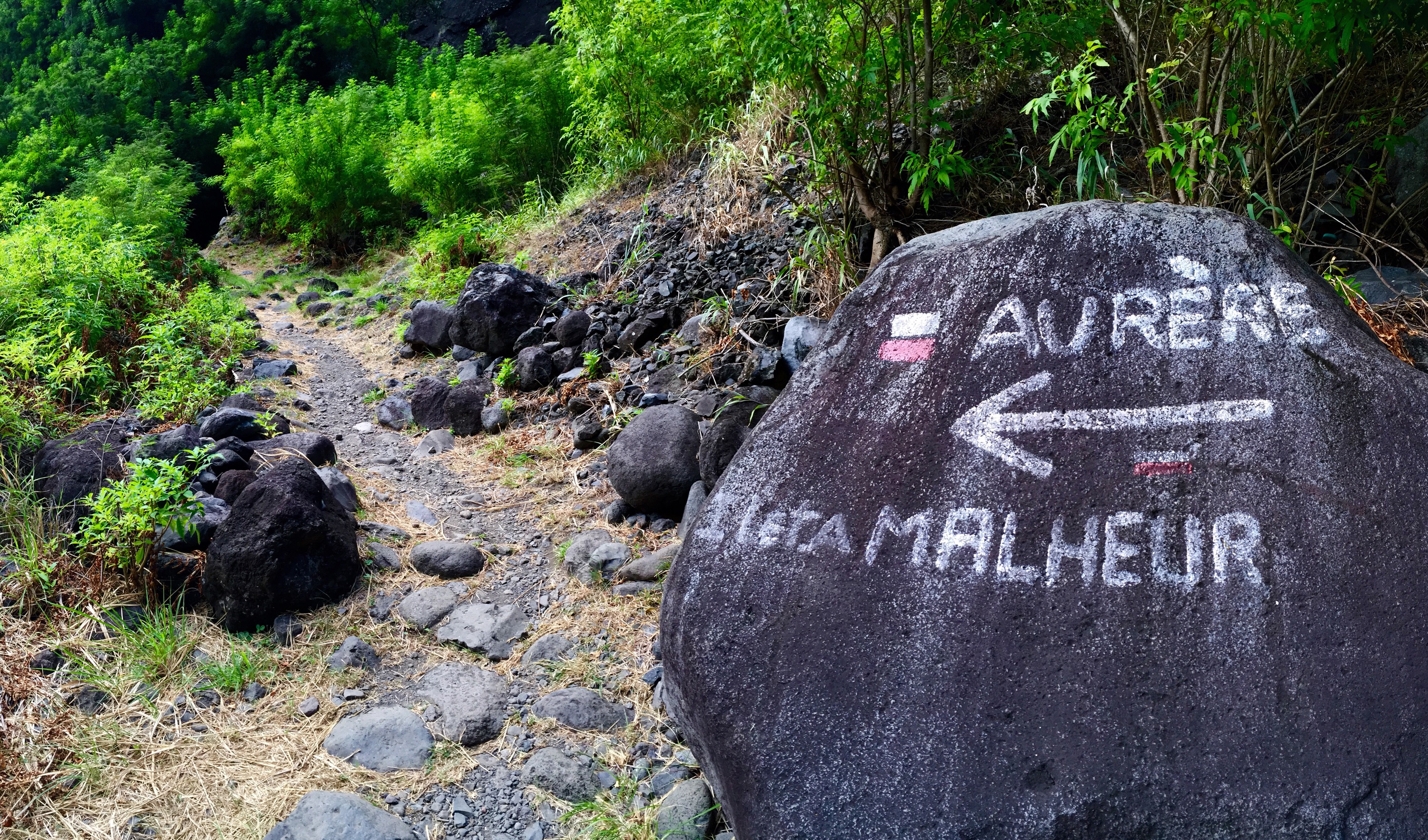 Pour seul guide dès maintenant, et jusqu’à l’autre bout de l’ile, les petits drapeaux du GR R2 (Grande Randonnée Réunion no.2), le numéro du sentier de la Grande Traversée, composés de 2 bandes horizontales; l’une blanche et l’autre rouge. Ceux-ci se trouvaient sur les arbres, roches, etc. dans les sentiers.