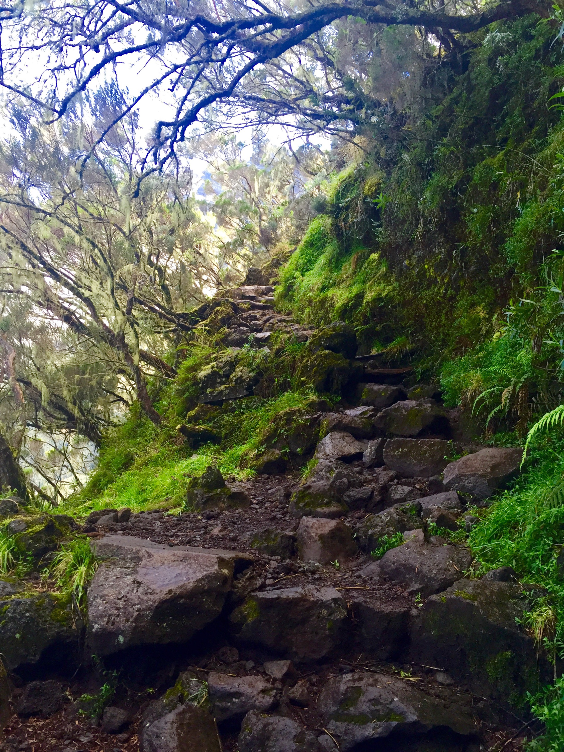 Je me retrouvais alors dans une forêt toute verte… même les troncs d’arbre étaient recouverts de lichen couleur vert radioactif. Il devait pleuvoir souvent ici. Le tout donnait à l’endroit des allures de forêt enchantée directement sortie d’un conte pour enfants. À ma plus grande surprise, j’y ai croisé une vingtaine de randonneurs qui montaient… quel réconfort de savoir que je n’étais pas le seul dans ce bourbier.