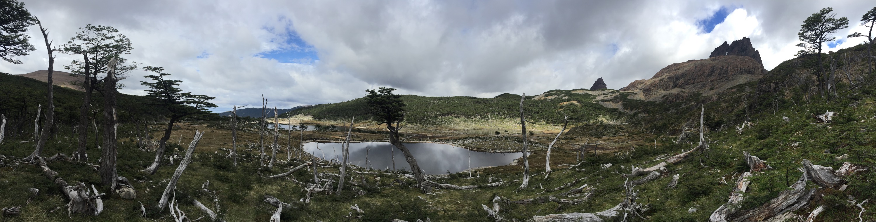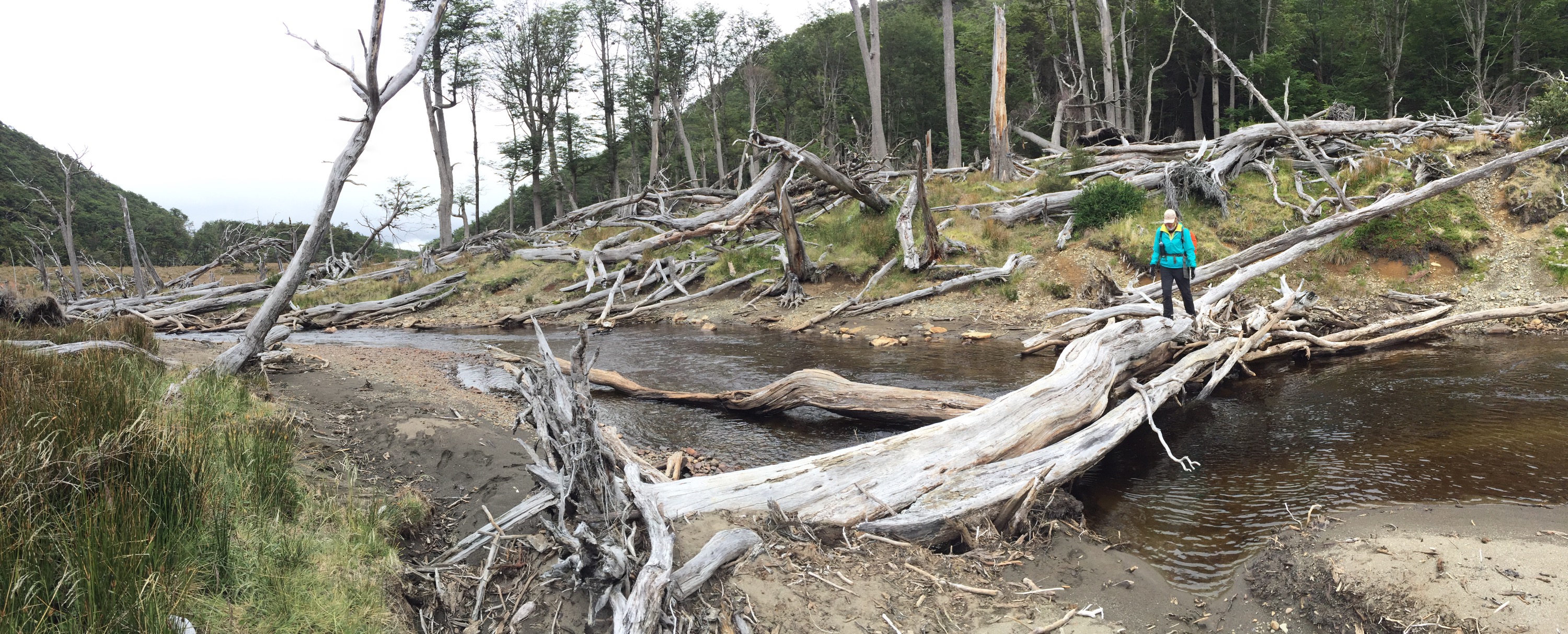 Après être descendu dans une vallée toute verte, nous pouvions apercevoir les ravages que les castors font sur l’écosystême de l’île. Introduit ici il y a moins d’un siècle (ils ont en faitvété introduit en Argentine… et ont nagé jusqu’à Isla Navarino), le castor canadien détruit des forêts, bloque des rivières et se reproduit en quantité industrielle (aucun prédateur sur l’ile).