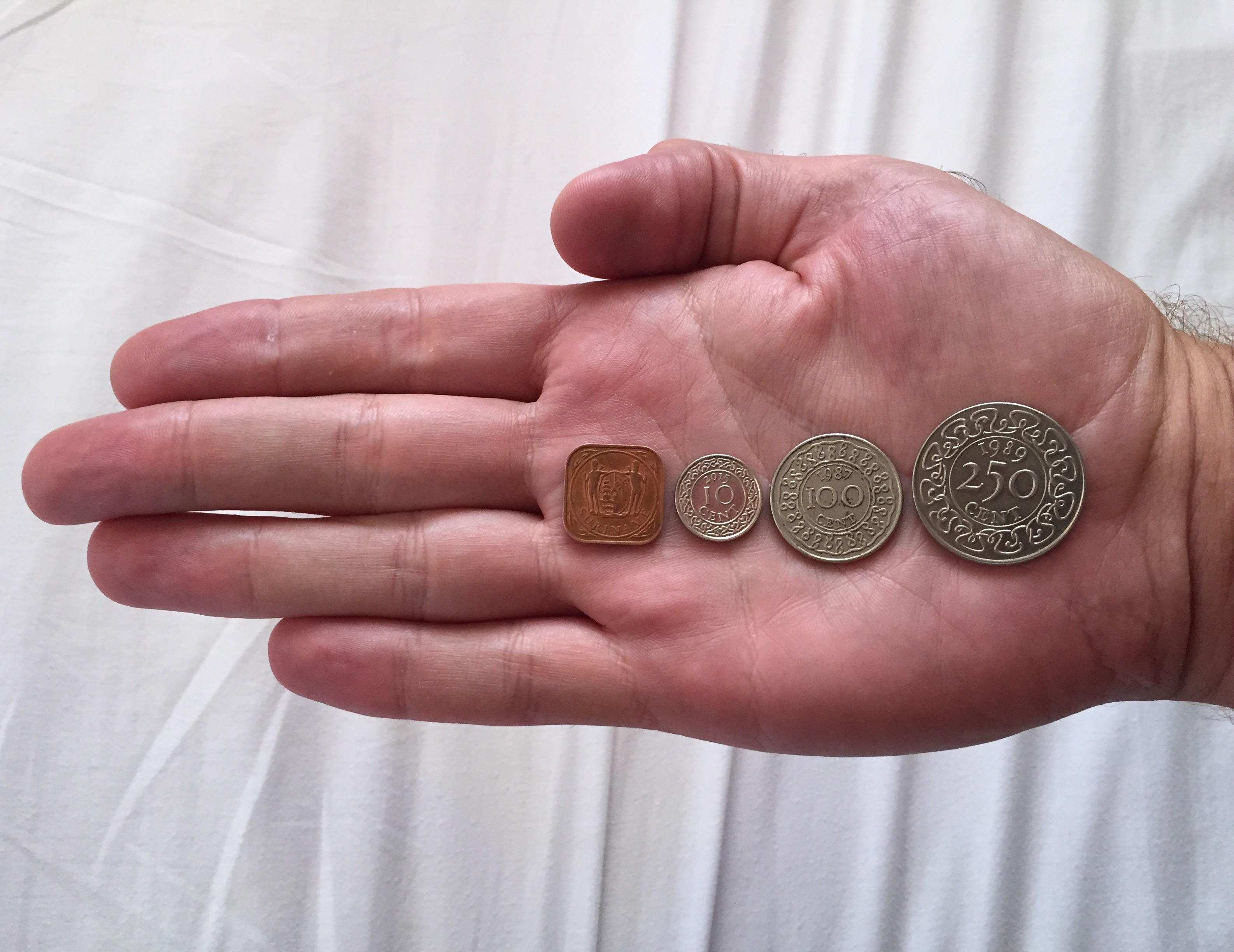 La monnaie est le $ surinamais. Ceux qui ont créé cette devise en avaient fumé du bon. On retrouve un pièce de 5cent carré, un 10cent minuscule, un 100cent (au lieu de 1$) et ma favorite, une pièce de 250cent (2.5$?!?).