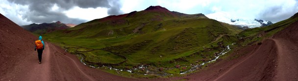 Le sentier passait alors par une vallée aux couleurs toutes aussi contrastantes que surprenantes; un versant de vallée tout rouge (sable), le fond de la vallée vert radioactif (végétation), avec le glacier (tout blanc) en arrière plan.