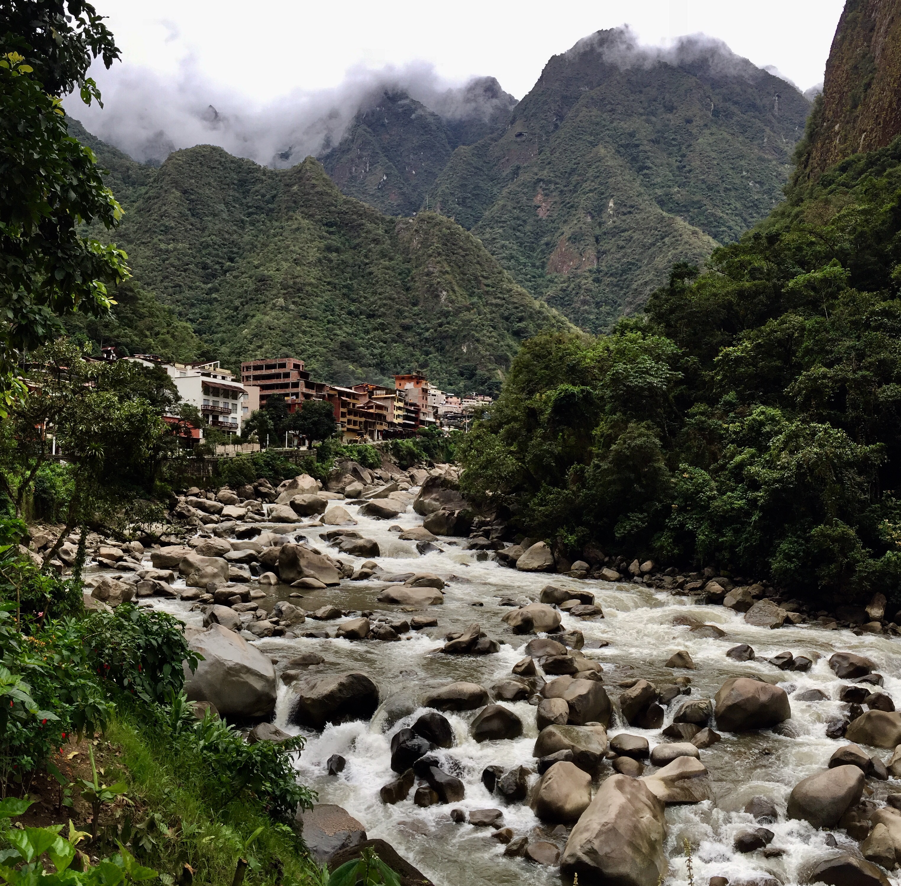 Au bout de 2 heures de marche, le chemin de fer nous avait guidé jusqu’à « Aguas Calientes », un ramassis d’hôtels et de restaurants se donnant des airs (ratés) de village suisse…