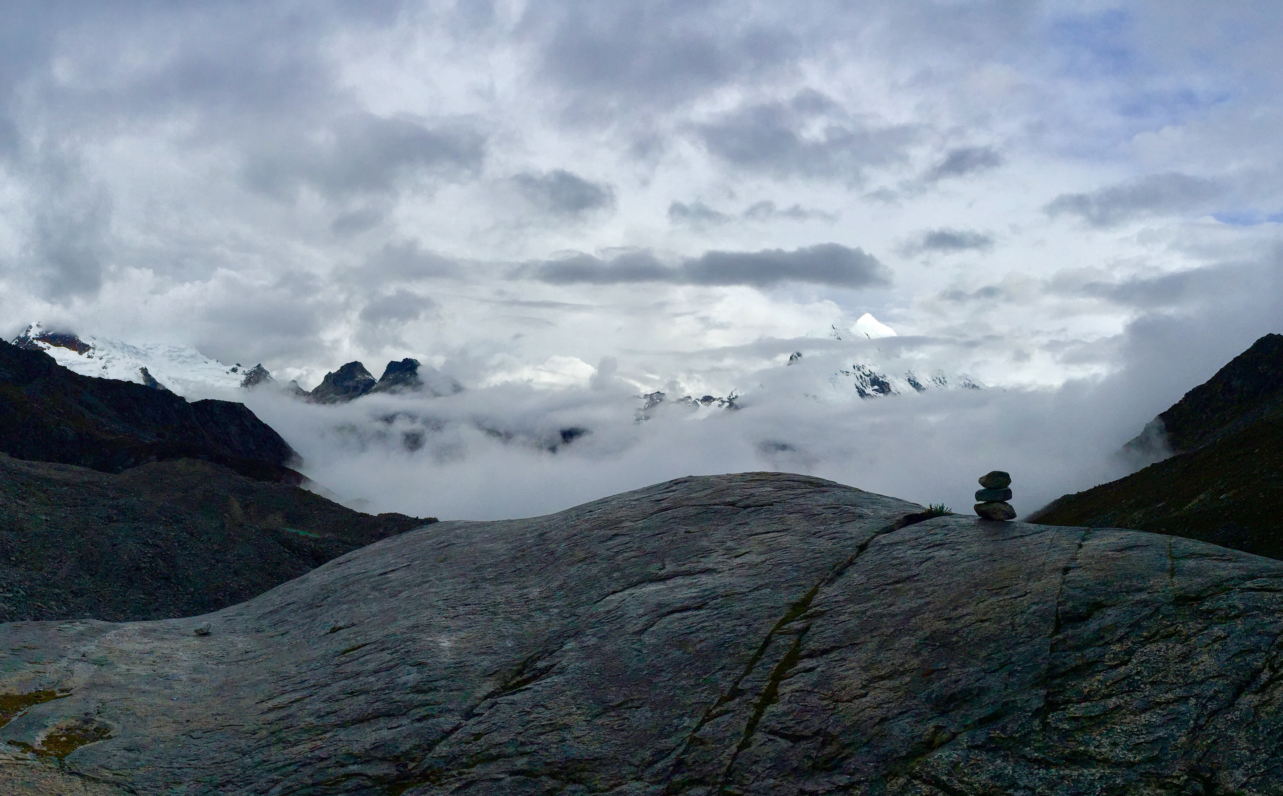 Après avoir joué au chat et à la souris avec le brouillard et la pluie tout au long de l’ascension, nous arrivions sur un plateau complètement dégagé. Devant nos yeux se trouvait un champ de roche (avant plan) et 2 hauts sommets et leur glacier respectif (Nevado Huandoy @6000m & Nevado Pisco @5752m).