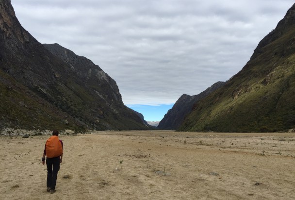Tout de suite après avoir croisé Alpamayo, le sentier descendait dans le fond de la vallée. Nous en étions quitte pour marcher dans l’immense lit d’une rivière asséché.