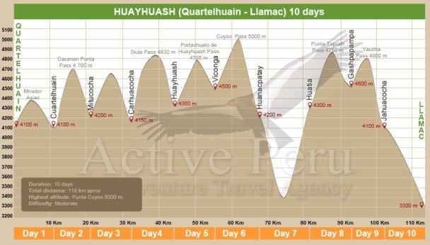 D’une longueur d’environ 120km, avec 8 Cols à plus de 4600m, dont 2 supérieurs à 5000m, le Circuit Huayhuash est classé « Difficile » dans le monde de la randonnée.