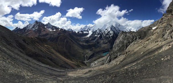 Paso Qaqanan (@4700m), offrait une vue d’ensemble des environs; la vallée que nous quittions était rocheuse et étroite, tandis que celle dans laquelle nous basculions était toute verte et ouverte. À l’horizon, une mer de sommets se dressaient devant nous.