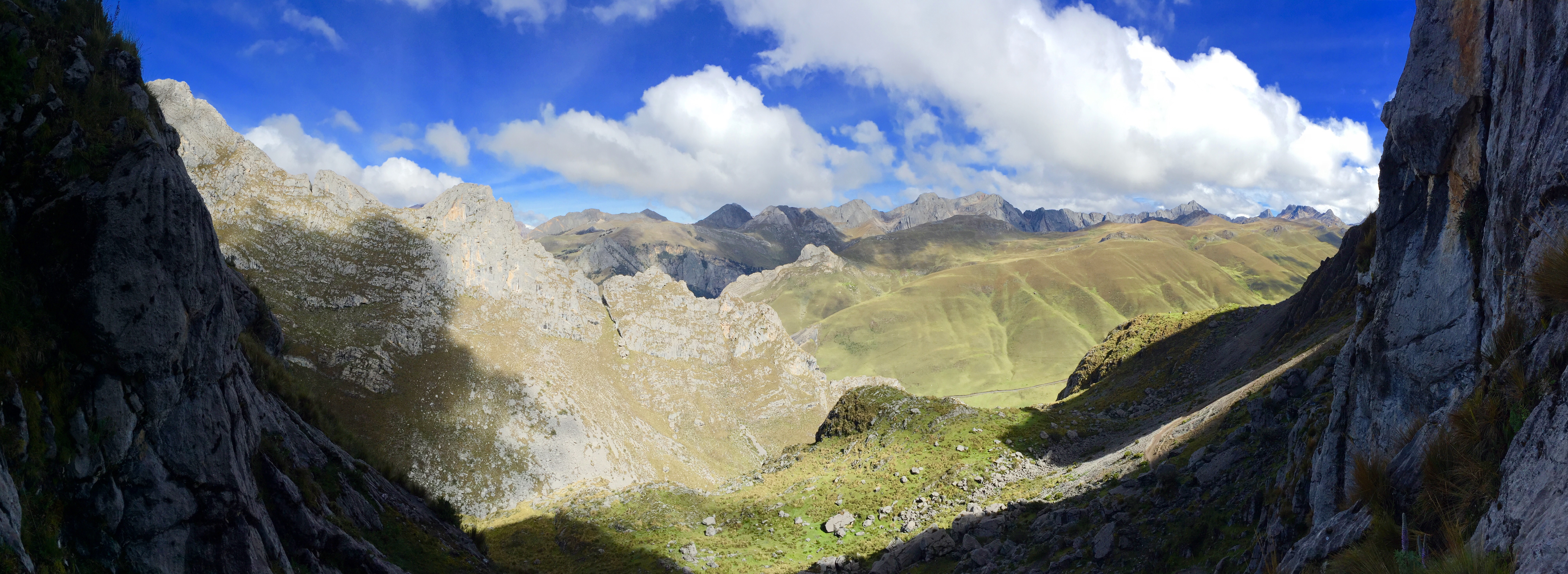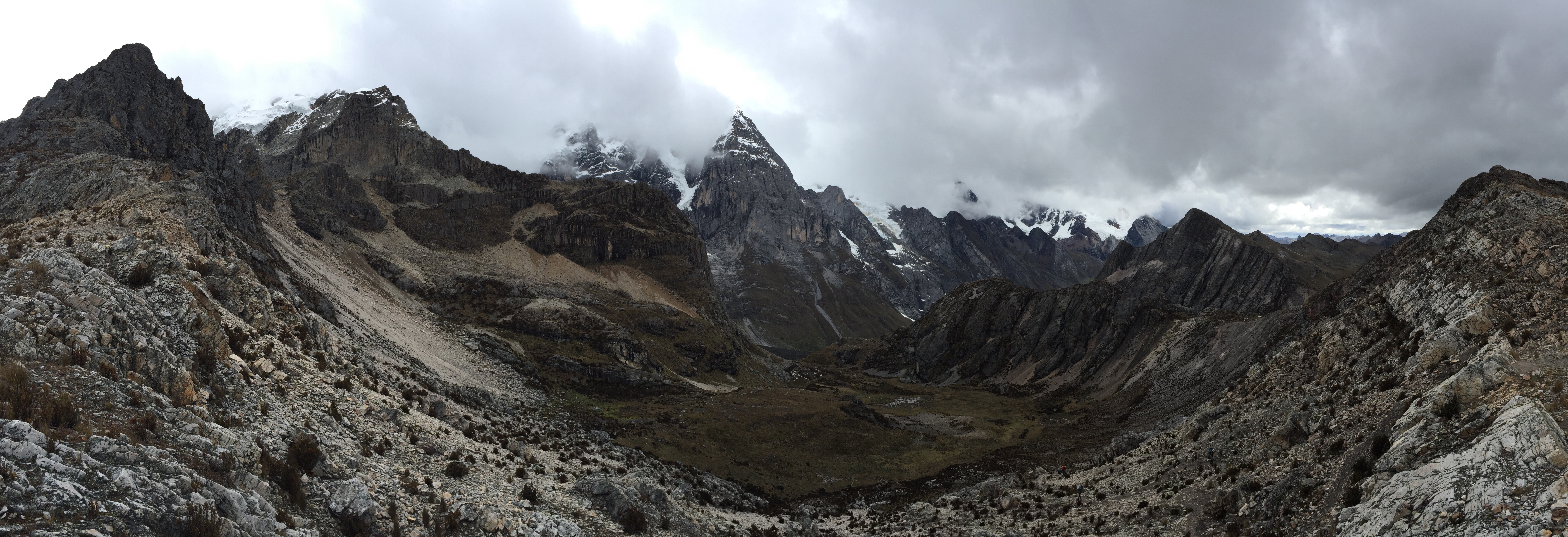 Paso Qaqanan (@4700m), offrait une vue d’ensemble des environs; la vallée que nous quittions était rocheuse et étroite, tandis que celle dans laquelle nous basculions était toute verte et ouverte. À l’horizon, une mer de sommets se dressaient devant nous.