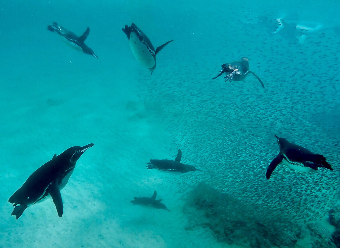 Le clous de la journée fut sans aucun doute de nager pendant avec une douzaine de penguins. Ceux-ci pourchassaient un banc de petits poissons. Ajoutez en prime qu’une demi-douzaine de pélicans plongeaient dans l’eau tels des kamikazes pour attraper ces mêmes petits poissons.