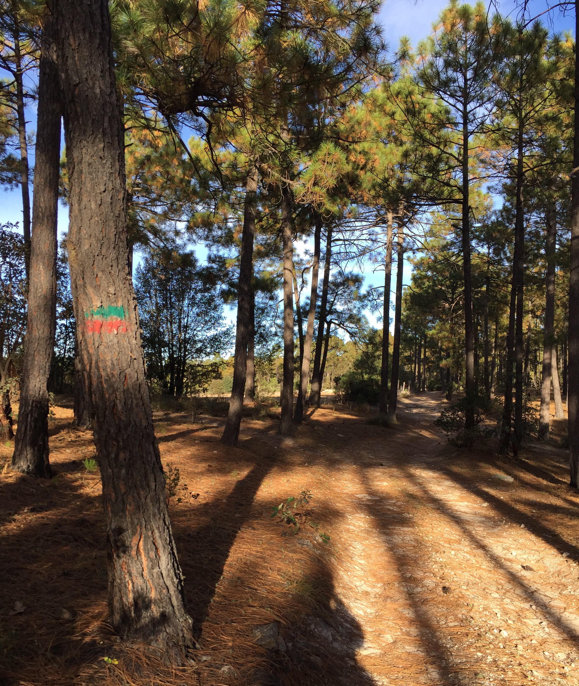 Le sentier passait au travers de collines labyrinthiques recouvertes de pins. À mon plus grand plaisir, le sentier était marqué de 2 bandes horizontales; l’une verte, l’autre rouge.