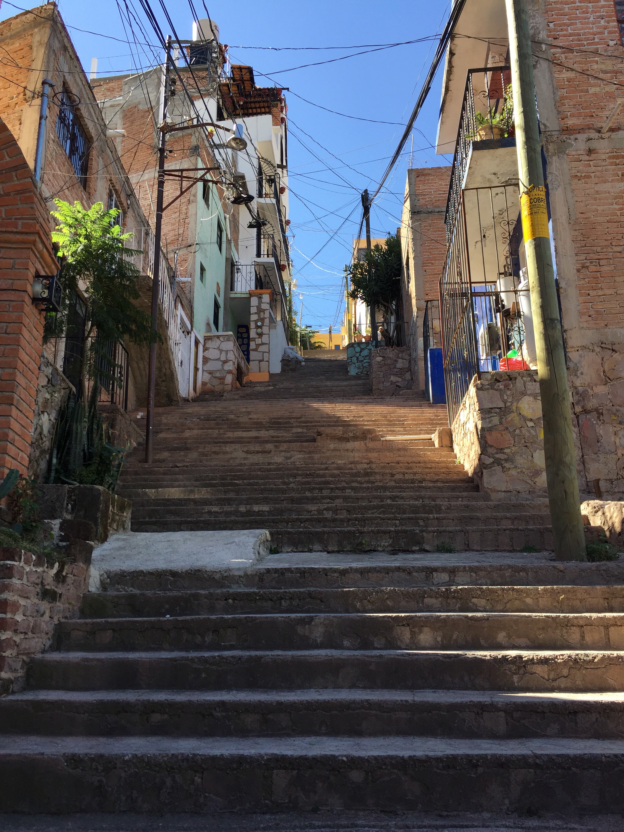 De nos jours, Guanajuato est un jeu de Serpents et Échelles grandeur nature; vous êtes constamment à monter ou descendre, en utilisant les innombrables escaliers (escarpés) et tunnels (sombres), pour vous frayer un chemin dans un labyrinthe de rues sinueuses partant dans tous les sens. Qui sait sur quoi vous allez déboucher; un parc, une église, un autre escalier.