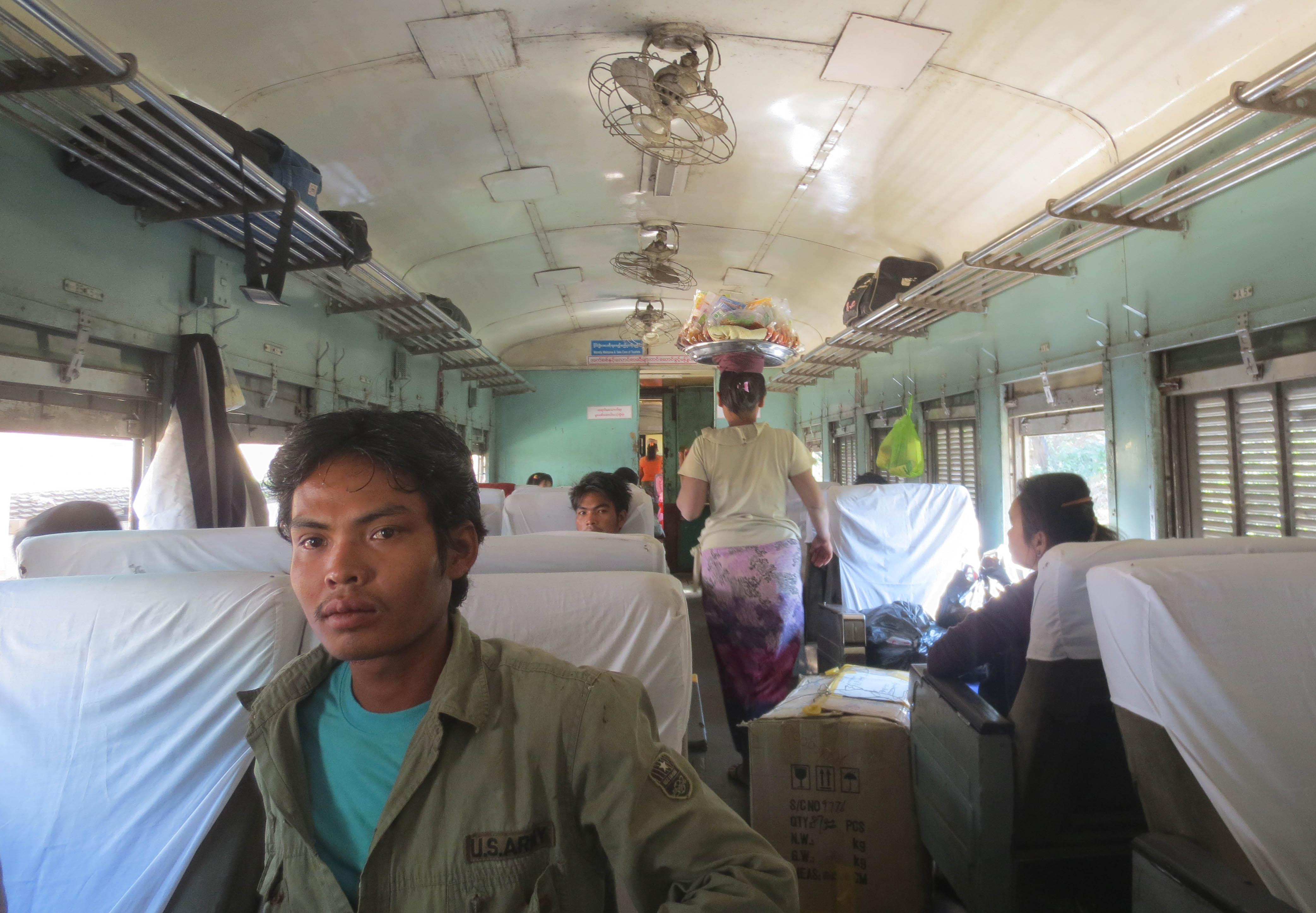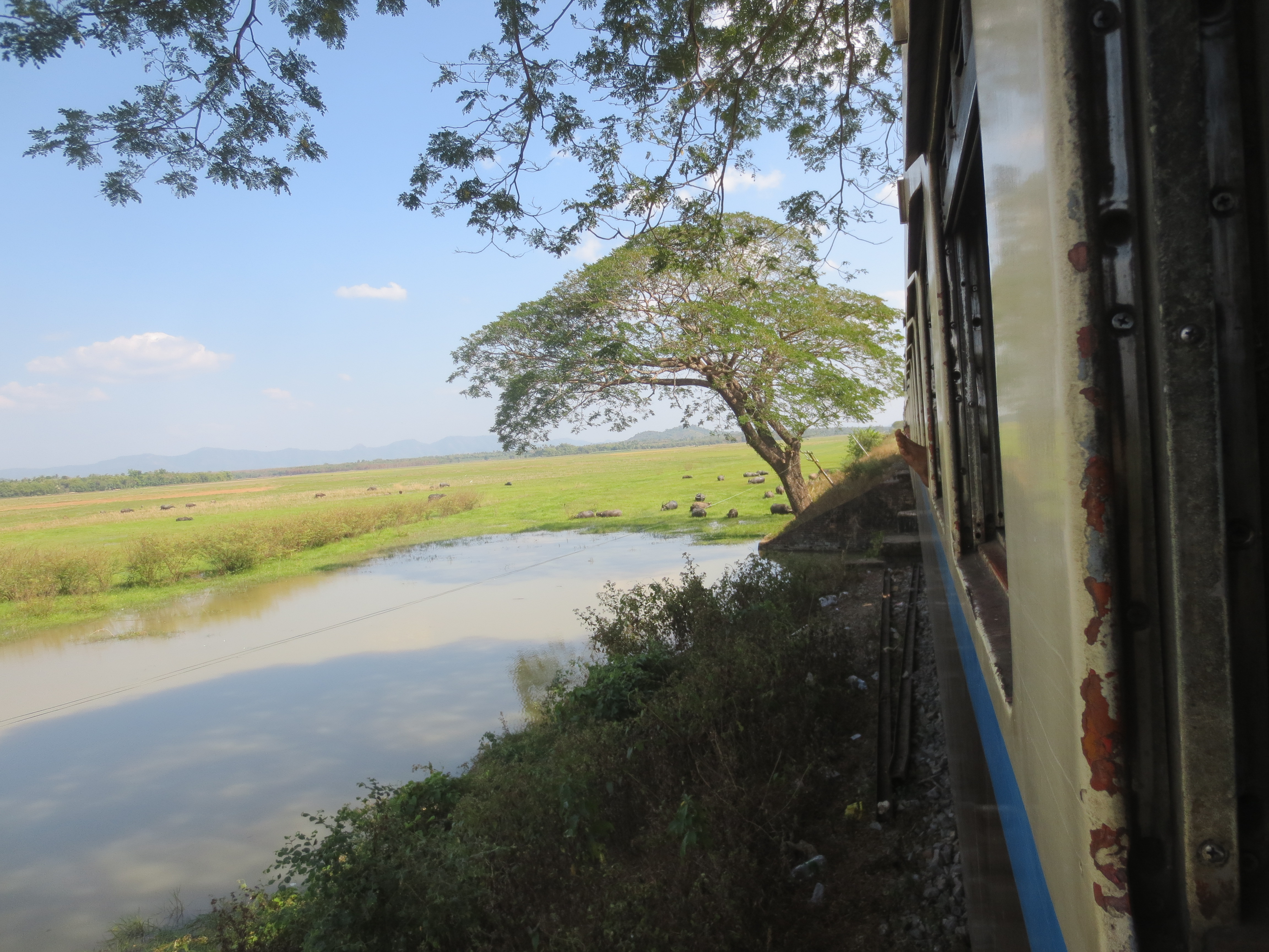 2.00pm – C’est avec le chandail imprégné de sueur, le cœur qui essayait tant bien que mal de reprendre un rythme normal et un Visa Birman fraichement stampé dans mon passeport que j’étais INconfortablement assis dans un train à regarder Bangkok disparaitre derrière moi…