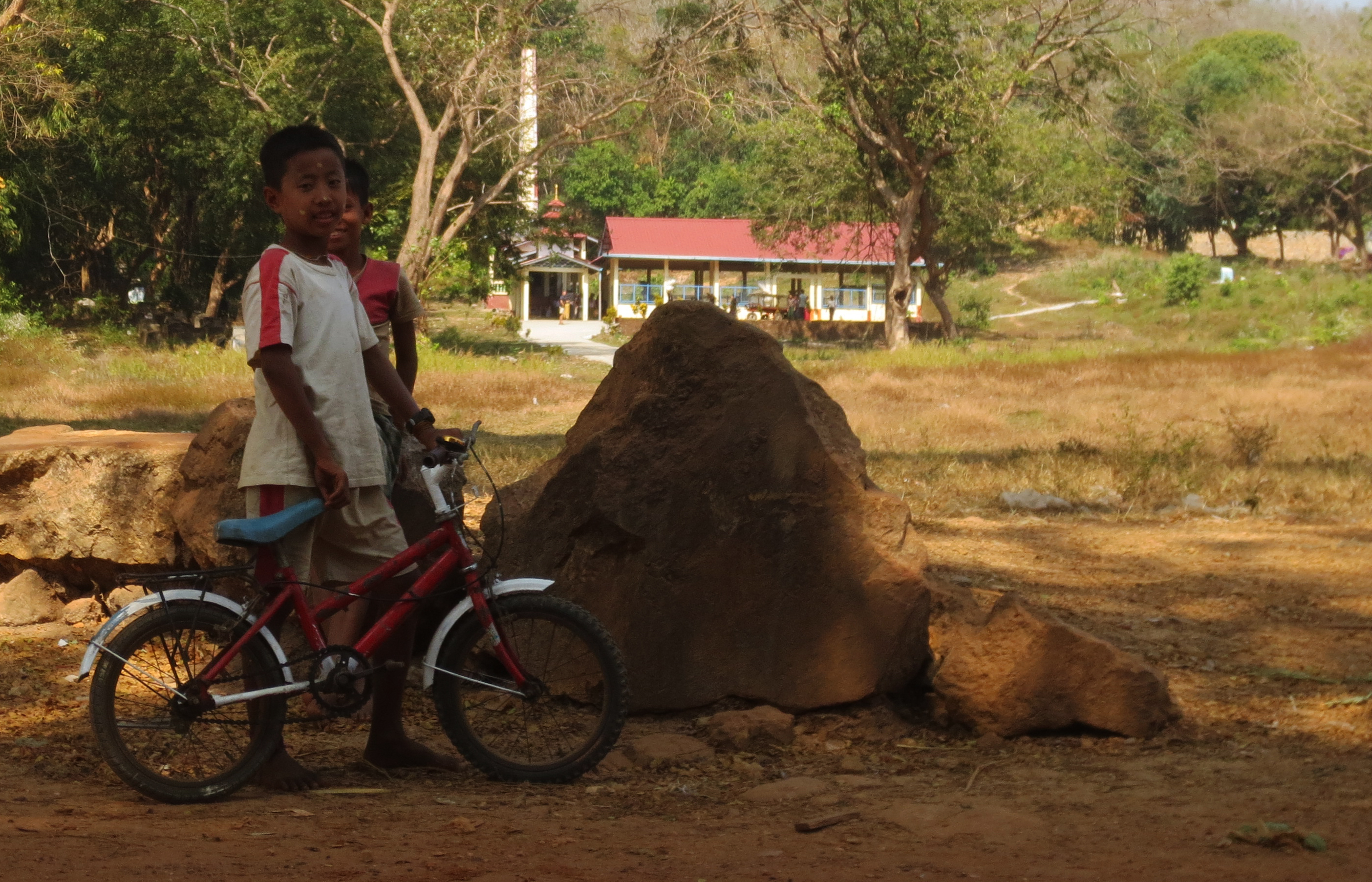 1er arrêt, l’école du village. Situé au sommet d’une petite colline, j’y suis monté alors que la cloche de la fin des cours venait de sonner et que la plupart des jeunes étaient à dévaler la colline pour rentrer à la maison. Ma simple présence a failli causer quelques accidents alors que certains stoppaient net sec lorsqu’ils m’apercevaient… en manquant se péter la marboulette. Ils semblaient avoir de la misère à concevoir qu’un blanc puisse se promener tout seul dans leur village… ce qui est assez compréhensif. Une fois à l’école, je me suis aperçu qu’une colline me bloquait la vue… j’ai donc continué ma quête.